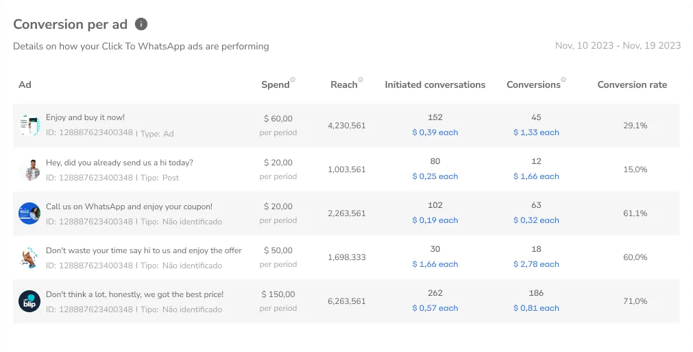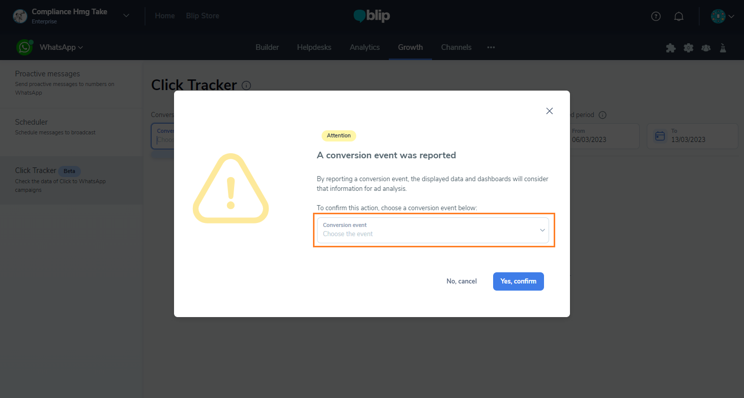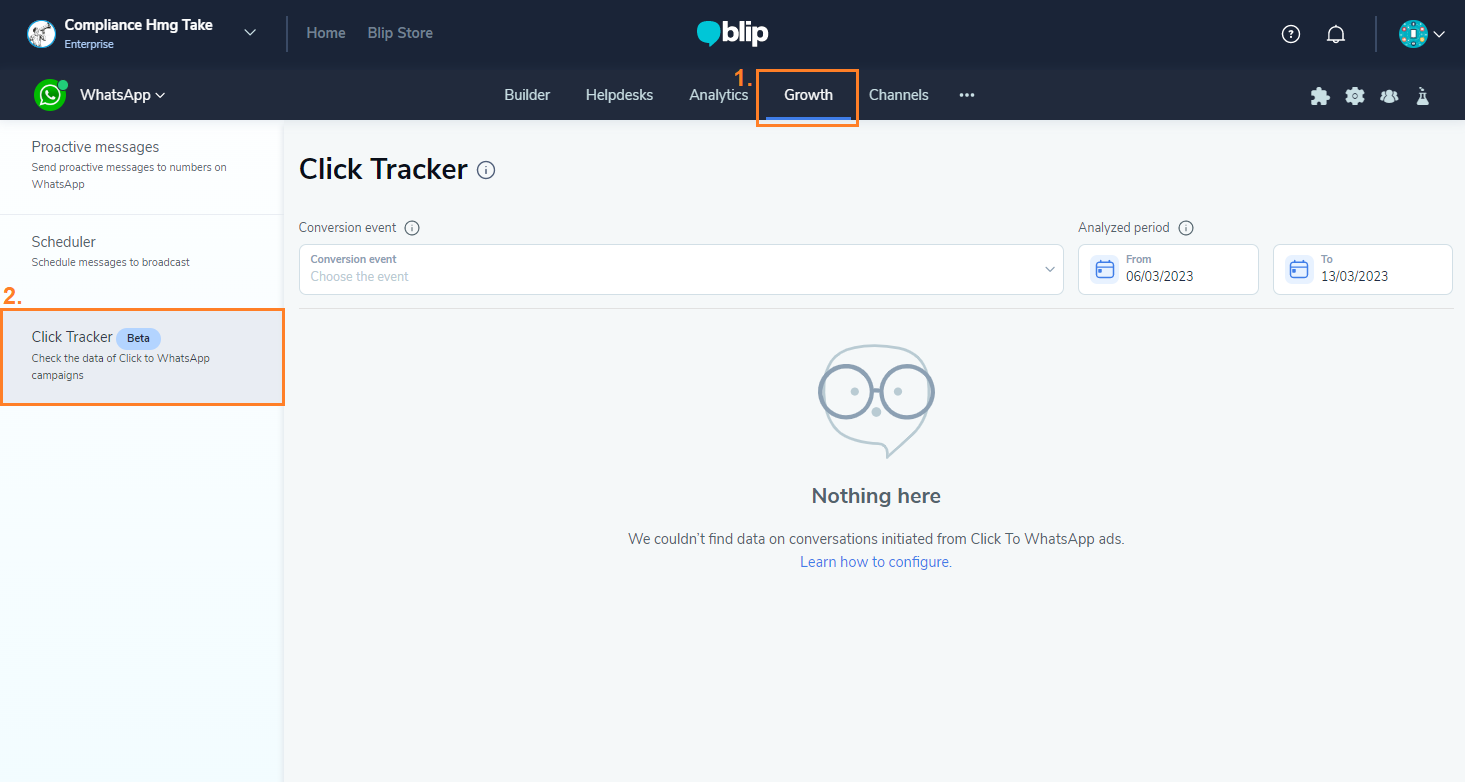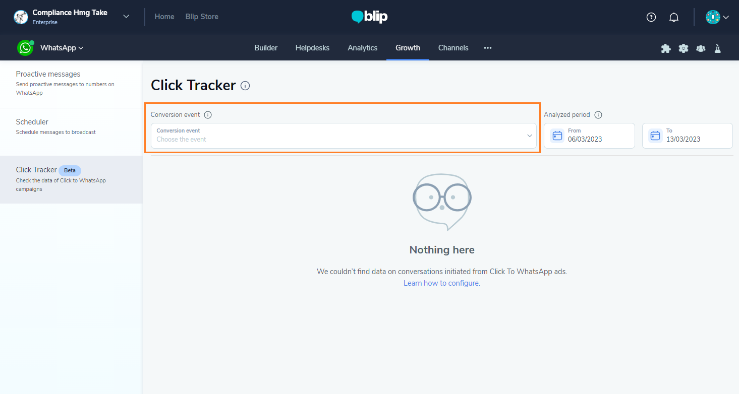 How to use Click Tracker to determine which Click to WhatsApp ad is best for your business. March 11, 2026 20:06 Updated Index: What is Click to WhatsApp and how can it help your business? What is Click Tracker? How to access Click Tracker How to set the conversion point with Click Tracker To integrate the Click Tracker with the Marketing API How to track the performance of your ads with Click Tracker How conversions are counted by Click Tracker Rules for Data Analysis in Click Tracker Learn in this step-by-step tutorial how to set up the Click Tracker on your bot. With this functionality, you can analyze the journey of your users from the Click To WhatsApp ads in the conversational flow, understand the performance of each of your communications, and thereby better direct your media investments, optimizing lead acquisition and user conversion on WhatsApp. What is Click to WhatsApp and how can it help your business?Click To WhatsApp is a WhatsApp feature that allows linking Facebook and Instagram ads with the company's WhatsApp number. In other words, when users from both social networks browse the website or app, they can click on an ad and be taken directly to chat with the company.Click To WhatsApp ads are an excellent option for brands to shorten the customer journey. With these ads, it becomes much easier for customers to discover that they can connect with the company via WhatsApp, enhancing retention, engagement, and creating value through conversations.For more details on how to create a Click To WhatsApp ad, click here.What is Click Tracker?With the Click Tracker, you can analyze the journey of your users from Click To WhatsApp ads in the conversational flow. By understanding the performance of each of your communications, you can better direct your media investments, optimizing lead acquisition and user conversion on WhatsApp.The Click Tracker automatically collects user interaction data with the ads and generates personalized performance analyses for you, taking into account the specificities of your intelligent contact and what your brand defines as the conversion point.Moreover, with integration into Meta's Marketing API, the Click Tracker enhances your analyses and allows you to understand the cost of your ads, initiated conversations, and generated conversions. This empowers you to make smarter decisions to boost your business.How to access Click TrackerTo access the Click Tracker and find the performance analyses of your Click To WhatsApp ads, click on the GROWTH tab and choose the CLICK TRACKER option in the left-hand side menu. How to set the conversion point with Click TrackerIn order for you to analyze the performance and impact generated by your Click To WhatsApp campaigns, it is necessary to understand how many conversations initiated from the ads reach the conversion point of your intelligent contact.As Blip allows you to create highly personalized intelligent contacts, it is necessary to inform the chatbot's conversion point, defined by the category of an event record.On the Click Tracker screen, at the top, you will find a field to select and define an event record category as the conversion point.After clicking on the selection field, you will see a modal on the screen indicating the criticality of this action. The definition of this conversion event is crucial for calculating the conversions of your users who clicked on Click To WhatsApp ads and reached the conversion point defined by the selected event.Choose among the available event record categories the one that maps the user's passage through the conversion point of your intelligent contact. In other words, choose the event record that indicates that your user has achieved the SUCCESS POINT or the GOAL of your intelligent contact.After confirming your choice, Blip will start counting the conversions of your Click To WhatsApp ads considering the selected event record. Data prior to the selection of the conversion event will not be counted as ad conversions.You can edit the selected conversion event. Just click on the name of the current event record, and a modal will open for you to choose a new event record category. The total conversions will be calculated by summing up the conversions counted with the previous event records and the current one. In other words, conversions counted considering previous event records will not be lost.For more details on how to create an event record in your Smart Contact, click here. To integrate the Click Tracker with the Marketing APIFor you to understand the return generated by your Click To WhatsApp ads, it is necessary to measure the investment made for distributing your ads on social media and how it reflects in the costs of initiated conversations and conversions in the conversational flow.The ad investment data is imported from Meta's Marketing API, and to access this data directly in the Click Tracker, you will need to share a read token of this data with Blip.To integrate the Click Tracker with the Marketing API, click on "Connect Token" to open the modal for connecting the access token.In the modal, enter the Token generated through Facebook Developers in the indicated field.This token allows Blip to read the data related to your ads, but it does not grant Blip the permission to manage your ad account. In other words, you retain full autonomy to manage your campaigns and marketing strategies.For information on how to generate the access token for the Marketing API, click here. How to track the performance of your ads with Click TrackerWith the Click Tracker, you can monitor the performance of each of your Click To WhatsApp ads by analyzing their reach on social media, the total number of conversations initiated from each ad, and the total conversions generated from these conversations. Additionally, you can compare the investment made for distributing the ads on social media and the average cost of each initiated conversation and conversion.On the Click Tracker sc