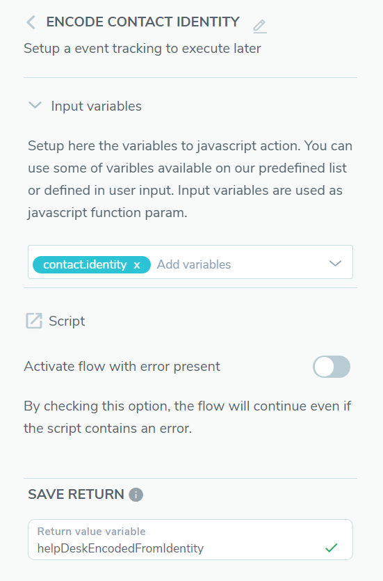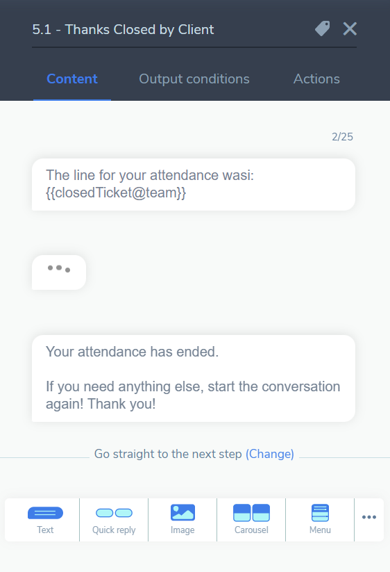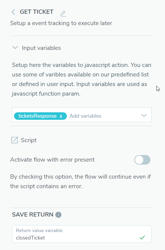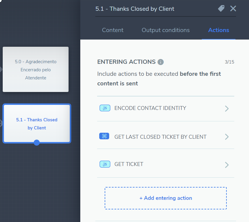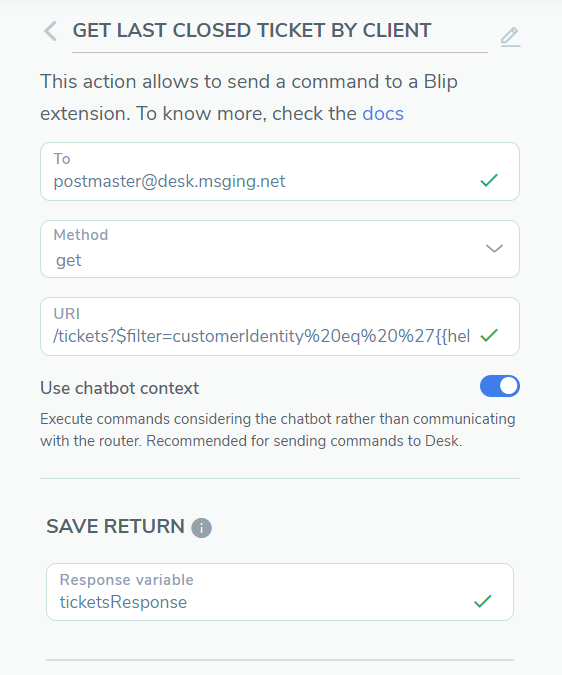 How to get a dated ticket by fluxo do bot May 02, 2023 13:23 Updated Index: Entry Actions Encode the contact identity Command to get the ticket Script to retrieve command response ticket Use variable From this tutorial, it will be possible to obtain the last dated ticket of the client from the flow of the bot, giving greater possibilities to the configuration of the flow. Entry Actions As a suggestion, in a block after the flow of the human service cashier, customize the entry modes to obtain the last customer ticket Encode the contact identity To make it possible to use the contact identity in the ticket filter from the url, it is necessary to add an Execute Script stage that has as Input Variable the contact.identity variable and Save Return in a variable such as helpDeskEncodedFromIdentity. Do not enter the Script, insert the following code: Script: function run(identity) { return (identity !== undefined) ? encodeURIComponent(identity) : identity;} Command to get the ticket To obtain the ticket, it is necessary to add a Process Command stage for the Desk, saving the response in a variable such as ticketsResponse and marking the use of the chatbot context. To: postmaster@desk.msging.net Method: get URI: /tickets?$filter=customerIdentity%20eq%20%27{{helpDeskEncodedFromIdentity}}%27%20and%20%28status%20eq%20%27ClosedClient%27%20or%20status%20eq%20%27ClosedAttendant%27%20or %20status%20eq%20%27ClosedClientInactivity%27%29&$skip=0&$take=1 Response Variable: ticketsResponse Also about the processing, to avoid errors, it is recommended to add a conditional for the execution of the command, as in the example below: Script to retrieve command response ticket After finishing obtaining the ticket, it will be necessary to treat the return to save in a variable only the required ticket. For isso, just add an Execute Script stage with the input variable ticketsResponse and Save Return in a variable like closedTicket. No body do Script add the following code: Script: function run(tickets) { var response = JSON.parse(tickets); var ticketExists = (response && response.resource && response.resource.items && response.resource.items.length > 0) if (ticketExists) { return response.resource.items[0]; }} Use variable Now the variable closedTicket can be used in various ways without flowing from the bot, as in the example below, where it is recovered, from the content, to the row of the last dated customer ticket. For more information, visit the discussion on the subject in our community or the videos on our channel. 😃 Related articles Automatic Closure due to Client Inactivity What Is the Dashboard? What is WhatsApp Flows? User Closing Tickets Hide on hold customers’ number