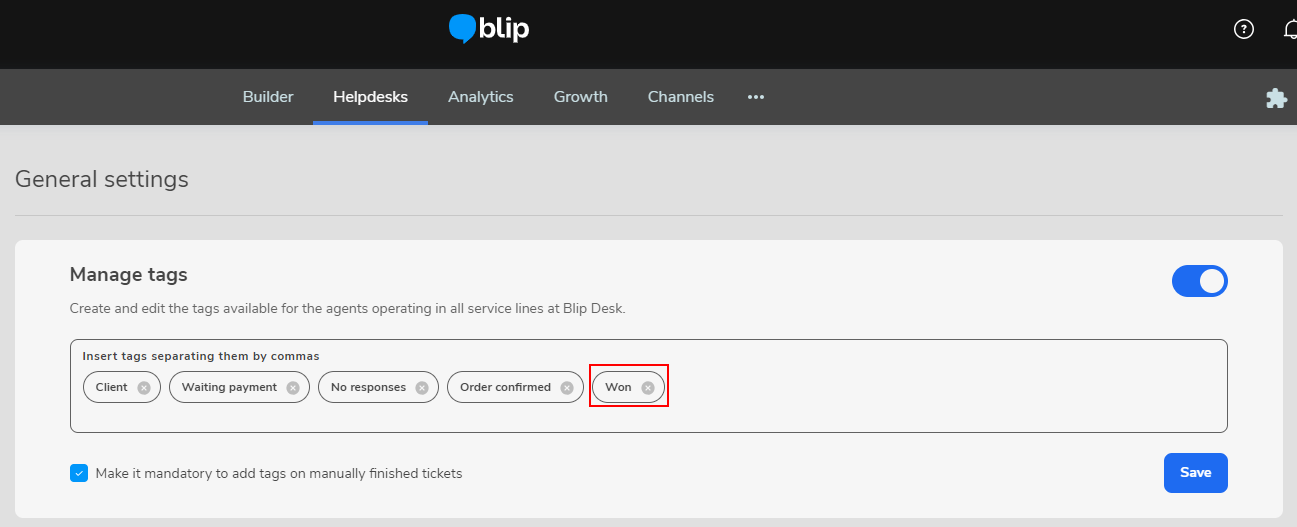 There are several ways to implement a conversion event, one of them is through the features of the Attendance module >Tags de Tickets where the attendant can categorize the ticket in the Blip Desk with a conversion tag (example of tag “Ganho”), indicating the conversion.