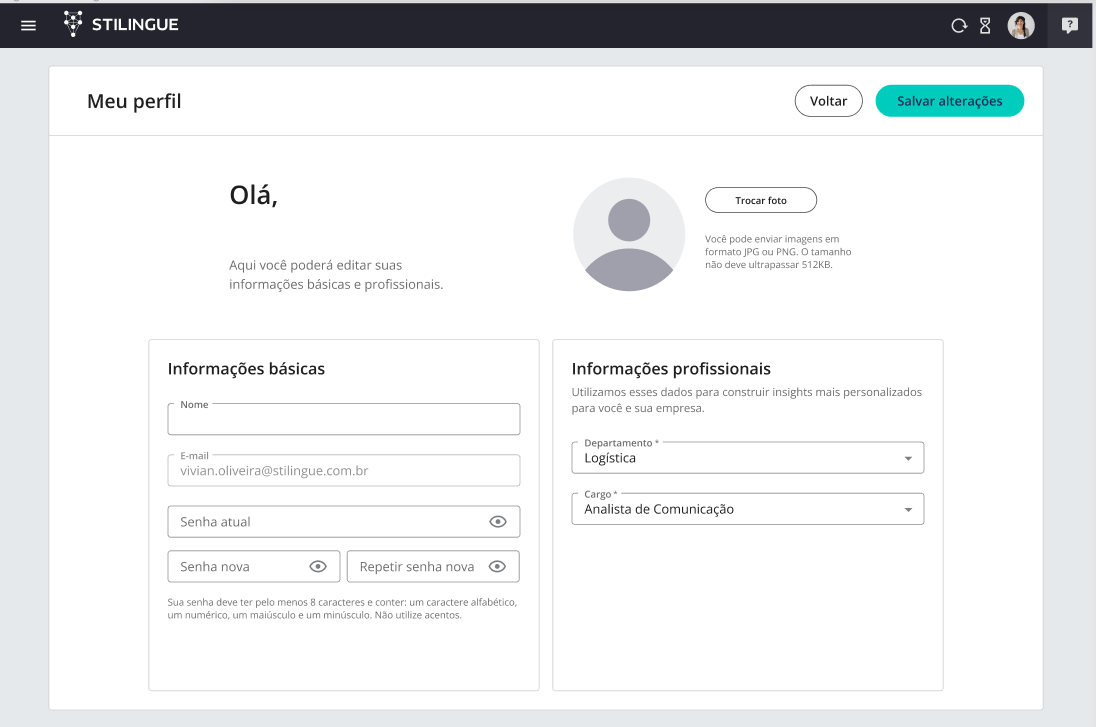 My profile May 06, 2024 12:10 Updated Index: Introduction Editing your profile Permissions and Access Introduction Find functions related to your account, searches, and other STILINGUE-related matters. When you access the menu located at the top of the home screen, you will discover features for editing and managing information about your accounts, permissions, and other settings. Among the menu options is the My Profile area, which gathers all data related to your profile in the tool. It's important to keep your personal and professional information always up to date. This ensures that STILINGUE understands your profile and can work on personalized solutions. Editing your profile In the first part of the page, you can view and edit your name, photo, basic and professional information. You can also update the password used to access the platform, except for cases where login is exclusively through SSO, and the password cannot be changed. The email used for login is also displayed, but unlike other data, it cannot be changed in this area. Still in the upper right part, the "Back" button allows you to return to the Account Center. Next to it, the "Save Changes" button will confirm all the changes made. Remember to always save any changes to your login information before accessing other areas of the tool. Permissions and Access Further on, you can view the accounts that have external access permissions (permissions on accounts that belong to different organizations than yours). The list includes the following points: Account: the name of the account to which you have external access. Group: the name indicating your organization or team within the tool. Permission: the administrative level that defines what can or cannot be done on the account. For more information, visit the discussion on the subject at our community or videos on our channel. 😃 Related articles User registration on Blip How to change the avatar (photo) of the bot How to Use Queue Management for Routing Support Tickets Managing Access Permissions What Is the Dashboard?