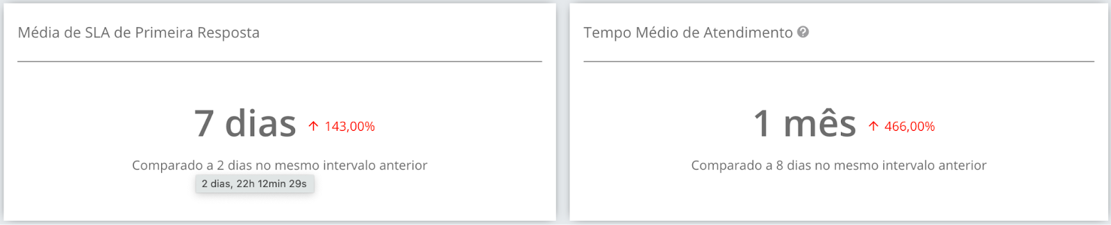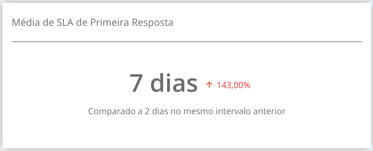 Average First Response SLA - STILINGUE Smart Care January 31, 2024 12:52 Updated Save time by viewing the Average First Response SLA graph on the report interface in a simple way. Known as "Service Level Agreement," SLA covers some details about service provision between the company and the customer. Within STILINGUE, SLA is measured only in "time." Now you can view the Average First Response SLA graph on the report interface. The average calculation takes into account the total number of conversations initiated within the filtered period. The graph also allows you to measure the operational efficiency in terms of the time it takes for the agent to send the first message to the user. The term "first response" refers to the moment when the initial status (pending) is changed to open or any other status. The conversations counted in this graph are those initiated within the filter period. Additionally, only the "original conversation," meaning the one that generates others, will be considered for analysis. The comparison to the previous period is calculated according to the time period selected in the filter. It always compares to the same previous period. For example, if the last 7 days were selected and the time range was from 24/06 to 30/06, the previous period will be the 7 days before that interval, which would be from 17/06 to 24/06. The displayed value is the greater magnitude of the Average First Response SLA. When hovering over the value, the total value is shown, both for the current and previous periods. The calculation of the percentage variation is based on the total time. To perform the calculation, the total average first response SLA time is converted into milliseconds and then the percentage variation calculation is applied. For example: In the GIF above, we have the Average First Response SLA for the current period, with a value of 2 days 19 hours 41 minutes and 56 seconds. Converting to milliseconds, we have: 243,716,500 ms The value of the Average First Response SLA in the previous period is 10 days 8 hours 38 minutes and 45 seconds. Converting to milliseconds, we have: 895,125,000 ms Applying the percentage variation calculation: (Current period total time - Previous period total time) / (Previous period total time * 100) Percentage variation = {(243,716,500 - 895,125,000) / (895,125,000)} * 100 Percentage variation = -77.22% The negative value indicates that the average first response SLA time decreased by 77.22% compared to the previous period. Note: Only users with Master or Administrator permissions will have access to the graph. For more information, visit the discussion on the subject in our community or the videos on our channel. 😃 Related articles Sending WhatsApp Active Messages on Blip Desk How to trigger notifications through integration with HubSpot SLA Calculation - STILINGUE Smart Care Fields for Smart Care Data Export SLA - Ticket & Annotations Report