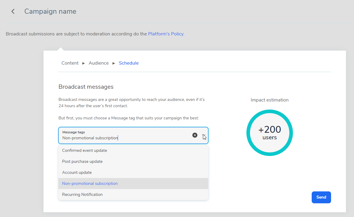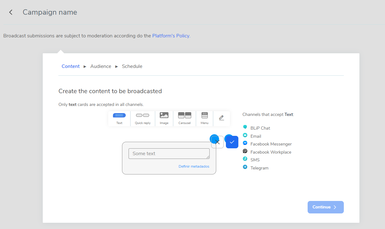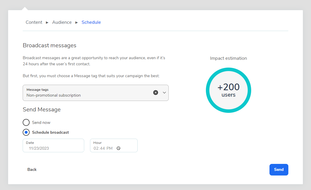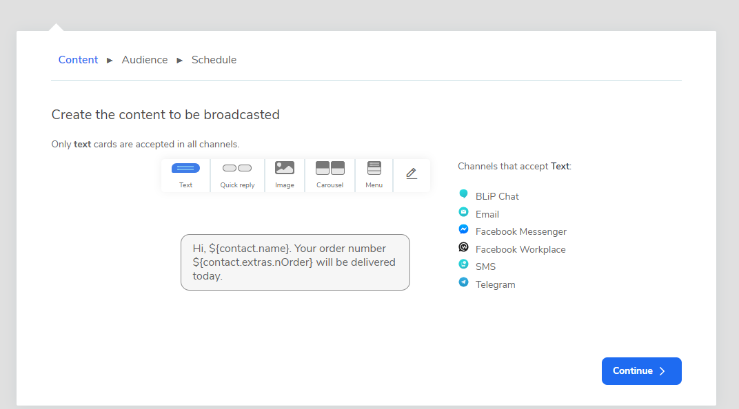 How to Send Active Messages on RCS February 25, 2025 13:54 Updated Index: How to access the Scheduler How to set up a campaign How to track sent campaigns How to customize your messages Through Blip, it is possible to send active messages to your customers on the Google Messages RCS channel. Using the official Agent of your brand, you can initiate conversations with users by sending active messages containing text, images, carousels, and other features. It is important to note that the Use Case and Business Rule are defined when you request the configuration of your Agent with Blip, and after the launch, it cannot be changed. For Simple and Basic agent types, the business model does not include sessions, meaning there will be a cost for each message sent and received individually. Conversational agents (Recommended) follow the rules of a 24-hour session whenever there is user interaction. In accordance with the channel and carrier policies, it is possible to send messages to users for whom you already have opt-in, and the same consent as SMS can be used. Additionally, the brand's agent must obligatorily provide the opt-out flow for users to have the option to unsubscribe. In case of non-compliance with channel policies, your agent may be suspended. Accessing GrowthTo send an active message on the Google Messages RCS channel, you must use the Active Messages - Other Channels tool, available in the Portal. Access the tool by clicking on Portal → Growth → Active Messages - Other Channels. Then, select the option "Send active message". Setting up a campaign Start by creating a name for your campaign. This step is important to identify the deliveries made in the future: The configuration of the active message campaign will follow 3 steps: Definition of the content to be sent; Definition of the audience that will be impacted; Definition of the date and time to send messages to contacts. Definition of message content In the first step of the campaign configuration, you should choose the type of content to be sent and configure the message. In addition to a text message, you can enhance communication with your customers by adding emojis, images, or a carousel of images, and facilitate the response using quick reply components. See below an example of a configured message: The channel through which the message will be sent will be chosen according to the audience definition. Click on continue to proceed with the campaign configuration. Definition of the audience In the second step, you must choose who will receive your message. To do this, select one of the distribution lists available in your chatbot, containing RCS contacts, and click Continue. Note that the tool will show an estimate of the number of users who will be impacted by the campaign. To learn more about how to create and manage distribution lists, click here. Campaign sending In the final step of the campaign configuration, you must first categorize your campaign into one of the available message types: Afterward, you can select between sending the messages now or scheduling the delivery for the best date and time to re-engage your customers. Finally, just click the send button to continue interacting with your customers. Tracking sent campaigns After sending your campaign, it will appear in the list of campaigns on the Scheduler's home page. Here, you can track the date and time of sending or scheduling for your campaigns, as well as the number of contacts to whom the messages were sent. Customizing your messages To get even closer to your customers and enhance the chances of engaging them with your campaigns, you can personalize your messages using the information from your contacts saved in Blip. To do this, you should configure the messages using contact variables in the following way: ${contact.variable} (for standard variables like name, email, phone, city, and document) or ${contact.extras.variable} (for extra variables): The message on the channel will appear as follows: Important! If the contact does not have the variable field, the content will not be replaced, and your message may not be clear to the user. For more information, visit the discussion on the subject in our community or the videos on our channel. 😃 Related articles How to create a contact list in RCS How to publish Google RCS on your Chatbot Active Messages - Error Codes RCS good practices Audience file configuration - Bulk notification sending