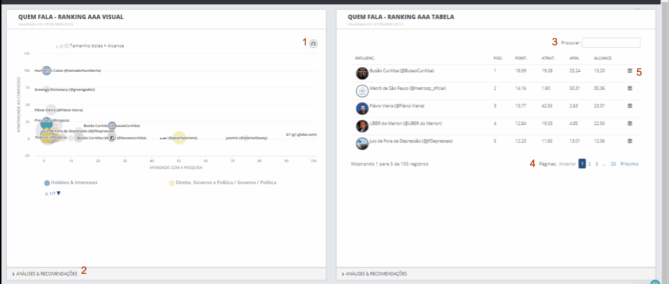 Who Speaks - Boards May 21, 2024 15:45 Updated See the influencers of your research in a personalized way with real-time information. Boards have been developed to present the data collected in your research in a didactic and visual way, with real-time updates and the possibility of presentation on TVs and monitors. In this way, they represent an interesting analytical and visual resource for your team to monitor crises and events where live repercussions make a difference. The complete Boards module is located in the sidebar of the Listening section. Among the Boards available within the platform, the Who Speaks module allows you to visualize the most influential publishers in your research in the last 24 hours, based on the AAA Ranking developed by STILINGUE. The Board is divided into two main segments: AAA Visual Ranking 1. Export You can export the graph as an image in the following formats: PNG, JPEG, or SVG. 2. Analysis & Recommendations Space for including text and images in the graph. AAA Table Ranking 3. Search Allows you to search for an influencer by name within the top 100 listed in the graph. 4. Pagination Here you can navigate between the pages of the ranking. You can move forward, go back, or choose a specific page. 5. Delete Removes the influencer from the list. Attention: This action will delete the influencer and all related publications from your research, not limited to just this graph. For more information, visit the discussion on the subject at our community or videos on our channel. 😃 Related articles Blip Copilot Mass Sending Setup Themes and Topics - Listening FAQs How to add push notifications to BLiP Chat Android