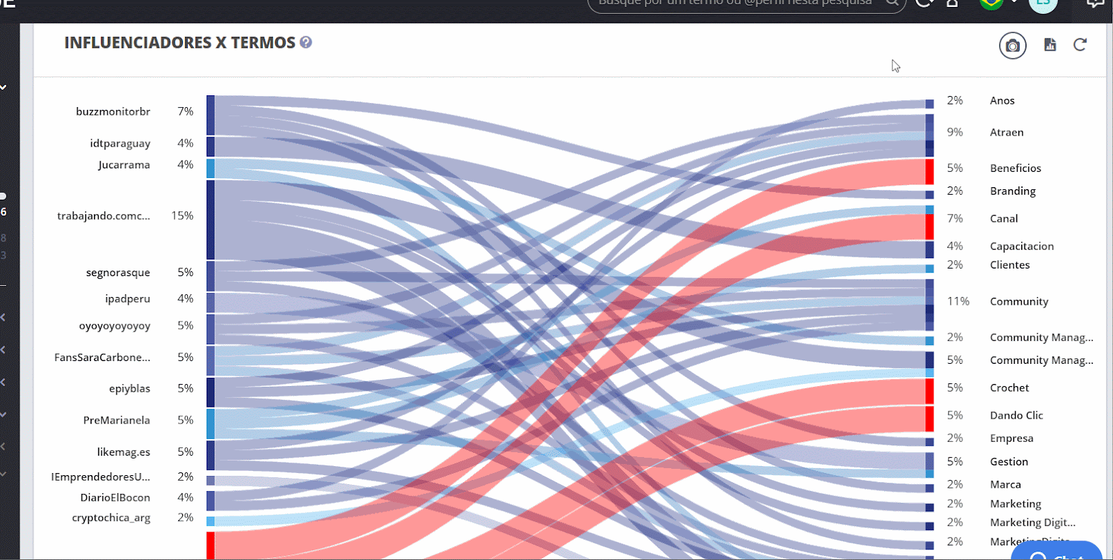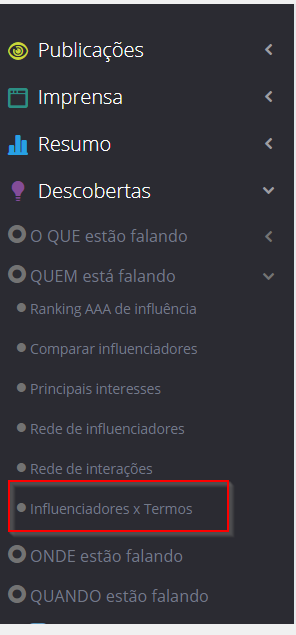 Influencers x Terms - Listening May 21, 2024 14:20 Updated Index: How it works Navigating through terms and influencers How can I export the chart? How it works Discover the most used words by influencers in your searchThe chart Influencers x Terms shows the relationship between the proportion of posts by an influencer and the most spoken terms by them within the analyzed filter. You can easily see which user has posted more words of interest for your brand or identify the origin of terms related to sensitive topics, for example.To access it, locate the Discoveries - WHO Is Talking area on the left sidebar: The social media of influencers are identified by color: Twitter: light blue Facebook: dark blue Instagram: yellow YouTube: red Navigating through terms and influencers When hovering over the influencer or term, the selected excerpt is highlighted, indicating the users who use these terms the most. Clicking on Influencers or terms will display the Zoom function with more information about the selected publisher or term: How can I export the chart? At any time, the chart can be exported as a file in formats: PNG, JPEG, SVG, CSV, or XLS. Or as a complete report in PDF. Refer to the guide on Exporting and generating reports to understand this operation step by step. For more information, visit the discussion on the subject at our community or videos on our channel. 😃 Related articles Difference between data presented on YouTube and on STILINGUE - Proprietary Metrics How to Send SMS via API How to save a contact's WhatsApp number Sidebar Menus and Quick Filters Comparative Matrix