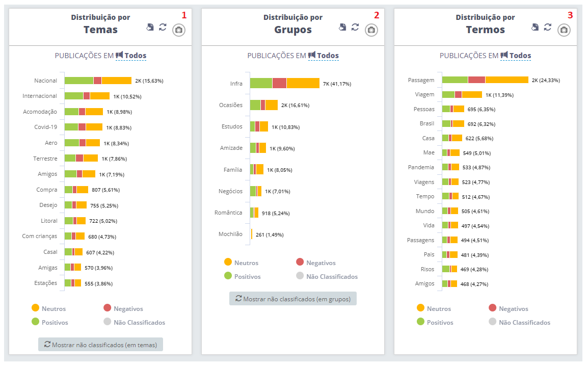 Distribution - Overview May 20, 2024 13:23 Updated Index: Introduction Sequence of graphics Zoom Introduction Learn how to interpret the summarized graphs of your research. The Summary section is designed to facilitate a more macroscopic view of the collected data. Customized Services: need assistance in generating reports with data collection and analysis production? We can assist you! Our team of experts is ready to assist you. Contact your STILINGUE Account Manager to access this and several other services. Before starting the analysis, it's important to highlight that the percentage displayed in the distribution charts corresponds to the total data shown in the charts. Only the 15 most relevant terms in quantity are displayed (within the Themes, Groups, Tags, and other charts in this area). For example, if you are analyzing a filter that has 20 Themes, only 15 of these Themes will be displayed on the chart. Therefore, the chart percentages will be based on the 15 Themes and not on the 20 selected in the filter. Sequence of graphics Here, we have a sequence of other charts that will show how the data distributions related to your research are progressing: 1. Distribution by Themes Informs the volume of classification of Themes created in your Research Configuration. 2. Distribution by Groups Informs the volume of collection of Groups created for your research. 3. Distribution by Terms Analyzes the publications collected in the research and separates the terms that have manifested most in the texts. For example: if the same term has appeared more than 30 times in different publications, it will be identified in this chart, taking into account the specified time period in the filter. Note: the selection of terms that appear in this chart does not consider "individual" or unique words. The context of the term is first analyzed, so it can be included in the chart. Therefore, not all words in the research are transformed into terms (specifically regarding this chart). Example 1: Brazil is a great country. In this sentence, "Brazil" is a term. Example 2: Brazil's Carnival. Here, Brazil is not a single term. It is related to "Carnival." Therefore, within this context, it would be considered the term "Carnival of Brazil" instead of just "Brazil." 4. Distribution by Regions It shows the regions where publications were made, based on user geolocation data. This graph is only populated when this information is available in the collected profiles and pages. In addition to Brazilian locations, you can also filter for posts from Spanish-speaking cities, states, and/or countries. Note: To understand in more detail how this graph works when the Conversation Filter is selected, refer to the guide. 5. Distribution by Searches This graph considers the descriptors entered in the Groups and Themes of your Search Configuration. This means that among the words you included in the Groups and Themes fields, those that appear most frequently in the collected publications are displayed in the graph. Note: The behavior of the Distribution by Searches graph is related to the classification in the Distribution by Terms graph, shown earlier in item 3. In the case of Distribution by Searches, individual terms are considered. This causes terms that do not appear in the Distribution by Terms to be included in the Distribution by Searches. Therefore, it is natural for this graph to have a larger volume compared to words. 6. Distribution by Tags Show the tags that are being used the most. 7. Distribution by Hashtags Inform which are the hashtags most mentioned in the posts. 8. Distribution by Domains Relates, which are the domains of sites where posts matching your Search Configuration were found. 9. Distribution by links List the links that appear most frequently in the posts collected in your search. Note: at times, the Distribution by Links graph may display the message "Not Classified". When this happens, it means that the collected posts do not contain links. This situation occurs more often with filters for types of posts where channels do not encourage or allow link sharing. Zoom Started exploring the data and have questions about what it represents? Just click on the data, and we will zoom in, opening a report with only the sampling of the selected data. For more information, visit the discussion on the subject at our community or videos on our channel.😃 Related articles Related Terms - Listening How ticket distribution works How to Use Contact Journey to Analyze Chatbot Conversation Flow Graphics - Overview Automatic Closure due to Client Inactivity