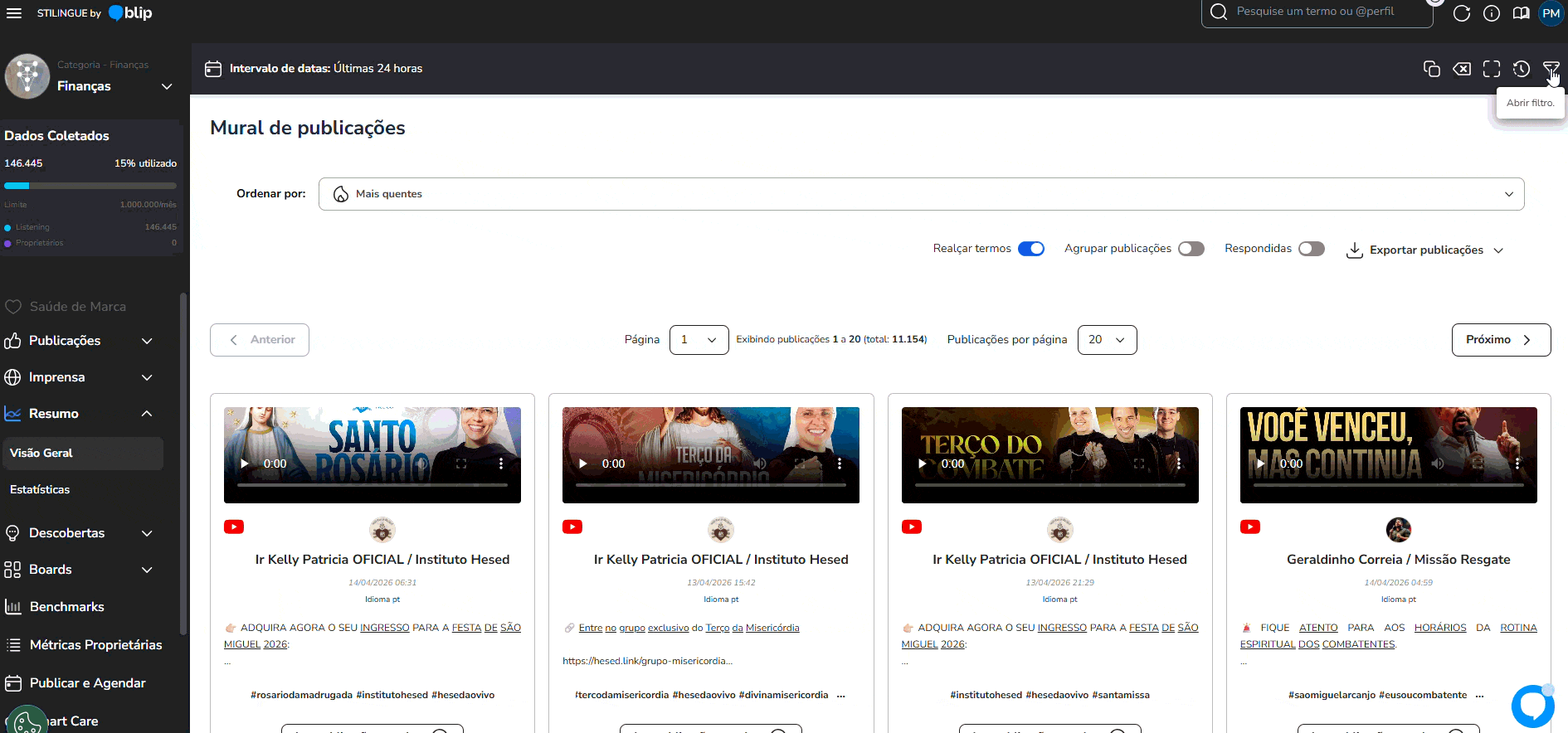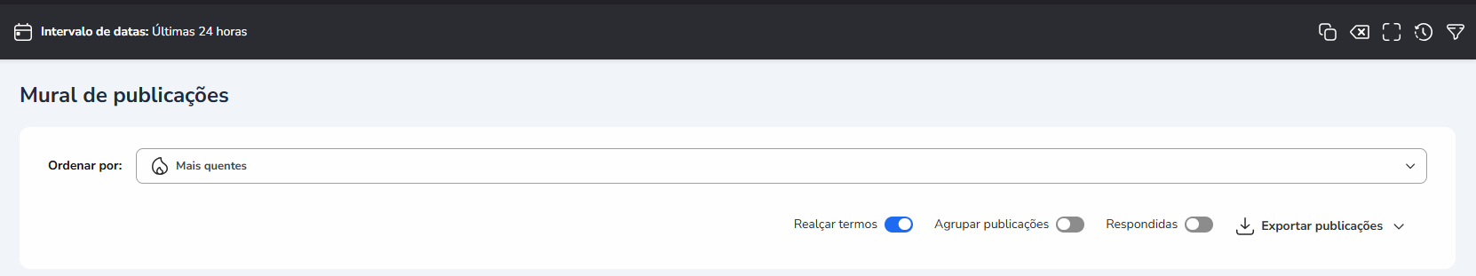 Mural and Publication Order April 15, 2026 18:16 Updated Index: How it works Viewing order with filters How it worksDiscover new possibilities for organizing and analyzing the publications from your researchThe Mural is the space where publications collected by the tool are made available, according to the chosen filter and the terms registered within the research. Through the filters, you can find a publication through text search, Groups, or Themes, among various possibilities.Learn how to access the Listening by clicking on the tab. To access the filter, click on the funnel icon (highlighted at the top of the page, as shown in the image below). At the top of the Mural, a filter is available with some options to facilitate the visualization and sorting of the posts: Viewing order with filtersBy clicking on each of the options, the system will display the publications in a specific sequence, according to the limitations of each API: in the case of Twitter, for example, publications cannot be ordered by +Commented as the social network does not consider this metric. You can choose from the following viewing criteria: 1. +HotThese are publications that are still resonating in the network - that is, with significant user interaction - regardless of the day they were made.2. +NewChronological order from the most recent publication in the filter.3. +Old Chronological order from the oldest publication in the filter.4. +AAADescending order of the level of influence (within the research) of users who posted these publications. 5. +Interactions Descending order of publications with the highest number of interactions, considering the sum of likes, shares, and comments. 6. +Likes Descending order of publications with the highest number of likes.7. +Shares Descending order of publications with the highest number of shares.8. +Comments Descending order of publications with the highest number of comments.9. +Followers/Subscribers Descending order of the number of followers of users who posted these publications.Note: when a proprietary page connected to the platform is registered in the Search Configuration through a Network Operator in a specific Group, all publications made by this page will be collected by the Group, including Dark posts and dynamic posts. Additionally, publications from proprietary pages not registered in Groups whose terms coincide with the descriptors of the Search Configuration will also be collected. The type of publication will be indicated on its card, and therefore, we may find cards of paid publications in the Listening Publication Wall. For more information, visit the discussion on the subject at our community or videos on our channel. 😃 Related articles Finding my bot's API-KEY Sending WhatsApp Active Messages on Blip Desk Bulletin Board and Publication Order - Proprietary Metrics Permanent History | Standard Data collected in open sea - Listening