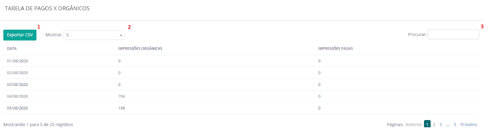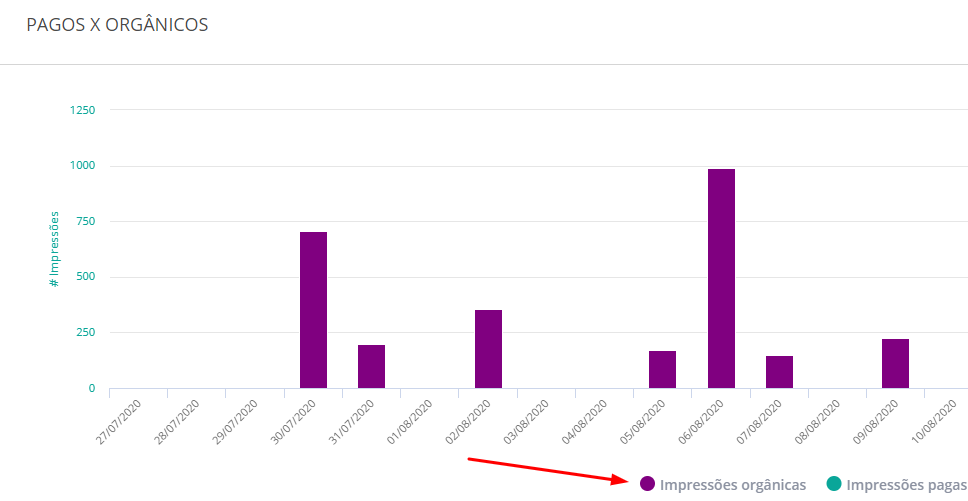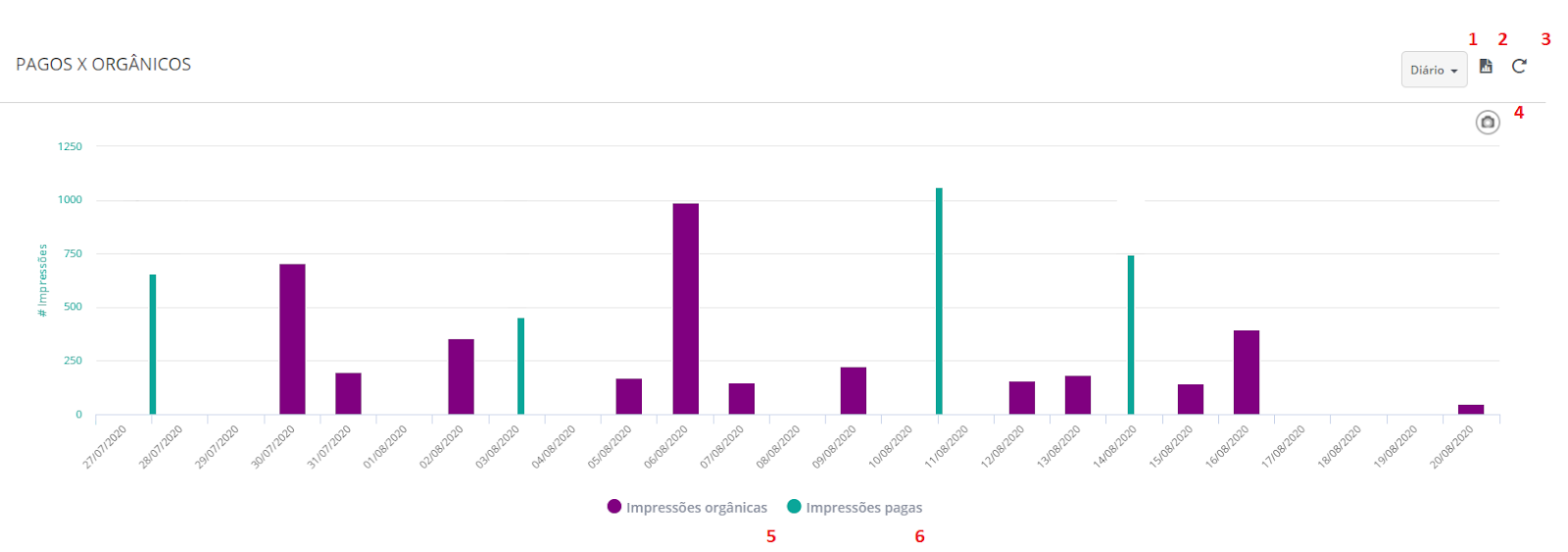 Organic vs. Paid - Facebook February 08, 2024 17:07 Updated Index: Impressions Organic vs. Paid Graph Table Compare the impressions of two different types of posts on your own page: organic and paid. The Proprietary Metrics section gathers pages from your brand across various social networks connected to STILINGUE. This enables daily analyses to understand more about engagement and allows you to generate insights from graphs. In the sidebar, click on "Organic vs. Paid" under the Post Analysis section: Impressions Before analyzing the graph, it's important to understand what impressions are. The concept of impressions is related to the number of times content from your page or about it appears on a user's screen. This number is counted as one impression. Organic vs. Paid Graph In this graph, you can compare the impressions made by the two types of posts within the selected period. 1. Chart period Select how you want to view the period information on the chart: daily, weekly, and monthly. 2. Export chart Export only the chart image or choose another format below. You can also view export fields, divided by chart criteria. 3. Reload card Update the chart information so that the most recent data is displayed. 4. Export Button Export the chart by choosing between the image and various formats. 5. Organic Impressions Number of times an organic post appeared on the user's screen. This graph considers only the filter period during which the posts were made, regardless of when the impression occurred. 6. Paid Impressions Number of times a paid or boosted post appeared on the user's screen. This graph considers only the filter period during which the posts were made, regardless of when the impression occurred. Note: the caption can be disabled, displaying only the data you find relevant at the moment. Just click on the caption criteria, it will turn gray, and the other points will be highlighted. Zoom You can click on any point on the graph and be redirected to Zoom. This action will zoom in on the graph data, showing detailed information. Table 1. Export Export the content in CSV format through the table. 2. Show You can choose to view between 5 and 100 pieces of data at once. 3. Search Search for the numbers presented on the graph using the field. For more information, visit the discussion on the subject at our community or videos on our channel. 😃 Related articles Activation of Additional Numbers on Blip - WhatsApp Embedded SignUp How to publish your bot on the WhatsApp channel - 1st version Audience file configuration - Bulk notification sending Builder variables Publications x Interactions - Facebook