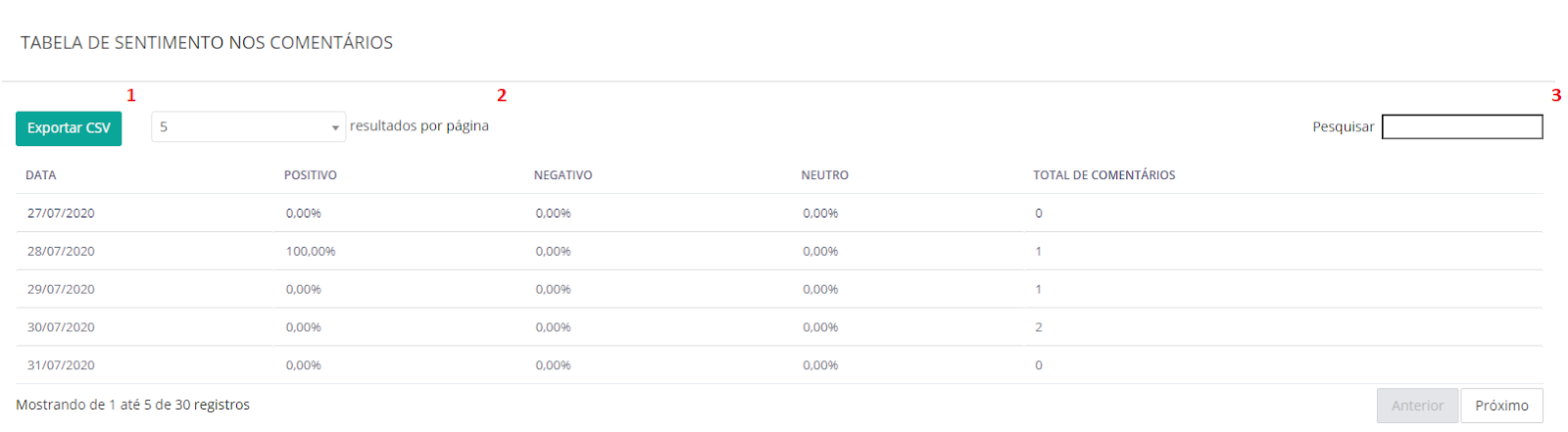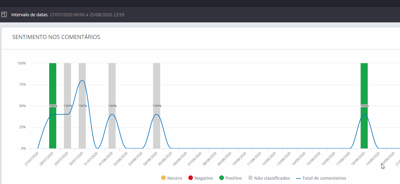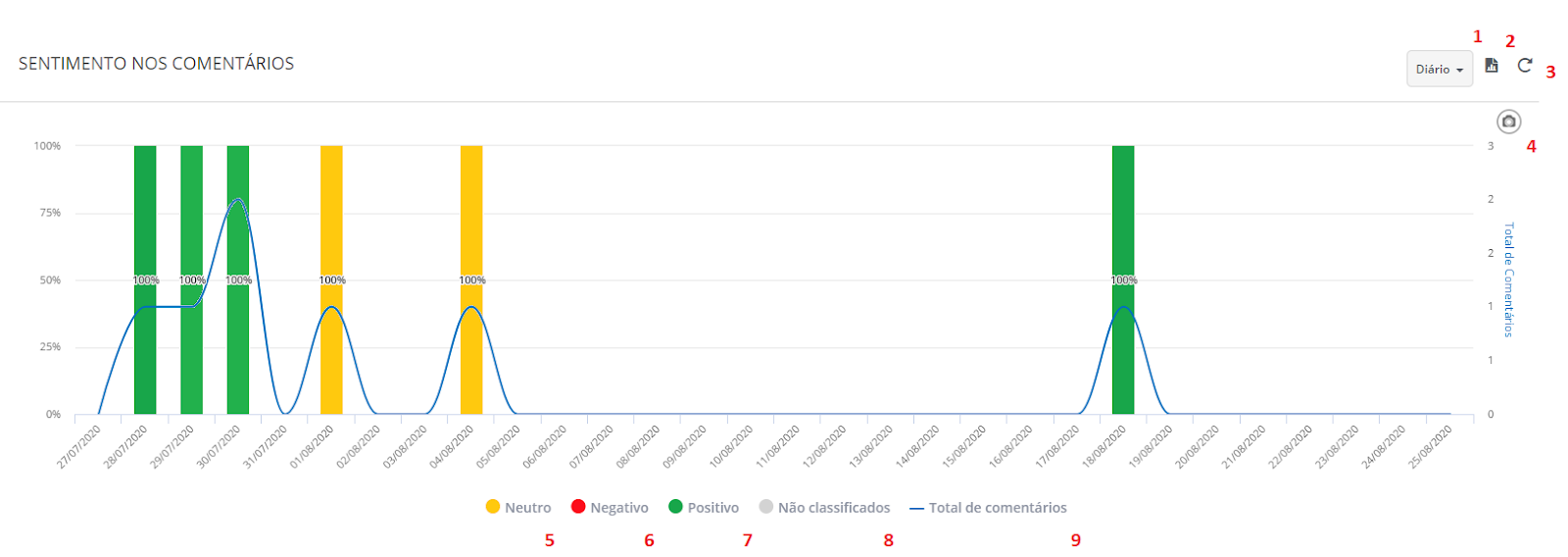 Comment Sentiment - Facebook February 15, 2024 13:03 Updated Index: Comment Sentiment Chart Zoom Table Check out how users feel when interacting with your Facebook-owned pages. When accessing the comment Sentiment chart within the Publications Analysis section, you can view comments made on your owned channels' posts and identify the sentiment present in each of them. To locate the chart, go to the side menu: Comment Sentiment Chart 1. Chart period Visualize the chart data by selecting information to appear daily, weekly, or monthly. 2. Export chart Export only the chart image or choose another format below. You can also view export fields, divided by chart criteria. 3. Reload card Refresh the chart information so that the most recent data is displayed. 4. Export Button Export the chart by choosing between the image and various formats. 5. Neutral Classification intended for comments with Neutral sentiment. 6. Negative Classification intended for comments with Negative sentiment. 7. Positive Classification intended for comments with Positive sentiment. 8. Unclassified Unclassified comments, according to the automatic classification of the system. 9. Total comments Comments made on publications, within the selected date range in the filter. You can also invert the sentiment presentation by clicking on the legend below the graph. The legend appears gray, indicating that this option is deactivated: Zoom Additionally, you can click on any point on the graph to be redirected to the Zoom. This area will enlarge and show the graph's data in detail. Table 1. Export Export the content in CSV format through the table. 2. Show You can choose to view between 5 and 100 pieces of data at once. 3. Search Use the field to search for the numbers presented in the chart. For more information, visit the discussion on the subject at our community or videos on our channel. 😃 Related articles Conversation Filter by Followers Sending WhatsApp Active Messages on Blip Desk WhatsApp Conversations Consumption Report How to add message tags How to Evolve Your Chatbot Using Contact Journey Analysis