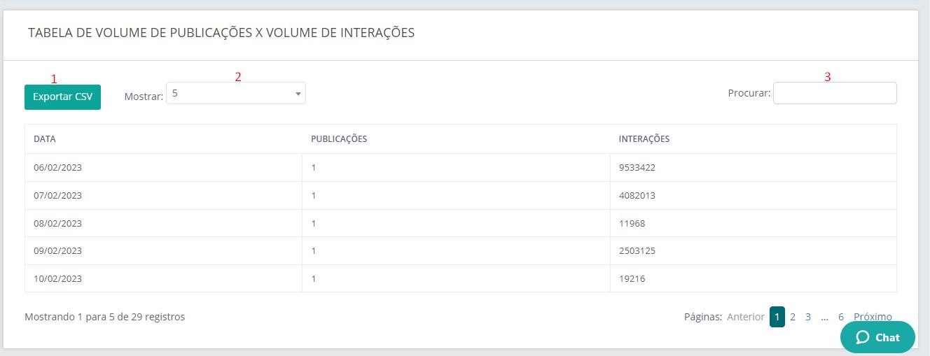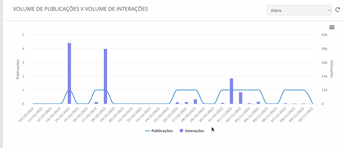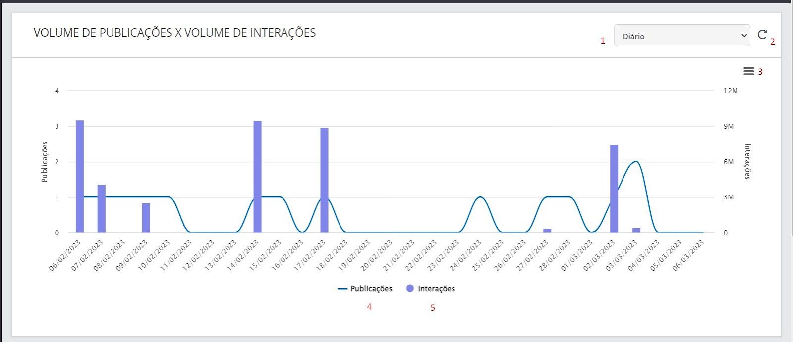 Publications x Interactions - TikTok June 04, 2024 12:49 Updated Compare the volume of publications and the total number of interactions within the selected period. Within the Proprietary Metrics area, all your pages from different social networks connected to STILINGUE are gathered. By accessing it, you can track and compare the metrics of your publications through custom graphs, thus gaining the best insights for your business strategy. After connecting your TikTok page to STILINGUE, you can access the "Publications Analysis" section in the sidebar. Next, navigate to the "Publications and Interactions" graph: Publications x Interactions Chart 1. Chart viewing period Visualize the graph data by selecting whether the information appears per day, week, or month. 2. Reload card Refresh the chart information so that the most recent data is displayed. 3. Export chart View in full screen and export the chart in multiple formats. 4. Posts Number of proprietary publications within the time period. 5. Interactions Number of interactions of publications made within the selected time period. Note: the caption can be disabled, displaying only the data you find relevant at the moment. By clicking on the legend criteria, it turns gray, and the other points are highlighted. Table 1. Export Export the content in CSV format through the table. 2. Show You can choose to view between 5 and 100 pieces of data at once. 3. Search Search for the numbers presented on the graph using the field. For more information, visit the discussion on the subject at our community or videos on our channel. 😃 Related articles DAU - Daily Active User Audience file configuration - Bulk notification sending What Is the Dashboard? TikTok Analysis - Overview Organic vs. Paid - Facebook