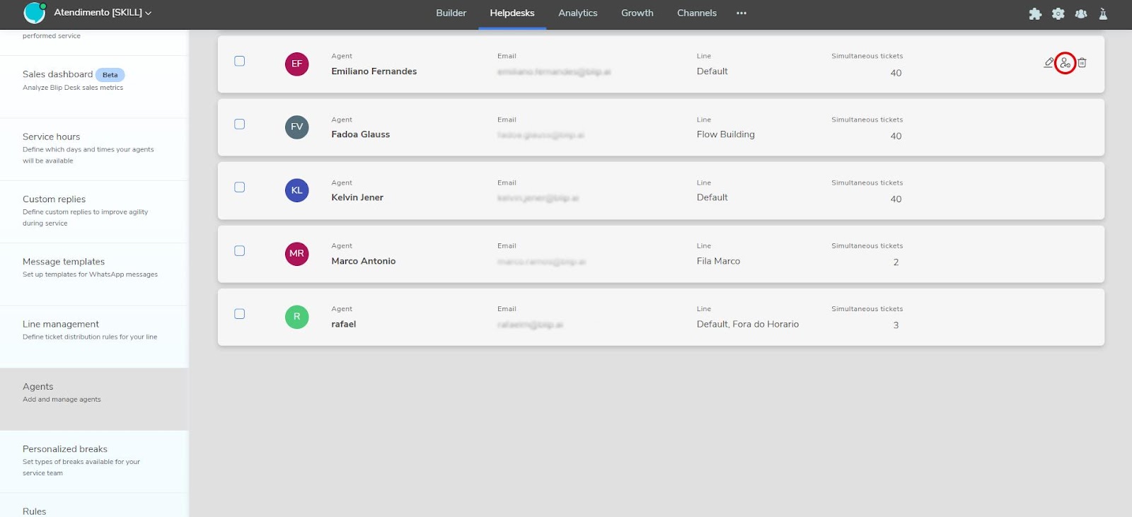 Blip Desk Agents Permissioning April 26, 2024 15:25 Updated Index: Context Prerequisites How to Set Up Attendant Permissioning in Blip Desk Functionality with Active Permissioning Coming Soon! Context Through permissioning, the manager will be able to indicate which agents can use a particular feature in Blip Desk. Agents permissioning can be done individually or in bulk (for two or more agents) through the Portal. Prerequisites Depending on the functionality, once enabled, agents registered in the bot remain without access and unable to use it. It is very important to observe the permissioning rules for each feature. You can check the details below in “Functionality with Active Permissioning”. How to Set Up Attendant Permissioning in Blip Desk To configure permissioning for a feature for one or more agents, access the “Service” page of the chatbot where the feature is configured, and click on the “Agents” section. You can define permissions by hovering over the agent's name individually and clicking on the permissioning icon (located to the right of the screen, between the options to Edit Queue and Remove Agent). On the next page, below the title Status, click on the button corresponding to the desired feature. Bulk permissioning is also allowed. For this, on the "Service" page, "Agents" section, click on the checkbox next to the names of the agents and then on the permissioning icon, visible as soon as the selection is made, at the top above the list of agents (between the Edit queue option and Remove agent). On the next page, below the title Status, click on the button corresponding to the desired feature. Functionality with Active Permissioning Check out the functionalities that already have active permissioning: Transfer tickets through Blip Desk Allows agents to transfer tickets to other agents in Blip Desk. Once this feature is enabled, all bot agents receive permission to transfer tickets; the same happens when adding a new agent to the bot. Edit contact data through Blip Desk Allows agents to edit or include information in the name, phone, email, and document fields in the "Profile" section in Blip Desk. Once this feature is enabled, agents registered in the bot remain without access to the functionality. It is very important that permissioning be done from its activation. Learn more at Blip Help. Send active messages through Blip Desk Allows initiating conversations with customers by sending active WhatsApp messages that can be made directly by agents. Once this feature is enabled, agents registered in the bot remain without access to the functionality. It is very important that permissioning be done from its activation. Learn more at Blip Help. Coming Soon! Create payment links through Blip Desk (Beta) Allows agents to generate payment links directly in Blip Desk, during the sales process. Once this feature is enabled, agents registered in the bot remain without access to the functionality. It is very important that permissioning be done from its activation. For more information, access the discussion on the subject in our community or the videos on our channel. 😃 Related articles Sending WhatsApp Active Messages on Blip Desk Managing Access Permissions Service History for Agents, on Blip Desk How to reset users through Beholder? Custom Breaks