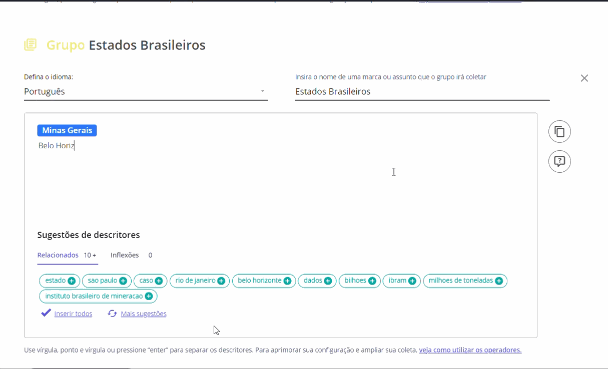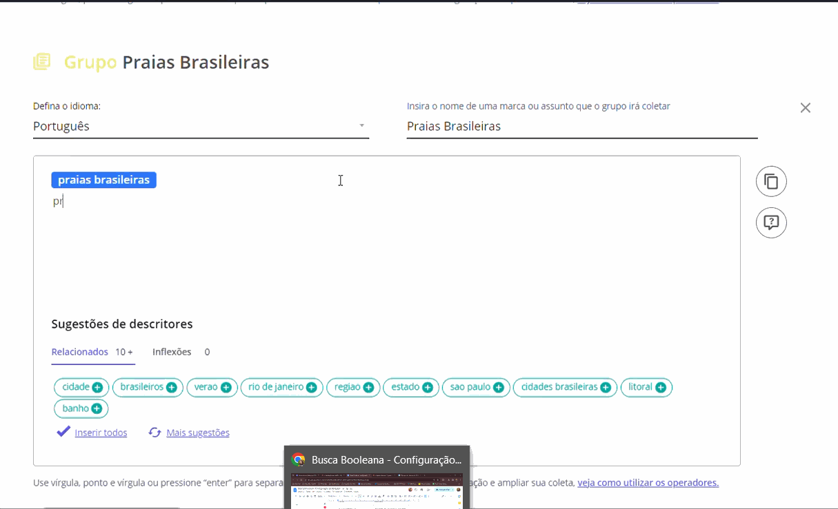 Boolean and Operators in Search Configuration February 14, 2024 17:16 Updated Index: Introduction Operators Introduction Boolean operators are part of the resource within STILINGUE that cancels terms in the search and combines more than one word at a time, helping to enrich search possibilities within your search.To direct collection in groups or give more accuracy to a topic, we have the context and Boolean operators such as: &&, exactly:, -(not). Operators 1 && (AND) The “&&” symbol allows you to combine results that necessarily contain the two terms entered in the search. The terms can appear together in a sentence or separated on different lines of the text, they will be searched in the same way. Example: Search Result && Brazilian Beaches ✔ The best beaches are Brazilian ones❌The best beaches are those in Bahia ❌The best foods are Brazilian 2. Exactly The “exactly:” operator has the function of differentiating words. This way it is possible to avoid confusion with similar terms, such as: “Pará” (State, starting with a capital letter and with an accent) and “para” (word with preposition function). This operator can also be activated by clicking on the term and selecting the corresponding option. 3- “-” (NOT) It is also possible to deny terms in your monitoring. Therefore, the collection will not include publications that contain the negative term. Example: let's assume that your Group is monitoring Minas Gerais and its cities, but publications about Belo Horizonte are not relevant to the research. With the operator “-Belo Horizonte”, these publications will not be collected. In the search configuration process, operators allow specific actions to be applied to their monitoring terms. You can choose not to collect certain terms, specify words that should be collected together, and other features in this area. Therefore, use the operators to your advantage and make your search even more assertive! For more information, visit the discussion on the subject in our community or the videos on our channel. 😃 Related articles Context and Groups Automation | Boolean Operators Activation of Additional Numbers on Blip - WhatsApp Embedded SignUp FAQs - Listening Sending WhatsApp Active Messages on Blip Desk