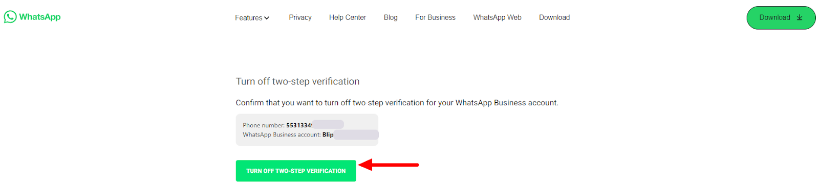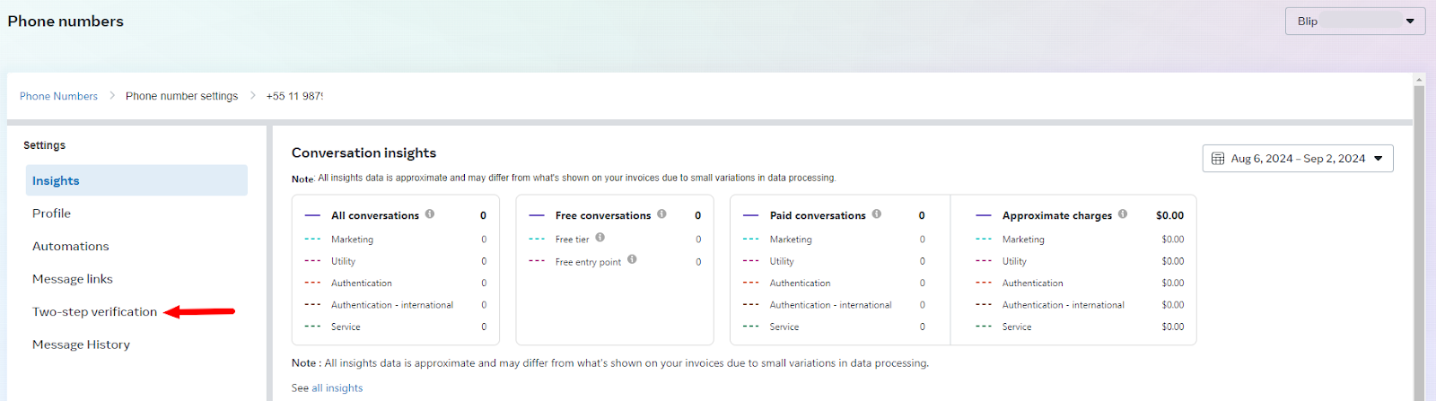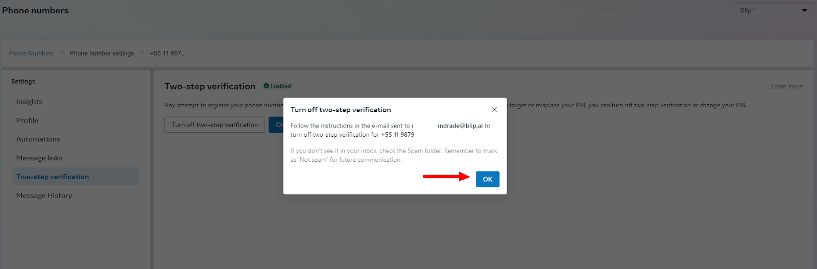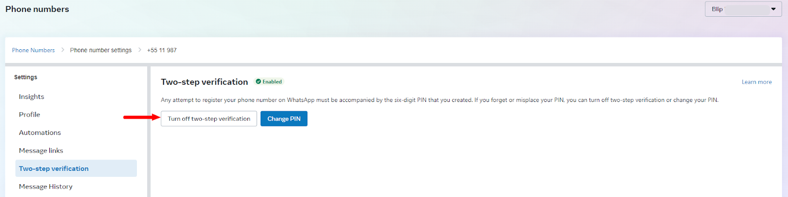 Removing PIN/Two-Factor Authentication from WhatsApp September 23, 2024 18:16 Updated Every number when activated must have the PIN, two-factor authentication, activated. This configuration prevents the number from being migrated to another WABA, business portfolio. Removal of authentication must occur when it is necessary to migrate the number. This process can be done either by the Portfolio that owns WABA, or by the BSP in which the number was activated, removal does not impact the functioning of the number. The business portfolio is also known as: Business Manager, Business Manager or BM. Below are the steps to remove authentication. You can only perform the following steps if you have access to WABA, if you do not have access, you must request the BSP to remove two-factor authentication. Access the business manager Select menu WhatsApp accounts Select the WABA where the number is active Click on the option WhatsApp Manager, in the bottom right corner Click on gear corresponding to the number that needs authentication removed Select the option Two-step confirmation Click on the option Disable two-step confirmation Then click OK You will be sent a message in the email displayed in the previous step. It is necessary to access the inbox of this email, when accessing, look for the email with the subject: WhatsApp Two-Step Verification Reset Access the email message and click on the link Click on “Turn off two-step confirmation” After completing this process, the PIN will be removed immediately. For more information, access the discussion on the subject at our community or the videos on our canal. 😃 Related articles Number portability in WhatsApp API Creating a Facebook profile for the business portfolio How to create CTWA ads using Blip Ads Manager Creating interactive messages in WhatsApp How to connect your chatbot on WhatsApp - 2ª version