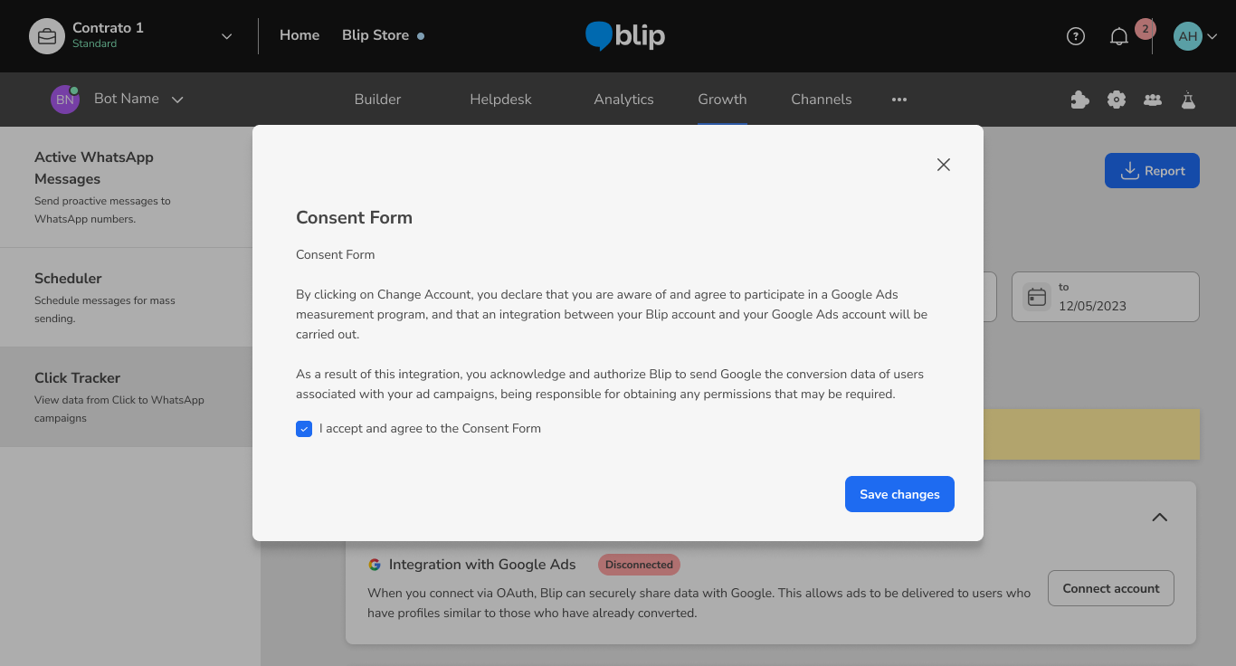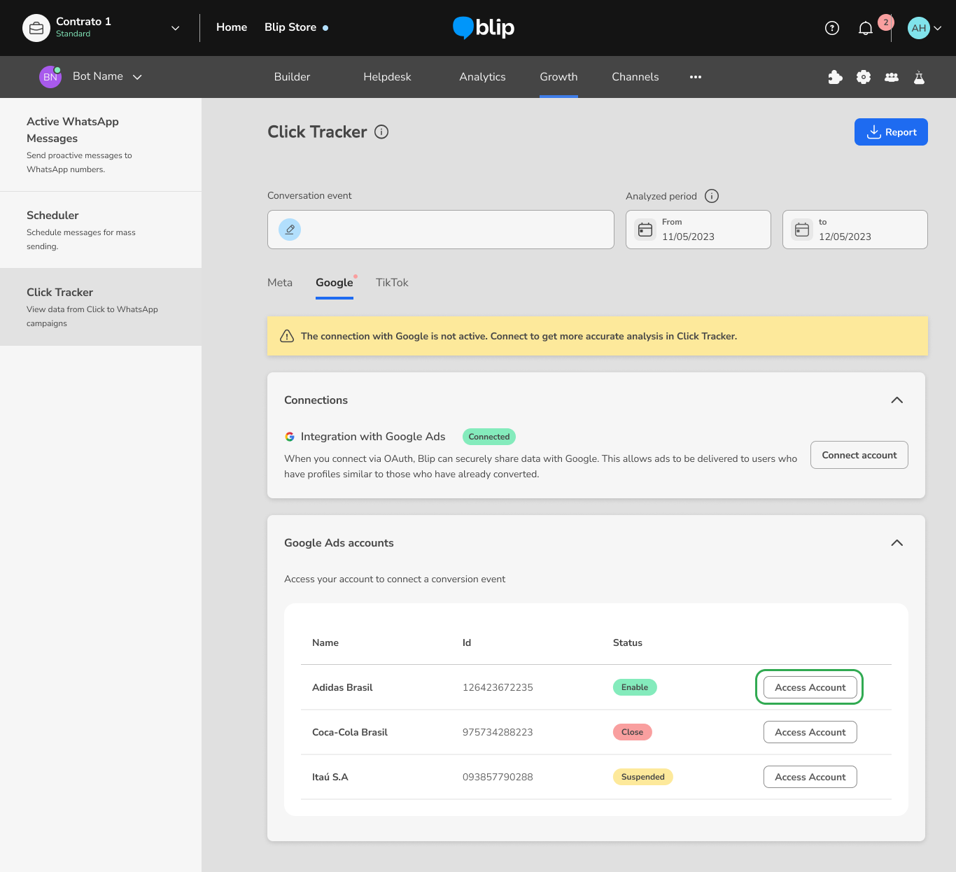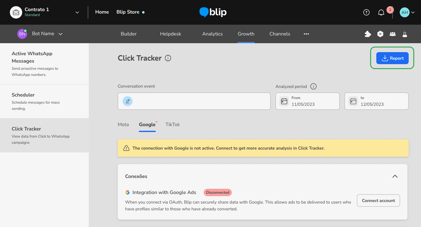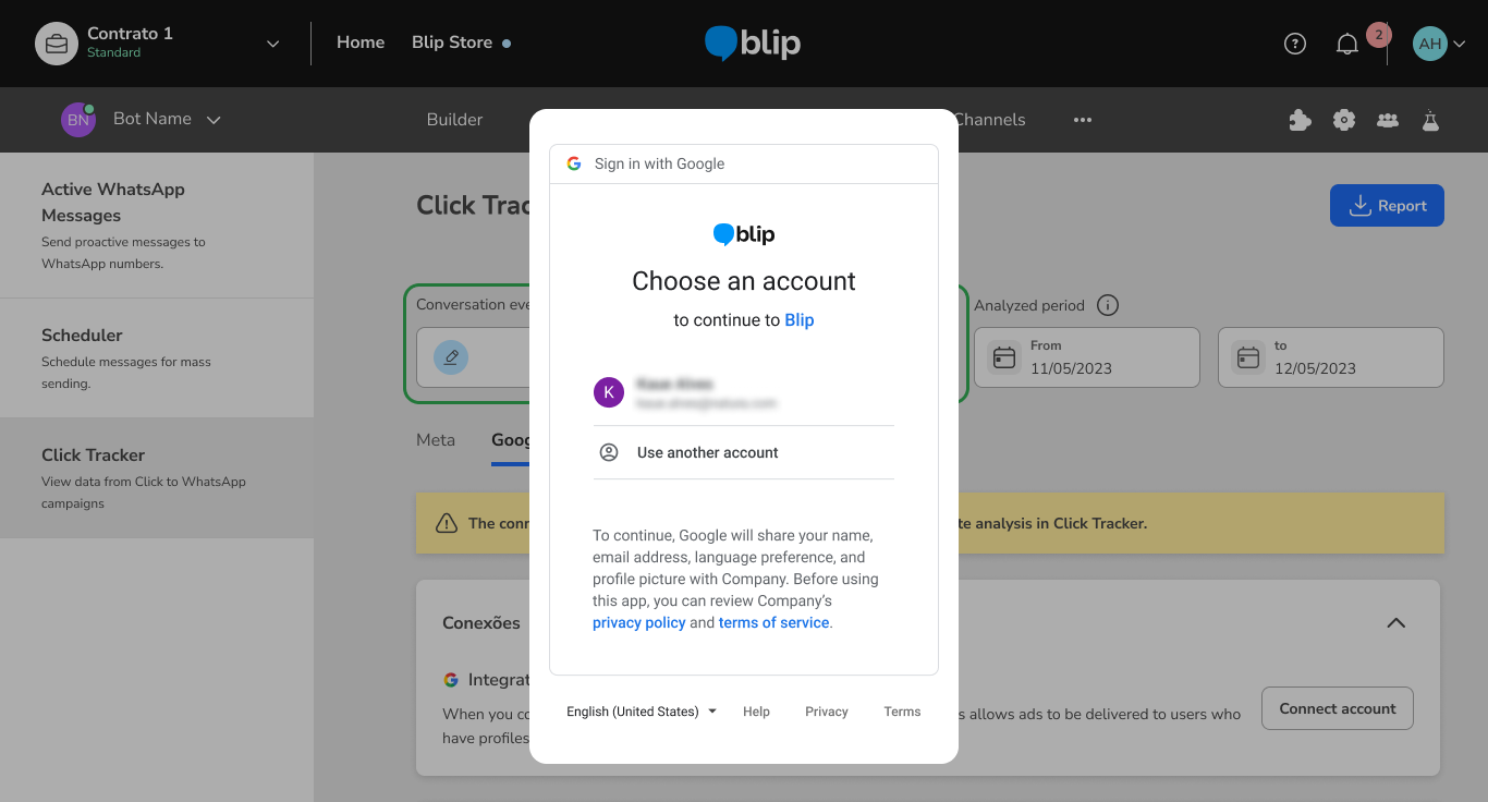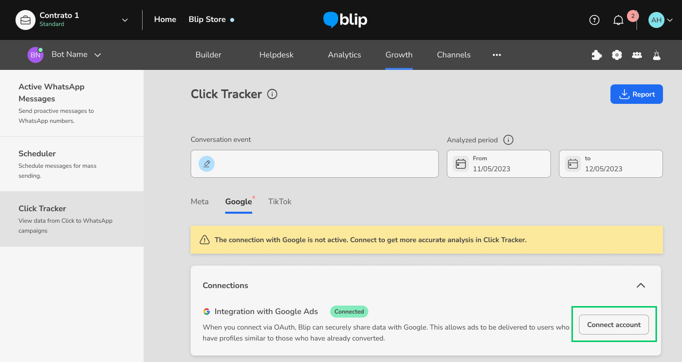How to connect the Click Tracker to your Google CTWA campaigns March 11, 2026 19:50 Updated Index: Why integrate with Click Tracker? Creating a Google Message Ads campaign Creating an event in the Builder Setting up a conversion event How to integrate with Google Ads API via Google OAuth Viewing the Google Ads Report FAQ Why integrate with Click Tracker?With Click Tracker, brands have more visibility over the performance of their Click To WhatsApp in the conversational flow, being able to compare the reach of each ad, how many conversations were generated by each one, and also how many conversions happened in the conversational flow. The integration between Click Tracker and Google Ads aims to allow the tracking of all conversations started on WhatsApp through Google ads, define the conversion point in the journey, and return conversion signals to Google (via Google Ads API), which allows for improving the performance of CTWA campaigns and optimizing the performance of creatives. To activate the integration completely, it is necessary to: Create and configure the campaign in Google Ads Manager according to Google's guidelines. Next, create an event in the Builder (event track) and use it as a conversion event in Click Tracker. Connect the Google account used in campaign management in the corresponding tab of Click Tracker, accept the Term of Consent, and select the desired conversion event for the configured campaign. Finally, contact the CSM responsible for your company's account at Blip and provide the Google Ads Customer ID. To obtain this ID, simply access Google Ads, click on your profile picture, and the ID will be available in the account information. Creating a Google Message Ads CampaignThe first step is to create the campaign in Google Ads, defining the objective according to your strategy, the audience you want to reach, and the available budget. These settings are important because they determine how, when, and to whom your ads will be displayed.Learn how to Create a campaign. After having the campaign created, add a Message Asset (recurso de mensagem), a Google Ads feature that allows including the option to start a conversation directly through the ad. This feature can direct the user to a configured messaging application, such as WhatsApp, enabling immediate contact with your company.To understand more about this feature, access: Message assets. Creating an Event in the BuilderIf you are not yet using Click Tracker and don't have any events set up in your Bot's flow, simply follow the steps below, and you'll soon be able to analyze your CTWA campaigns with much more data to make even smarter decisions.To create an event in the Builder, you need to access the dialog box that represents the exact moment when your customer will take the action that triggers the desired conversion. By clicking on the box, a panel will open on the right side of the screen with various additional configuration options.In this sidebar, simply go to Actions and create a new Entry or Exit action, of the Event Logging type. This type of log requires you to define a Category and an Action.Since Click Tracker uses the name entered in "Category", it’s important to carefully choose this name so that it makes sense for the mapped event and facilitates future analysis in the tool and reports.There’s no problem in using the same name for Action as the one set for Category.A single Category can be registered in multiple blocks of the Builder. If the end user can convert at various points in the conversation, it’s possible to map all the events with the same name, allowing you to later analyze this group of users in Click Tracker.Support Documentation available in Blip Help:Ação: Registro de eventos Setting up a Conversion EventOnce the event is created in the Builder, the next step to use Click Tracker is to configure the conversion event. To do this, simply click the pencil icon in the "Conversion Event" field, and a pop-up will appear for you to choose from all the events previously registered in the Builder.Note: For the event to appear in this list, at least one record must have been made by the platform. This means that a lead must have been converted at least once for the platform to create the event and make it available in this list on the screen. How to integrate with Google Ads API via Google OAuthTo integrate Click Tracker with the Google Ads API using OAuth, allowing Blip to send conversion signals from conversations initiated through ads, click on "Connect Account":Accept the Blip terms:Log in with your Google Ads account:You're now connected. The next step is to go to your Ads account and connect the Conversion Event of the import type.To do this, click on "Access Account":Next, a modal will be displayed where you can connect a conversion event. To do this, select the desired event and click “Connect event”. The events displayed in this modal are those previously created in your Google Ads manager account. If you have not yet created events, this modal will appear empty. In this case, it will be necessary to create the events directly in your Google Ads Manager. Viewing the Google Ads ReportGet access to the main information about your ads published through Google Ads. To do this, select the “Google” tab in Click Tracker and click the “Conversion report” button. A .csv file will then be downloaded containing the following data: Contact phone number; Date and time of the start of the conversation; Date and time of the conversion; Bot ID; Chat ID or Gclid or Graid (Google Ads identifiers); Conversion event configured at the time of the conversation; Current conversion event configured (in cases where the event was modified after the ad already had conversations started); Campaign and ad data. This data will help the brand better analyze campaigns with higher conversions, the average time between the click and the conversion, as well as assist in the evolution of marketing str