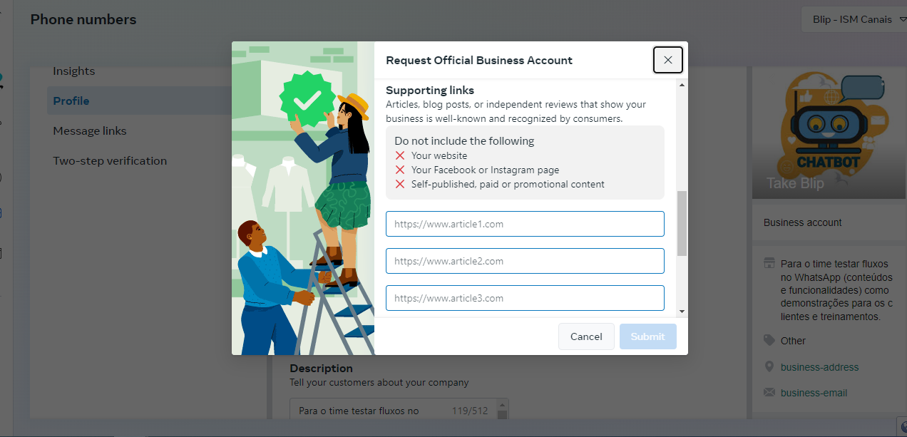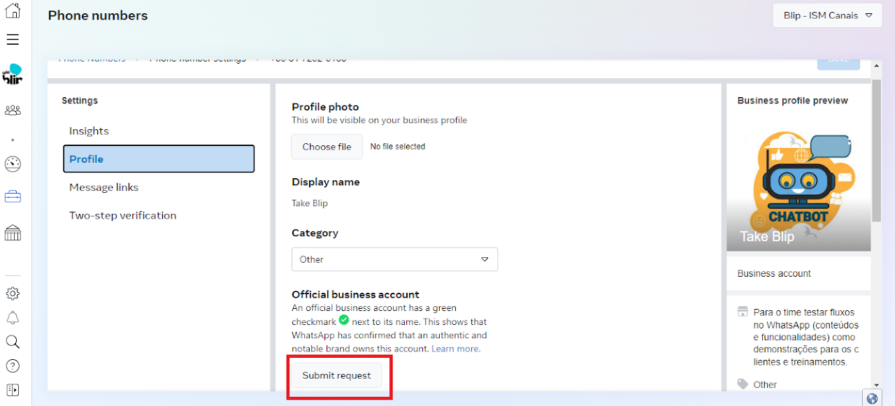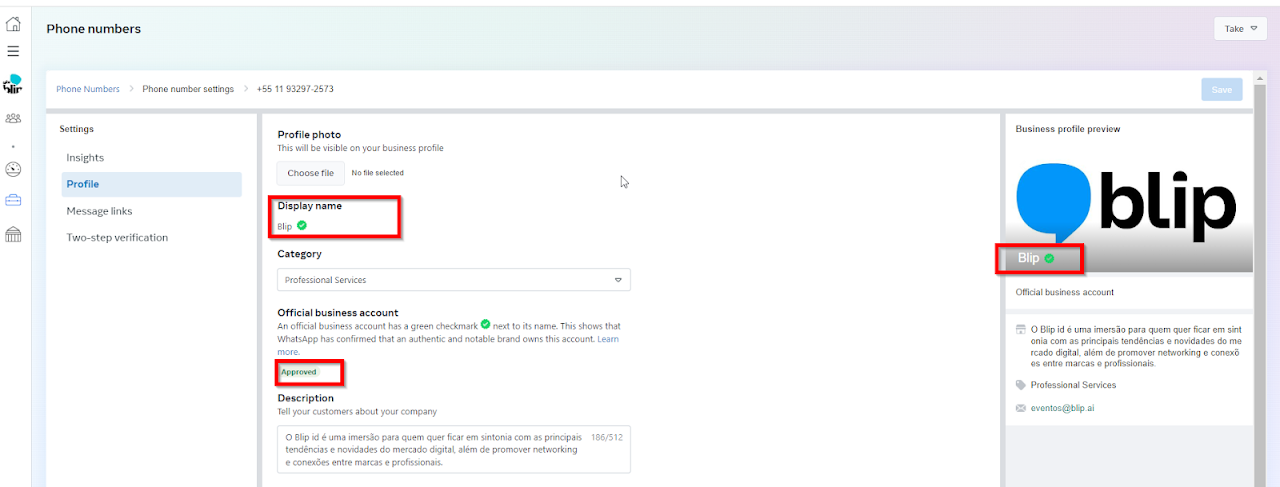Request for Official Business Account Badge November 22, 2024 17:01 Updated Index: Introduction Approval Criteria How to Request Review Process Display Name Similarity Introduction An official business account can be identified by the green badge that appears next to the display name associated with the number. This badge is provided after an analysis based on several criteria by Meta's team, including the company's notability. The business account badge shows users that they are interacting with the official account and not a fake one, building greater credibility and trust. Users are more likely to engage significantly, and the badge serves as a way for users to confirm that the account they are interacting with is an authentic, notable, and active presence. Since WhatsApp is often used for customer service, private and sensitive information may be exchanged in conversations. The badge ensures users feel confident in the authenticity of the account. Approval Criteria According to Meta, the approval criteria are based on various factors and differ from the policies of other platforms. In addition to complying with WhatsApp's Business and Commercial Policies, businesses must be considered notable — meaning they must represent a widely recognized company, brand, or entity that is frequently searched for. Notability is assessed based on the presence of the account in news articles from publications with significant audiences. Paid or promotional content, including business listings or apps, is not considered as a source of analysis. The prerequisites for obtaining the badge include an approved business verification, an approved display name, and two-factor authentication (2FA) set up. How to Request To request an official business account badge, follow these steps: Access the WhatsApp Manager in your Business Manager account. Within the "Overview" tab, click on the phone number for which you want to request the badge. Check if two-factor authentication (2FA) is set up for your number. If it is not, contact Blip Support and ask them to set it up for you. Without two-factor authentication configured, it will not be possible to request the official business account badge. Remember that the business verification process and the display name approval must be completed and approved before you can request an OBA. To check if your business is verified and the WABA is approved, simply go to the "Accounts" tab > "WhatsApp Accounts," and confirm if the statuses "Verified" appear under Business Verification and "Approved" appears under Account Status. In the "Profile" tab, click the "Submit Request" button and fill in the required information. To prove that your business is notable, you can submit up to 5 links to reputable publications. We recommend submitting news articles about your company published on websites with significant relevance and visibility. Additionally, you should provide links to other social media pages of the company, such as Instagram, LinkedIn, Facebook, YouTube, etc. Country and Operating Language: Enter according to the location of your business. Support Links: These are articles, blog posts, or independent reviews that demonstrate your business is well-known and recognized by consumers. Provide links to publications that clearly mention your business, and prioritize more relevant portals. Do not include: your website, your social media, or self-published, paid, or promotional content. Additional Support Information: Provide a detailed description of your company. At this point, don't hold back—mention the cities where your business operates, the main business activity, provide links to your social media profiles, and include any other relevant details. Click the "Submit" button. Within 48 hours, after Meta completes the review of your request, you will receive a notification informing you whether the account has been approved as an official business account or not. If the request is rejected, you can submit a new one after 30 days. Official business accounts are not granted to company employees, test accounts, or Business App accounts. Note: Previous approvals of the badge for a specific number on your WhatsApp account do not guarantee approval for other numbers (with different display names) associated with that account. Review Process Once submitted, the request will be reviewed by Meta's team, and you will receive a notification informing you whether the badge has been approved or not. If the request is rejected, you can submit a new one after 30 days, following the same process. Don't worry! Customers will recognize the structure behind your service through the speed and efficiency with which they interact with you, as the bot is capable of engaging with multiple customers at the same time. The automation throughout the customer service process adds value to the customer experience and helps build loyalty, as they can interact with your business quickly. Keep your business presence active online and make sure your profile information is always up-to-date. If your business is approved as an official business account, access the WhatsApp Manager to check which phone numbers associated with your WhatsApp account have been approved for the badge and which ones have not. Tips Similarity Between Display Name and Legal or Trade Name Meta needs to understand if the registered display name is similar to or represents the same business. Therefore, it’s a good idea for the legal name (razão social) or trade name (nome fantasia) to be similar to the display name. Remember, the CNPJ (Brazilian tax ID) must match the one registered in Blip and the WhatsApp channel. Consistent Identification Across All Channels All pages (Facebook, Instagram, website, and other social media) should have the same logo and the same name identifying the brand. This should be the same as the display name, including capitalization, spaces, and punctuation. To change the display name, you must contact 