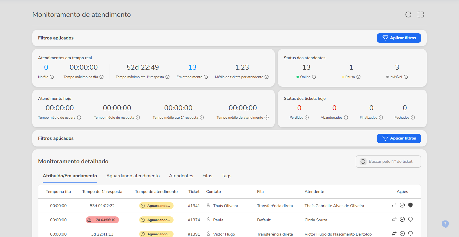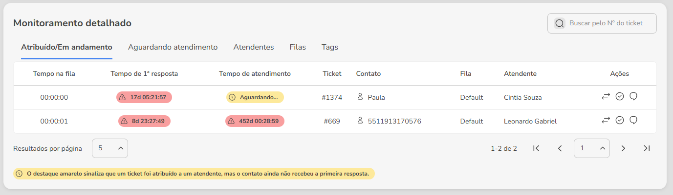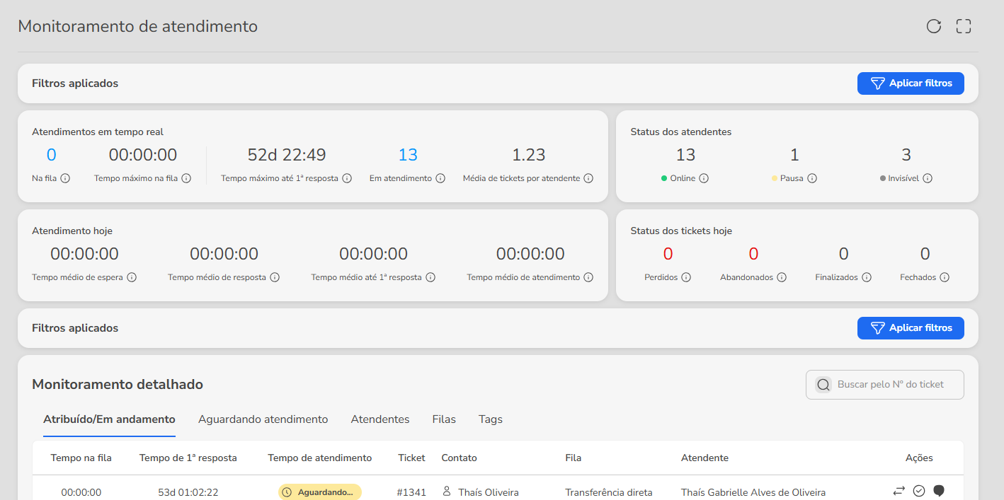 New Monitoring on Blip Desk: screen changes and new features April 29, 2025 14:24 Updated Available from April 29, 2025 We are launching a new version of the Blip Desk Monitoring screen! The new feature brings visual improvements, important technical adjustments and the release of two new features that will make your experience even better. Why are we changing? The new monitoring was developed to ensure a more agile, consistent and intuitive experience for managing services. All the features and information you already used are still available in the same place. The changes bring more visual organization, better use of the screen and the necessary basis for the continuous evolution of the platform, with less impact on other areas. Furthermore, the update enables the launch of new features that make monitoring even more powerful for managers' daily lives. What changed? The new monitoring maintains the functionalities you already know, but presents important improvements in organization, usability and navigation. The areas that underwent the most adjustments were the search filters, a ticket list and others conversation view sidebar. We also took advantage of the update to apply improvements to some flows, standardize visual elements and correct existing problems. Interface changes FiltersThe filter usage journey has been revised. Now, to apply filters, you need to: 1. Click the “Apply filters” button or the pencil icon to edit an existing filter. 2. Select the filters you want and click “apply”. Ticket ListWe have made several improvements to the ticket list: 1. The "Tickets in service" tab has been renamed to "Assigned/In progress", while "Queued Tickets" is now called "Waiting for service". 2. The term "customer" has been replaced by "contact" across the entire screen. 3. The visual indicator of tickets without a first response now appears over the "Service Time" column, so that it is possible to display the new SLA indicators (learn more about the SLA Regras). 4. The search field by ticket number has been repositioned to the right corner of the screen, while the pagination has been moved to the end of the table. Change in column orderTo make reading more fluid and prioritization more practical, the order of the columns has been reorganized: 1. In the “Assigned/In progress”: Service times (such as waiting time and service time) were grouped. The ticket number now appears before the contact name. A new column has been added Actions, allowing quick interactions without leaving the list. 2. In the “Waiting for service” tab: The service priority is now displayed right after the status. The ticket number appears as the third column. A new Actions column has also been added. New actions in the ticket listIn addition to transferring calls from ticket details, it is now also possible to: Complete a service directly from the list. Start a conversation with the attendant. Conversation Thread SidebarThe conversation view has been redesigned and divided into three tabs: 1. Service: displays the exchange of messages between attendant and contact. 2. Talk to attendant: allows the manager to initiate or respond to messages directly to the attendant. 3. Information: provides detailed service data. Other changes 1. Minor adjustments to the titles and descriptions of the metrics displayed at the top of the dashboard.2. Navigation when opening contact details in new tab. 3. Update of the Monitoring page URL (with automatic redirection). Bug fixes In addition to the new screen features, we took advantage of the launch to fix some known issues: Include the display of attendants' status in the transfer mode. The flaw that caused uploaded files to appear as "Unsupported Content" in the chat thread. New features Two new features are being launched along with the new screen: Saved filters: customize and reuse search filters to make it easier to track calls. Manager-attendant chat: send direct messages to the attendant, practically and integrated with monitoring. Find out more about the Chat between manager and attendant. Related articles Sending WhatsApp Active Messages on Blip Desk Limit of Tickets Waiting for First Response Untitled How to do customer service in Blip Desk Creating interactive messages in WhatsApp