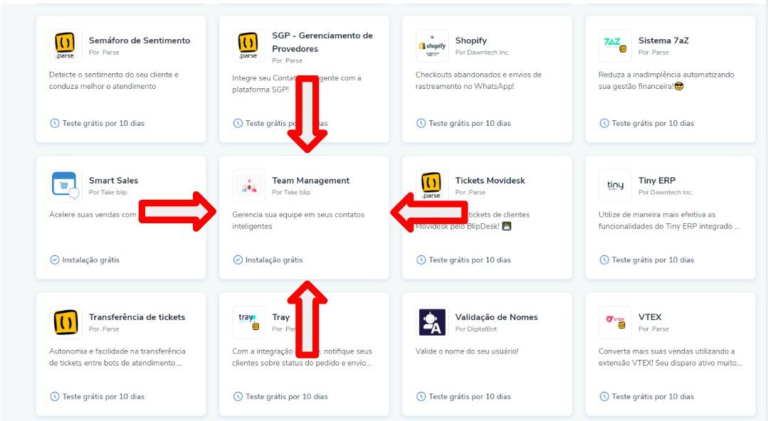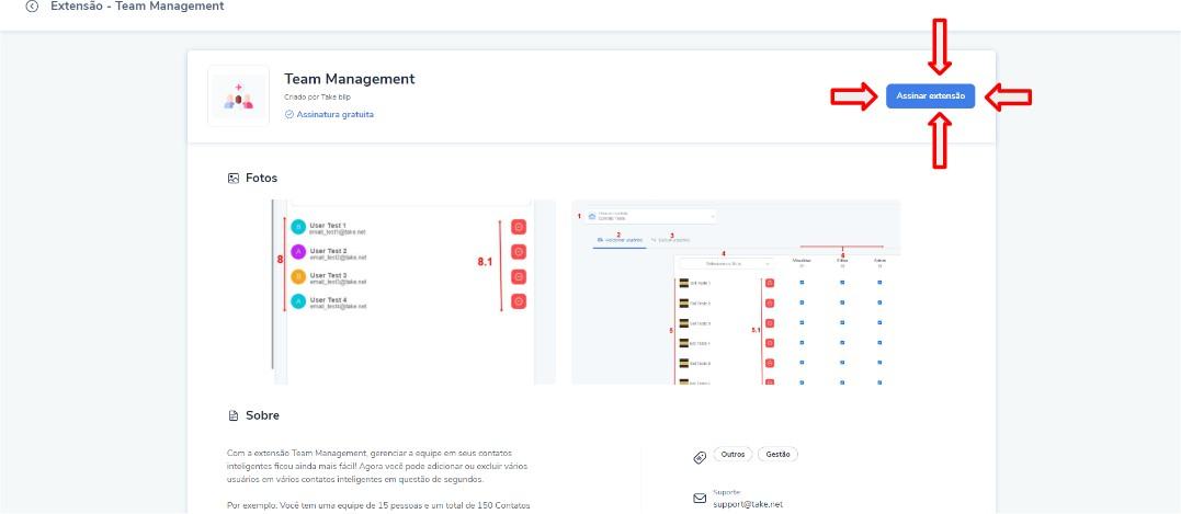 Team Management - General Documentation April 30, 2025 16:01 Updated Index Presentation About the extension Installation User manual by profile Dependencies Terms of Use Presentation The Team Management Plugin V2 extension was developed by Take Blip. It is currently in version 2.0 and is available in Portuguese. The main goal of the plugin is to simplify the management of user access to intelligent contacts. To achieve this, a simplified interface was developed, allowing users to add multiple users to multiple intelligent contacts with just a few clicks. In version 2.0 of Team Management, in addition to granting the standard access levels for viewing, editing, and administering bots, it is also possible to create and provide customized access. Additionally, there is a feature to remove user permissions from intelligent contacts. This manual aims to assist Blip platform users with the installation, configuration, and use of the Team Management Plugin extension. For any usage questions, please contact [SUPPORT EMAIL] or reach out to [SUPPORT PHONE NUMBER]. About the Extension The Team Management Plugin extension was developed with the goal of simplifying the process of managing user access to Blip's intelligent contacts. The following features are offered: Add multiple users to multiple intelligent contacts:It is possible to grant different levels of permissions to users, such as viewing, editing, and administration access.It is also possible to grant customized access by selecting each permission module within Blip, specifying which modules the user can view, edit, or not have access to.Remove multiple users from multiple intelligent contacts:This feature completely removes the user's access from the selected intelligent contacts.Important Note: To grant or revoke access, the user executing this action must have administrator access to both the contract and the bots for which they wish to manage access. Additionally, the following developments are planned: Availability of add and revoke customized user access functionality via API calls, enabling automated management of Blip access and integration with other access management systems. Installation The extension can be activated in any intelligent contact, whether of the router type or the builder type. Once activated, it is possible to start using the plugin. Important Note: To grant or revoke access, the user executing this action must have administrator access to both the contract and the bots for which they wish to manage access. Here is a step-by-step guide for installation: First, it is necessary to access an intelligent contact where the user has administrator access. Then, within that contact, go to the extensions tab, as shown in the following images: After accessing the extensions tab (as shown in the previous image), search for Team Management and click to access the extension’s page: Inside the plugin page, click the Add Extension button: If a terms and conditions acceptance screen appears, read the terms. If you agree, check the box "I accept the terms and conditions of use", and then click the "I accept" button: Once you accept the terms and conditions, a screen will appear to choose which chatbot you want to add the plugin to. Select the chatbot where you wish to install it, and then click the "Install Extension" button After this process, the plugin will be available within the intelligent contact, named "Team Manager": User Manual by Profile To grant or revoke access, the user executing this action must have administrator access to both the Blip contract and the chatbots where they wish to manage access. Dependencies There are no dependencies for using this extension. Terms of Use The user acknowledges and agrees that the plugins are not original developments from the Blip platform, and it is the user's responsibility to choose whether to use them or not.In the case of using the plugins, the user acknowledges that Take has no responsibility regarding their stability, operation, and/or maintenance, as well as the fact that such use may lead to the exposure of the chatbot data, in which case Take will be fully exempt from any responsibility for malfunction and/or data leaks. For more information, check out the discussion on this topic in our community or watch the videos on our channel. 😃 Related articles How to check if an attendant is available in Builder How to check available attendants by team Creating interactive messages in WhatsApp Builder variables Finding my bot's API-KEY