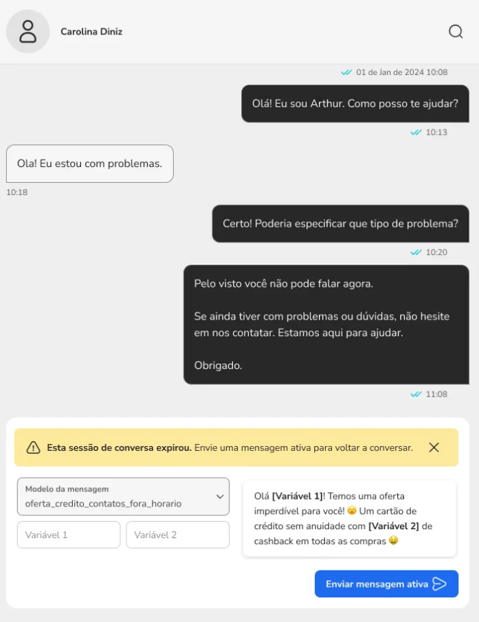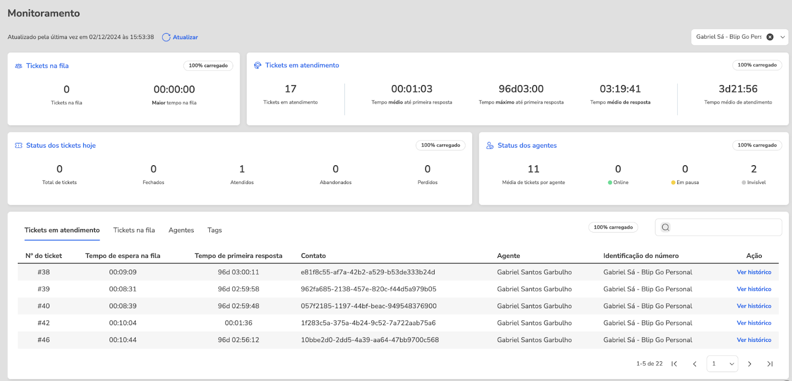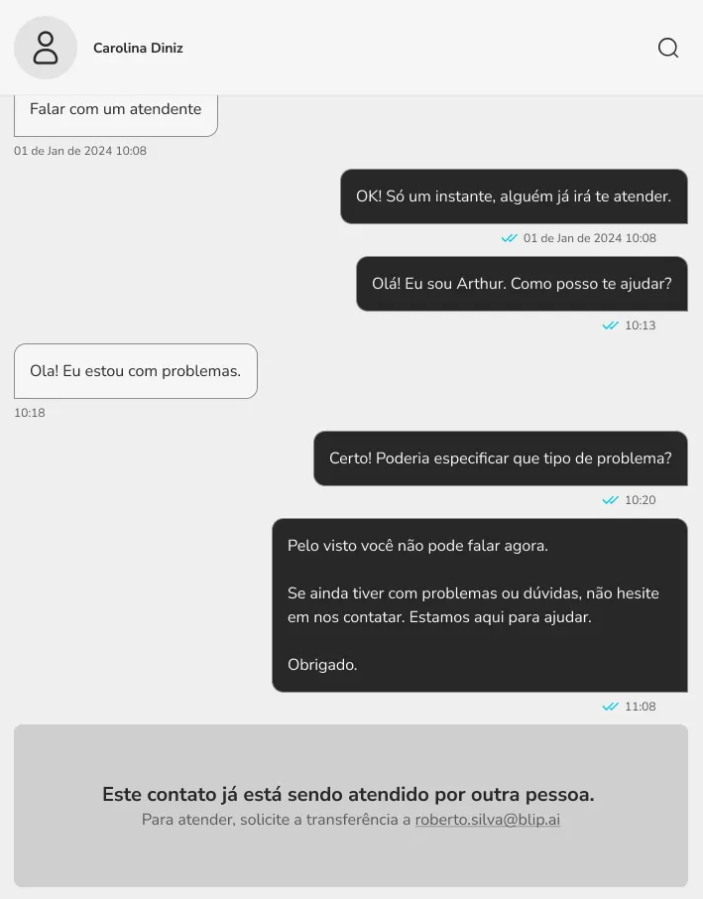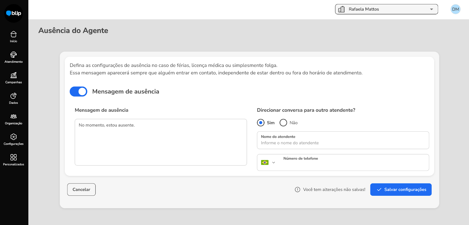 Blip Go Personal Service March 03, 2026 15:29 Updated Index Agent absence Blip Desk Desk Conversations Contacts After-hours contacts Conversation history Monitoring Quick replies/Ready-made responses FAQ Desk Conversation Agent absence How to access: Helpdesks > Agent absenceThis is a very common configuration that managers or agents can perform to inform their customers and leads about the agent's unavailability for a certain period of time, usually due to vacation or termination.In addition to informing about the absence, it is possible to configure a contact suggestion with another agent. In this way, the customer will have the opportunity to be served more effectively, ensuring that their needs are met even in the absence of the original agent.Characteristics The settings are applied to the number that is selected in the header (upper right corner of the page). The absence message will continue to be displayed as long as it is not deactivated. Blip Desk How to access: Helpdesks > Blip DeskBlip Desk is the official service interface for Blip Go Personal, designed to manage conversations through service tickets efficiently. The platform offers a variety of resources that facilitate the daily lives of agents, including ready-made responses (quick replies), notes about services and contacts, sending active messages, as well as the possibility of defining the online/offline status of the agent, among others.Although Blip Desk is accessible externally through the link https://desk.blip.ai, we recommend using the interface through Blip Go Personal, as this provides a more integrated experience and allows access to other product resources in a more fluid way.There is specific documentation for Blip Desk; access it through this link.Desk ConversationsOur goal with Desk Conversations is to better support continuous service, especially for agents who deal with customer portfolios and need to resume conversations frequently — something very common on WhatsApp.Desk Conversations was created to solve an immediate need: to reduce the friction for those who already provided service on WhatsApp and started using Desk.With Desk Conversations, you have:1. Contact-centered view Continuous timeline with unified history per contact. Message history: last 90 days on the timeline. Contact history: "forever" retention of contacts. It is possible to find old contacts. 2. Global search Search by name or phone. The search is performed across all bots to which the attendant is related, provided they have permissions. The "installations" selector at the top of the Desk Conversations screen is no longer necessary for the search to work correctly. Required permissions For the search to return contacts from a bot, the attendant needs to have permissions enabled in the bot, such as:Permission to send active messages (when applicable to the use case) 3. Resume conversation/Send active message on the same screen When clicking on a contact, the screen behavior may vary according to the state of the conversation and the service.If the contact is in service and the Meta window is open, the text field for sending a message will be displayed directly.If the contact is in service, but the Meta window has expired, a warning will be displayed informing that the conversation has expired, along with the active message sending component.If the contact is not in service at the moment, the history will be displayed (when it exists) and the active message sending component will appear, informing that it is necessary to send an active message to resume the conversation.In all these scenarios, the sending flow follows the well-known pattern: Select the template → Fill in the variables → Send the message.Important note: the use of templates for active messages remains mandatory due to Meta's restriction. The improvement lies in the ease of resuming conversations directly from the history, without navigation between menus.4. Contacts without conversation historyIt may happen that a contact returned by the search does not have a visible conversation history. This can occur in two cases: The contact has never conversed before; The contact has conversed before, but the history is older than 90 days and is no longer available in the conversation thread. In these situations, when clicking on the contact, a modal will be displayed informing that there is no conversation history available and guiding that the best way to resume contact is by sending an active message.Upon confirming the modal, the user will be directed to the traditional active message sending flow of Desk, with the contact's number already filled in, simply needing to select the template and send the message. 5. Contact in service by another agent The contact list is shared among the attendants of the same bot. Therefore, a contact returned by the search may be in service with another agent at the moment.In these cases, when clicking on the contact, the conversation history may be displayed normally (when it exists), however, the message sending field will not be available.Instead, a message will be displayed informing that the contact is being served by another agent, indicating the name of the person responsible for the service. To interact with this contact, it is necessary to request the transfer of the conversation.ContactsHow to access: Helpdesks > ContactsThis is a link that redirects to the contacts page on the Blip platform. Soon it will be a native page in Blip Go Personal, but for now, it works as follows:To choose the number whose contacts you want to view, access the "Home" page, choose the number in the select that appears in the header and click on the menu Helpdesks > Contacts.The page offers various resources to facilitate the visualization and search for information about contacts. It is possible to access conversations with customers, view the content conversed by automation (if activated), see open tickets, and the interaction history of the last thr