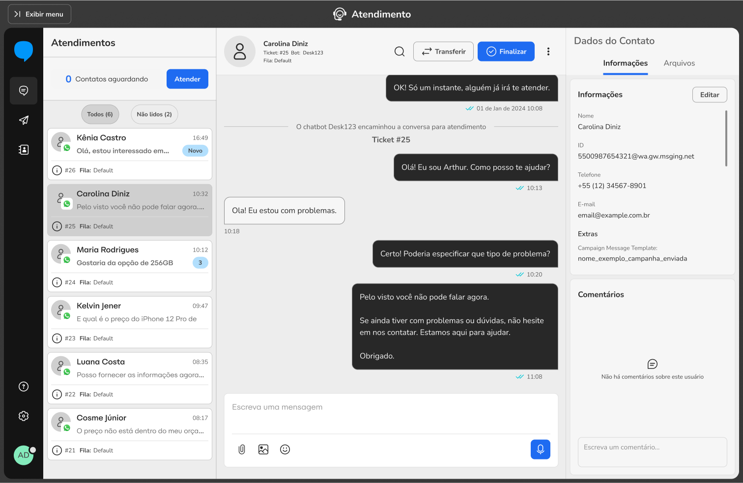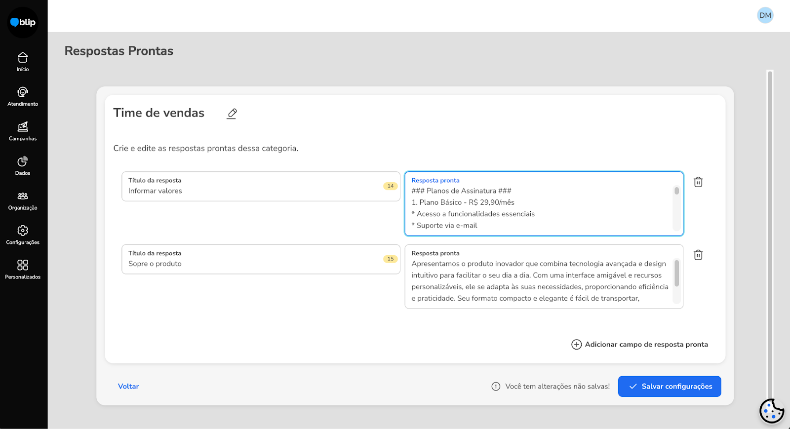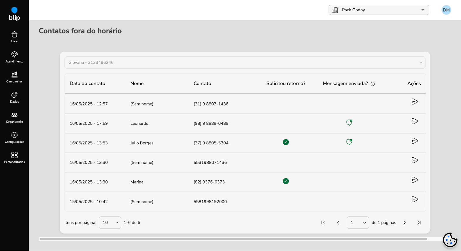 Blip Go Personal Service March 03, 2026 15:29 Updated Index Agent absence Blip Desk Desk Conversations Contacts After-hours contacts Conversation history Monitoring Quick replies/Ready-made responses FAQ Desk Conversation Agent absence How to access: Helpdesks > Agent absenceThis is a very common configuration that managers or agents can perform to inform their customers and leads about the agent's unavailability for a certain period of time, usually due to vacation or termination.In addition to informing about the absence, it is possible to configure a contact suggestion with another agent. In this way, the customer will have the opportunity to be served more effectively, ensuring that their needs are met even in the absence of the original agent.Characteristics The settings are applied to the number that is selected in the header (upper right corner of the page). The absence message will continue to be displayed as long as it is not deactivated. Blip Desk How to access: Helpdesks > Blip DeskBlip Desk is the official service interface for Blip Go Personal, designed to manage conversations through service tickets efficiently. The platform offers a variety of resources that facilitate the daily lives of agents, including ready-made responses (quick replies), notes about services and contacts, sending active messages, as well as the possibility of defining the online/offline status of the agent, among others.Although Blip Desk is accessible externally through the link https://desk.blip.ai, we recommend using the interface through Blip Go Personal, as this provides a more integrated experience and allows access to other product resources in a more fluid way.There is specific documentation for Blip Desk; access it through this link.Desk ConversationsOur goal with Desk Conversations is to better support continuous service, especially for agents who deal with customer portfolios and need to resume conversations frequently — something very common on WhatsApp.Desk Conversations was created to solve an immediate need: to reduce the friction for those who already provided service on WhatsApp and started using Desk.With Desk Conversations, you have:1. Contact-centered view Continuous timeline with unified history per contact. Message history: last 90 days on the timeline. Contact history: "forever" retention of contacts. It is possible to find old contacts. 2. Global search Search by name or phone. The search is performed across all bots to which the attendant is related, provided they have permissions. The "installations" selector at the top of the Desk Conversations screen is no longer necessary for the search to work correctly. Required permissions For the search to return contacts from a bot, the attendant needs to have permissions enabled in the bot, such as:Permission to send active messages (when applicable to the use case) 3. Resume conversation/Send active message on the same screen When clicking on a contact, the screen behavior may vary according to the state of the conversation and the service.If the contact is in service and the Meta window is open, the text field for sending a message will be displayed directly.If the contact is in service, but the Meta window has expired, a warning will be displayed informing that the conversation has expired, along with the active message sending component.If the contact is not in service at the moment, the history will be displayed (when it exists) and the active message sending component will appear, informing that it is necessary to send an active message to resume the conversation.In all these scenarios, the sending flow follows the well-known pattern: Select the template → Fill in the variables → Send the message.Important note: the use of templates for active messages remains mandatory due to Meta's restriction. The improvement lies in the ease of resuming conversations directly from the history, without navigation between menus.4. Contacts without conversation historyIt may happen that a contact returned by the search does not have a visible conversation history. This can occur in two cases: The contact has never conversed before; The contact has conversed before, but the history is older than 90 days and is no longer available in the conversation thread. In these situations, when clicking on the contact, a modal will be displayed informing that there is no conversation history available and guiding that the best way to resume contact is by sending an active message.Upon confirming the modal, the user will be directed to the traditional active message sending flow of Desk, with the contact's number already filled in, simply needing to select the template and send the message. 5. Contact in service by another agent The contact list is shared among the attendants of the same bot. Therefore, a contact returned by the search may be in service with another agent at the moment.In these cases, when clicking on the contact, the conversation history may be displayed normally (when it exists), however, the message sending field will not be available.Instead, a message will be displayed informing that the contact is being served by another agent, indicating the name of the person responsible for the service. To interact with this contact, it is necessary to request the transfer of the conversation.ContactsHow to access: Helpdesks > ContactsThis is a link that redirects to the contacts page on the Blip platform. Soon it will be a native page in Blip Go Personal, but for now, it works as follows:To choose the number whose contacts you want to view, access the "Home" page, choose the number in the select that appears in the header and click on the menu Helpdesks > Contacts.The page offers various resources to facilitate the visualization and search for information about contacts. It is possible to access conversations with customers, view the content conversed by automation (if activated), see open tickets, and the interaction history of the last thr