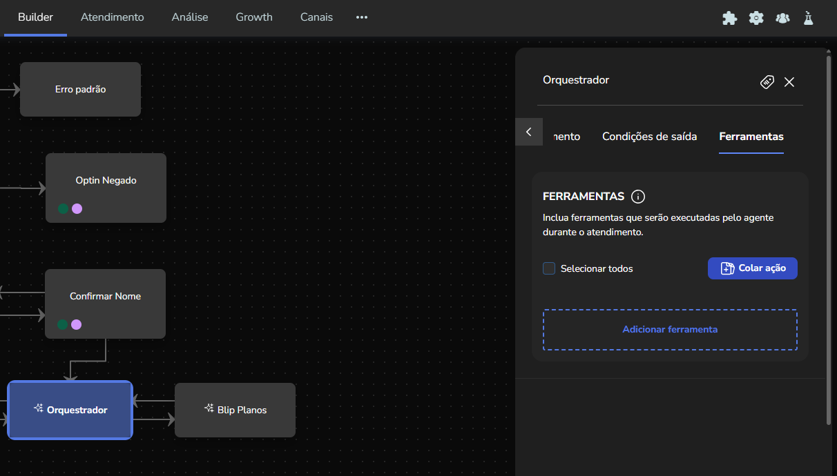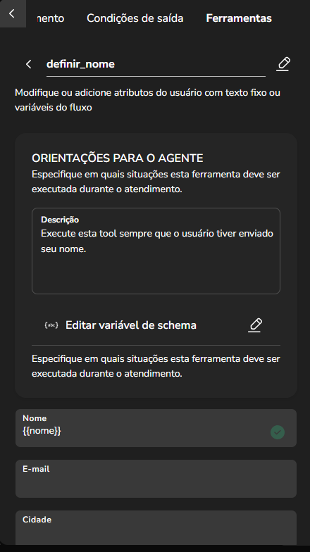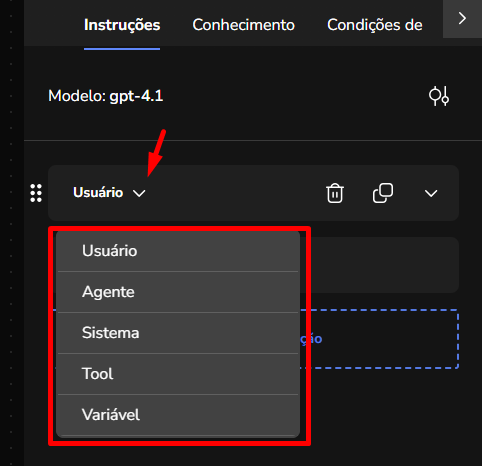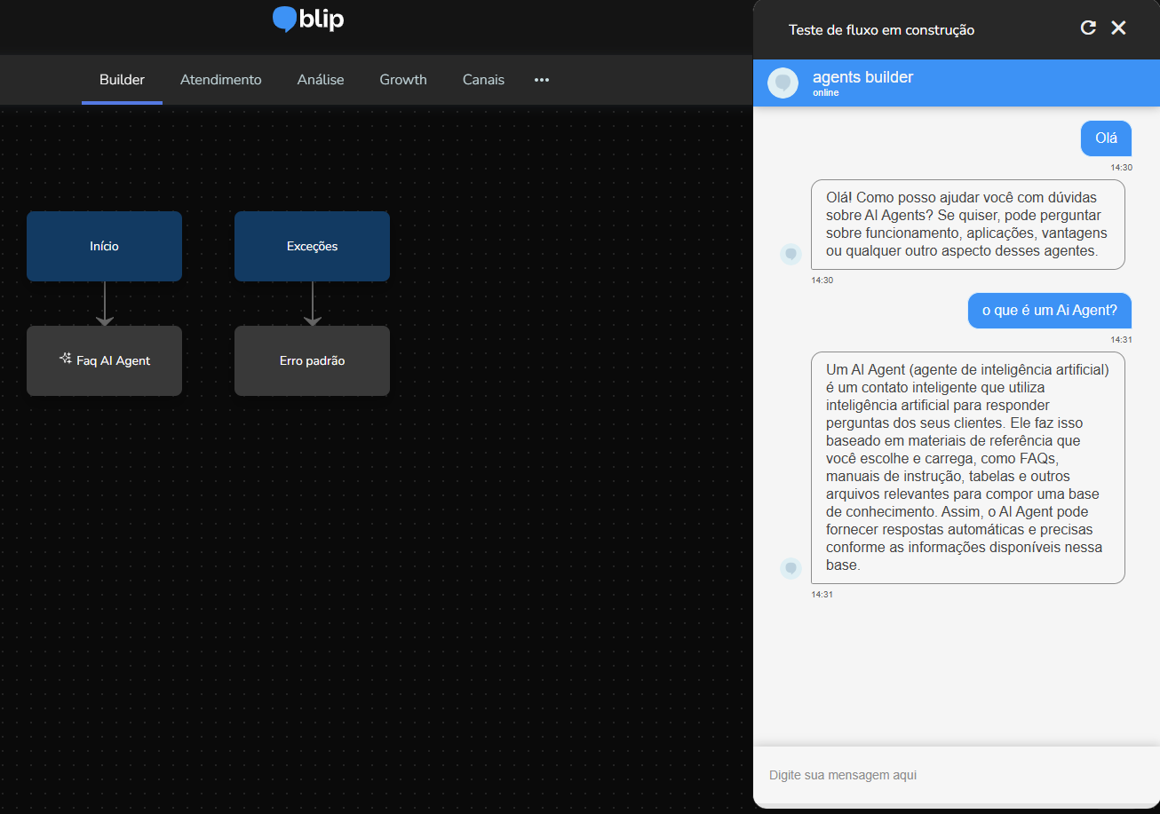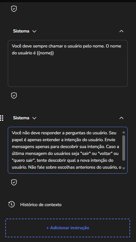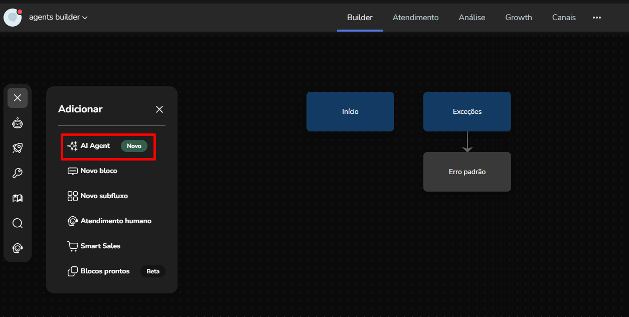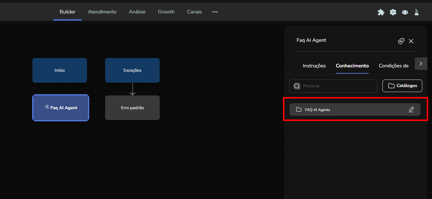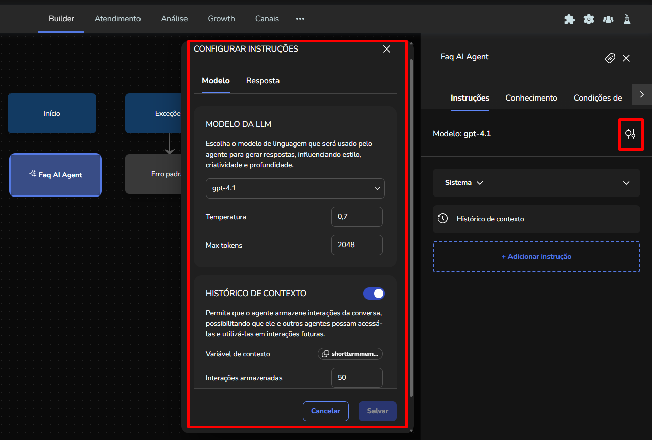 Agent Builder September 23, 2025 16:17 Updated Index Introduction Creating and configuring agents in the builder How to create an AI Agent block How to configure the AI Agent block Renaming the AI Agent Configuring the Instructions tab Configuring the Knowledge tab Configuring the Exit Conditions tab Configuring the Tools tab IntroductionThe Agent Builder is designed to enable the creation and customization of Artificial Intelligence agents in a visual and intuitive way. With it, you can personalize your agent's behavior, define its knowledge base, set exit conditions for the flow, and integrate external tools.This tool centralizes all the resources needed for you to build and manage intelligent agents in an intuitive manner. Creating and configuring agents in the builder Note: At the end of each example, you will find the configuration JSON file. You can copy it and import it directly into the builder to make any adjustments you want.How to create an AI Agent block On the builder screen, click Add block and choose the AI Agent option.A new AI Agent block is added to the builder.How to configure the AI Agent blockBy clicking on the created AI Agent, you can configure it through the side menu.Renaming the AI AgentFirst, you can rename the block to make it easier to identify. In the following example, the Smart Contact will be a FAQ about AI Agents. Configuring the Instructions tabIn this section, you can customize your AI Agent to meet your needs. Choose the language model (LLM), set the temperature and maximum number of tokens, enter the agent’s initial instructions, among other options.Accurate configuration is essential to optimize your agent’s performance.To configure a model, click the Open model settings button next to the model indication in the Instructions tab. The Configure Instructions screen will be displayed.In the Model tab, you can choose the version of the model to be used from the dropdown menu.Still in this tab, you can:Set the model’s temperature;Set the maximum number of tokens;Enable/disable context history (short-term memory).In the Response tab, it is possible to:Define whether the agent’s response will be sent to the user in the service channel or stored in a variable.Set the agent’s response format, with the option to choose from various formats (including a custom format).After setting the agent’s configurations, simply click Save. If no changes were made, just click Cancel.Still in the Instructions tab, it is possible to configure instructions for the AI Agent. For each instruction, you can select its level, choosing from: User, Agent, System, Tool, Variable. Let’s go through each one:After setting the agent’s configurations, simply click Save. If no changes were made, just click Cancel.Still in the Instructions tab, it is possible to configure instructions for the AI Agent. For each instruction, you can select its level, choosing from: User, Agent, System, Tool, Variable. Let’s go through each one:System LevelThe system level defines the persona and general behavior of the agent. It is the most fundamental instruction, guiding how the AI should behave.Example: "You are a Python programming expert. Respond clearly and concisely, providing code examples whenever possible."User LevelThe user level is a direct question or command given to the agent during its initial configuration. This allows passing the user’s name to the agent, for example.Example: "Hello, my name is {{contact.name}}."Agent LevelThe agent level is where instructions on how the agent should respond are provided. This level acts as an intermediary layer between the user and system levels to optimize the agent’s workflow.Example: You can instruct the agent to create a step-by-step sequence to solve the user’s problem, such as: "Step 1: Understand the user’s problem. Step 2: Generate the Python code. Step 3: Explain the generated code."Tool LevelThe tool level refers to the instructions the AI agent receives to interact with external resources. These tools can be an API, a database, or a search engine.Example: The agent can be instructed to use a specific API to obtain the temperature, such as "openweathermap."Variable LevelThe variable level refers to specific data that the AI should use, such as names, dates, locations, or any information that changes depending on the context.Example: If you want to know the temperature of a city, you can use a variable like city, and the AI would use the Tool to get the temperature for the city corresponding to that variable.In practice:Add an instructionSelect the instruction level:Enter the instruction:In the System and Agent instructions, you will see a shield icon. It provides suggested guardrail instructions that you can add to your agent. Simply copy them and insert them into the instruction. For this example, we will create a new system instruction and add a guardrail for the knowledge base.For each instruction, it is possible to perform actions to remove or duplicate the instruction using the buttons:It is possible to move the instruction by clicking and dragging it using the side button (six dots) that appears when you hover over it. This allows you to organize the order of instructions, which is crucial for the agent’s behavior.If the context history option is enabled in the model settings, it will also appear in the Instructions screen and can be arranged along with the other instructions.Configuring the Knowledge tabMoving on to the Knowledge tab, the following is displayed when opening it for the first time:For the agent to access information, it needs catalogs. These catalogs centralize knowledge from files and URLs, organizing everything around the same topic. To learn more about catalogs, refer to the tutorial on Knowledge Base.Since your agent has just been created, it does not have any linked catalogs yet. To add one, simply click the Catalogs button or + Add catalog.Clicking either button opens the Manage Catalogs wi