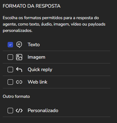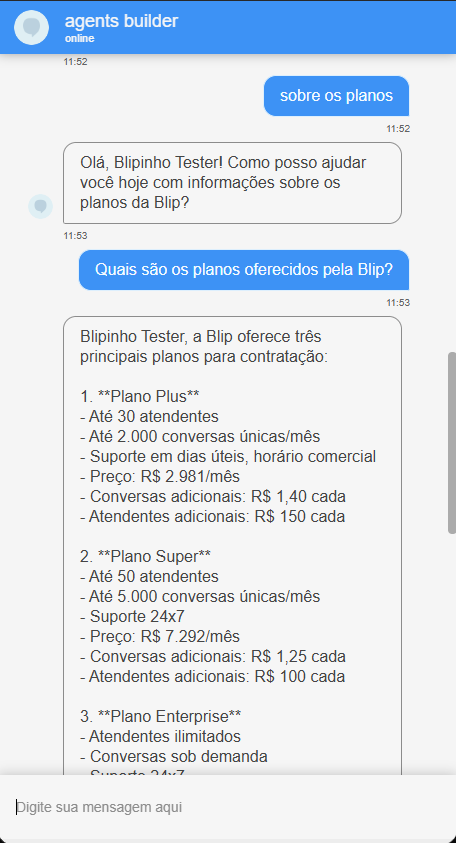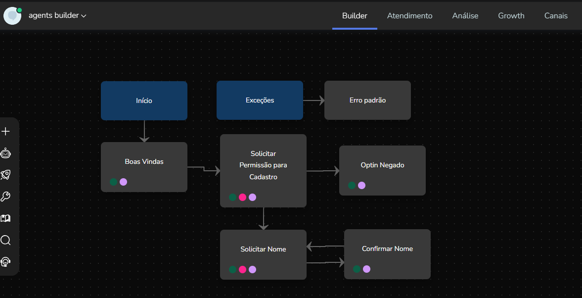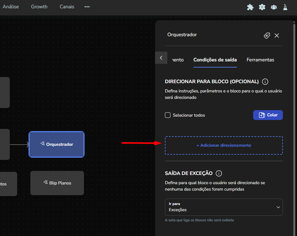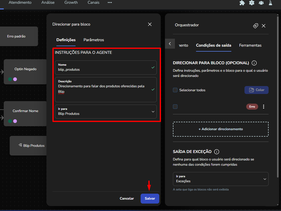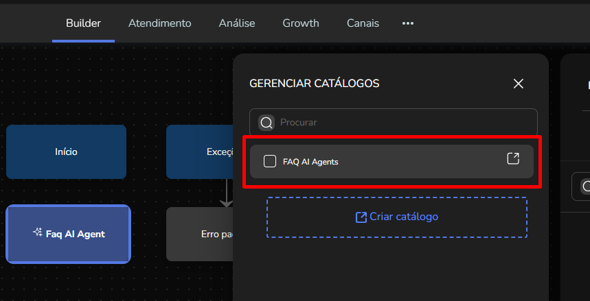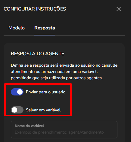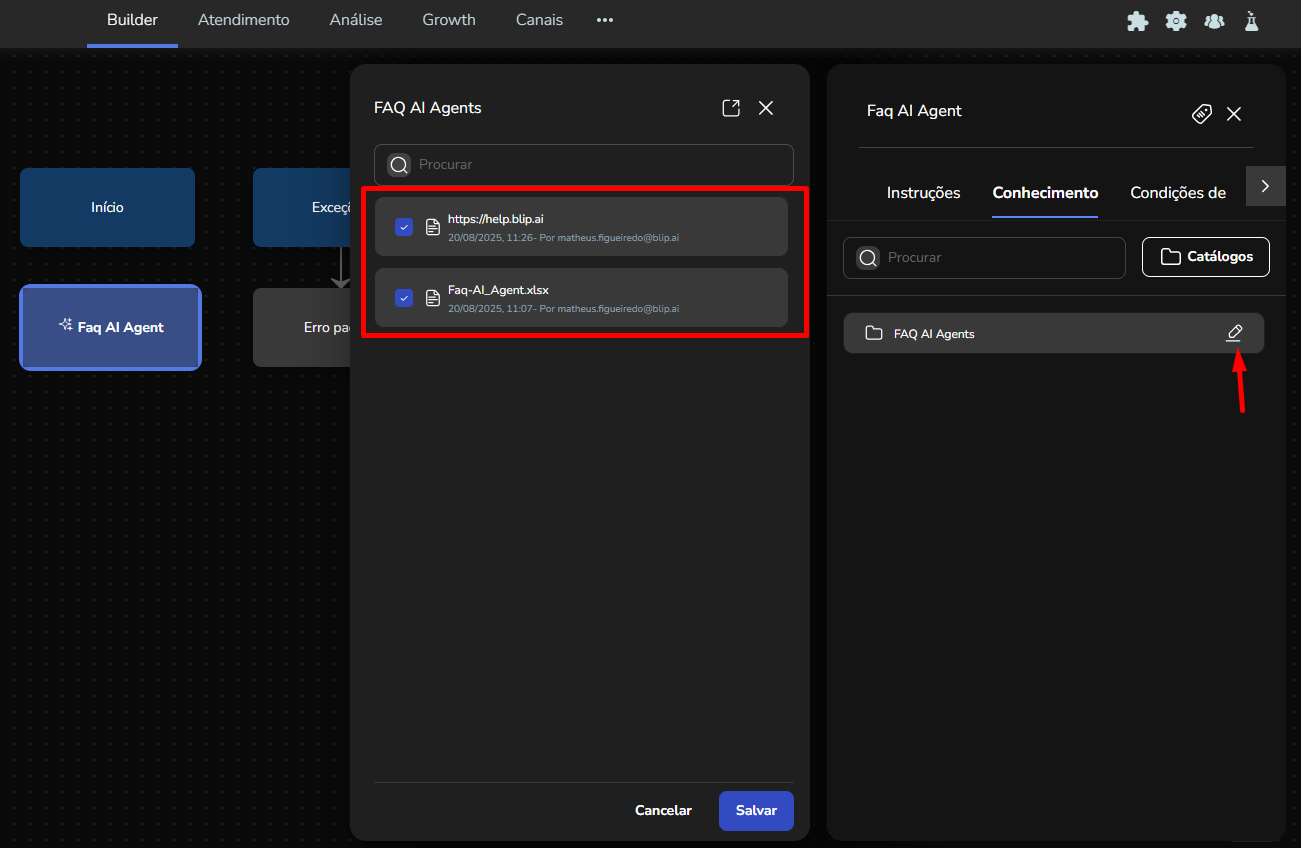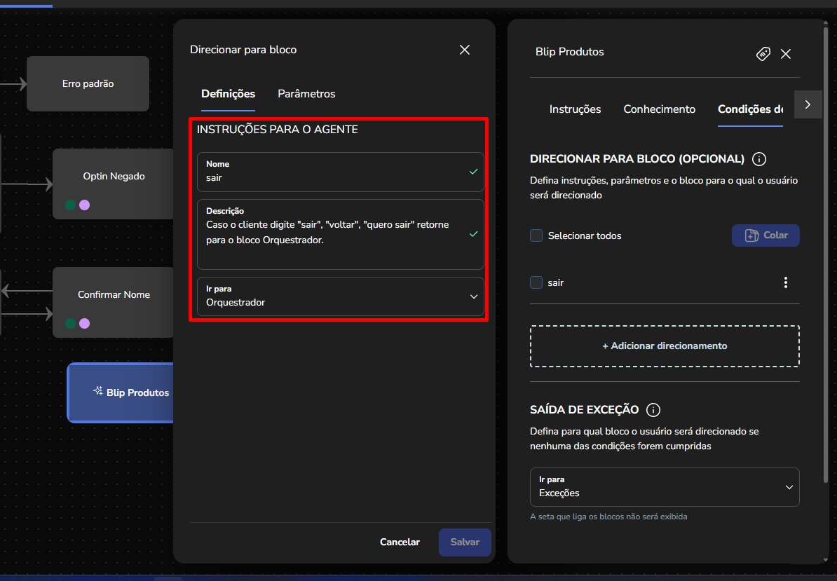 Agent Builder September 23, 2025 16:17 Updated Index Introduction Creating and configuring agents in the builder How to create an AI Agent block How to configure the AI Agent block Renaming the AI Agent Configuring the Instructions tab Configuring the Knowledge tab Configuring the Exit Conditions tab Configuring the Tools tab IntroductionThe Agent Builder is designed to enable the creation and customization of Artificial Intelligence agents in a visual and intuitive way. With it, you can personalize your agent's behavior, define its knowledge base, set exit conditions for the flow, and integrate external tools.This tool centralizes all the resources needed for you to build and manage intelligent agents in an intuitive manner. Creating and configuring agents in the builder Note: At the end of each example, you will find the configuration JSON file. You can copy it and import it directly into the builder to make any adjustments you want.How to create an AI Agent block On the builder screen, click Add block and choose the AI Agent option.A new AI Agent block is added to the builder.How to configure the AI Agent blockBy clicking on the created AI Agent, you can configure it through the side menu.Renaming the AI AgentFirst, you can rename the block to make it easier to identify. In the following example, the Smart Contact will be a FAQ about AI Agents. Configuring the Instructions tabIn this section, you can customize your AI Agent to meet your needs. Choose the language model (LLM), set the temperature and maximum number of tokens, enter the agent’s initial instructions, among other options.Accurate configuration is essential to optimize your agent’s performance.To configure a model, click the Open model settings button next to the model indication in the Instructions tab. The Configure Instructions screen will be displayed.In the Model tab, you can choose the version of the model to be used from the dropdown menu.Still in this tab, you can:Set the model’s temperature;Set the maximum number of tokens;Enable/disable context history (short-term memory).In the Response tab, it is possible to:Define whether the agent’s response will be sent to the user in the service channel or stored in a variable.Set the agent’s response format, with the option to choose from various formats (including a custom format).After setting the agent’s configurations, simply click Save. If no changes were made, just click Cancel.Still in the Instructions tab, it is possible to configure instructions for the AI Agent. For each instruction, you can select its level, choosing from: User, Agent, System, Tool, Variable. Let’s go through each one:After setting the agent’s configurations, simply click Save. If no changes were made, just click Cancel.Still in the Instructions tab, it is possible to configure instructions for the AI Agent. For each instruction, you can select its level, choosing from: User, Agent, System, Tool, Variable. Let’s go through each one:System LevelThe system level defines the persona and general behavior of the agent. It is the most fundamental instruction, guiding how the AI should behave.Example: "You are a Python programming expert. Respond clearly and concisely, providing code examples whenever possible."User LevelThe user level is a direct question or command given to the agent during its initial configuration. This allows passing the user’s name to the agent, for example.Example: "Hello, my name is {{contact.name}}."Agent LevelThe agent level is where instructions on how the agent should respond are provided. This level acts as an intermediary layer between the user and system levels to optimize the agent’s workflow.Example: You can instruct the agent to create a step-by-step sequence to solve the user’s problem, such as: "Step 1: Understand the user’s problem. Step 2: Generate the Python code. Step 3: Explain the generated code."Tool LevelThe tool level refers to the instructions the AI agent receives to interact with external resources. These tools can be an API, a database, or a search engine.Example: The agent can be instructed to use a specific API to obtain the temperature, such as "openweathermap."Variable LevelThe variable level refers to specific data that the AI should use, such as names, dates, locations, or any information that changes depending on the context.Example: If you want to know the temperature of a city, you can use a variable like city, and the AI would use the Tool to get the temperature for the city corresponding to that variable.In practice:Add an instructionSelect the instruction level:Enter the instruction:In the System and Agent instructions, you will see a shield icon. It provides suggested guardrail instructions that you can add to your agent. Simply copy them and insert them into the instruction. For this example, we will create a new system instruction and add a guardrail for the knowledge base.For each instruction, it is possible to perform actions to remove or duplicate the instruction using the buttons:It is possible to move the instruction by clicking and dragging it using the side button (six dots) that appears when you hover over it. This allows you to organize the order of instructions, which is crucial for the agent’s behavior.If the context history option is enabled in the model settings, it will also appear in the Instructions screen and can be arranged along with the other instructions.Configuring the Knowledge tabMoving on to the Knowledge tab, the following is displayed when opening it for the first time:For the agent to access information, it needs catalogs. These catalogs centralize knowledge from files and URLs, organizing everything around the same topic. To learn more about catalogs, refer to the tutorial on Knowledge Base.Since your agent has just been created, it does not have any linked catalogs yet. To add one, simply click the Catalogs button or + Add catalog.Clicking either button opens the Manage Catalogs wi