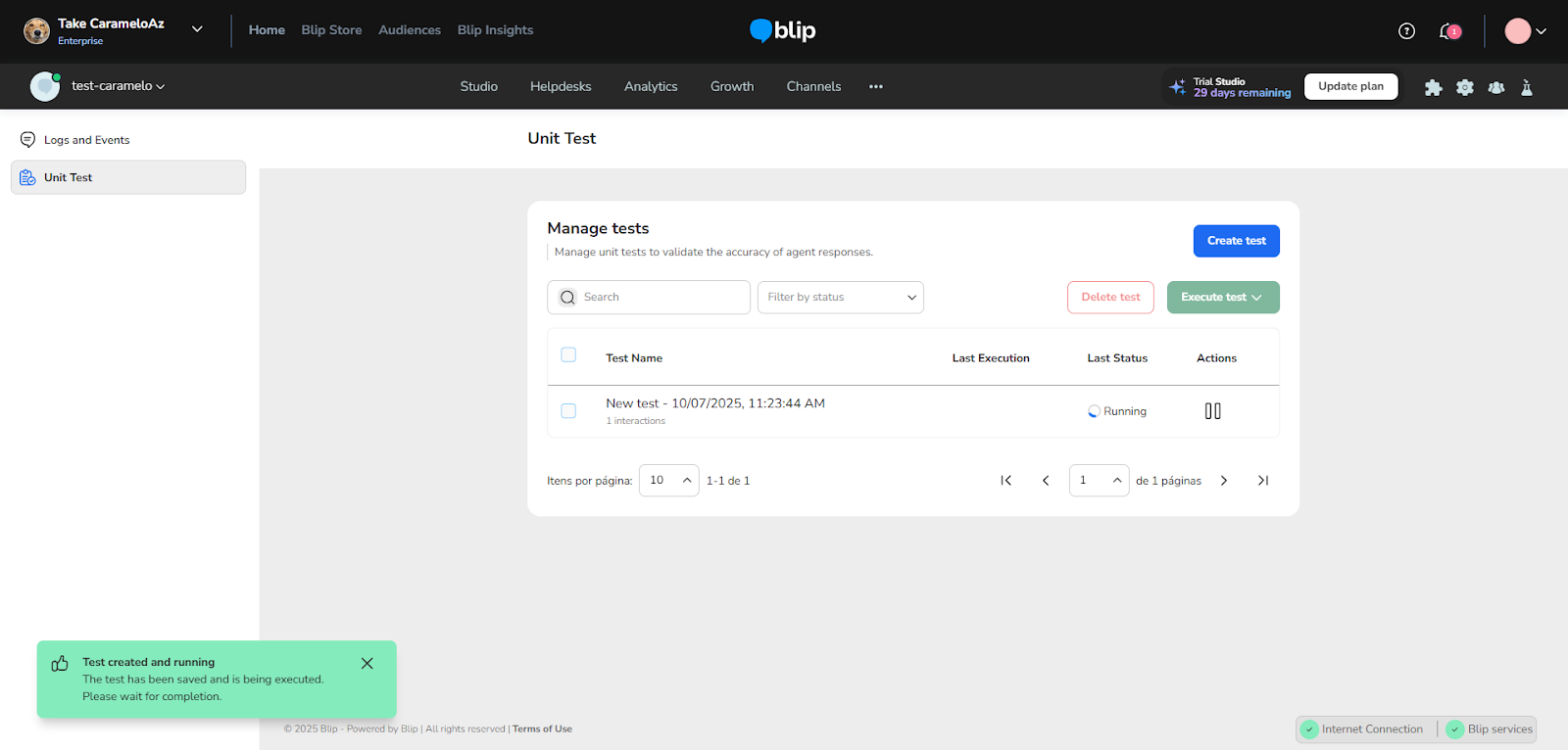 Unit Tests October 22, 2025 14:08 Updated Index: Introduction How to access Unit Tests Managing Unit Tests Create test Other features Setting up a unit test Variables Definitions Running and analyzing tests IntroductionThe Unit Test feature allows you to validate the accuracy of your conversational flow responses, whether deterministic or AI-based. This tool is essential to ensure that expected behaviors are correct before deploying to production, making it easier to maintain and continuously improve your Smart Contact.How to Access Unit TestsYou can open Unit Tests in two ways:Home Screen:In the upper right corner, click the icon.From the menu, select Tests and Logs.Side Menu:On the left side menu, click Unit Tests.Managing Unit TestsThe unit test management screen is the starting point to view, create, and run tests for your bot or AI agent.Create TestClick the Create test button in the upper right corner, or if no tests have been created yet, click the centered Create new test button. You can fill in all test parameters manually or import a settings file by clicking:Import settings: Upload a file in Blip's format with pre-configured tests.Other FeaturesSearch: Search field to find specific tests by name.Test list: Displays all created unit tests with the following details:Test name: Name assigned to the test.Interactions: Total number of configured interactions.Last run: Date and time of the last test execution.Last status: Result of the last test run, which can be:Waiting to run: Test created but not yet executed.Success: All interactions passed successfully (e.g., "Success 18/18").Metric failure: Some interactions failed (e.g., "Metric failure 25/57").Start error: Test could not be executed due to an error (e.g., "Start error 2/3").Interrupted: Test was stopped during execution.Delete tests: Remove one or more tests.Run tests: Execute one or more selected tests.Setting Up a Unit TestWhen creating or editing a test, you will access three configuration tabs: Definitions, Variables, and Interactions.InteractionsThis tab is where you define the sequence of questions and answers to validate your bot or AI agent's behavior.Order: The execution order of interactions (you can reorder by dragging grid icons).Description: The input text to be sent to the bot.Result: The status after running the test:Waiting to runSuccessStart errorMetric failureInterruptedConfiguring an Interaction:Click on an interaction to expand and configure it in detail.Input type:Text: The text sent to the bot (e.g., "What are your working hours?").ImageResponse match:Exact: Bot’s response must match exactly.Similar: Bot’s response must be similar to the expected answer.Similarity level: Define the required match percentage.Expected responses:Text: Add the expected text response (e.g., "Our store is open from 8 AM to 6 PM").Image: Add an expected image response.Last received response: Displays the bot's actual response during the last test for comparison.VariablesIn this tab, manage the context variables used in the test flow. Add, edit, or remove the variables your bot or agent may need to start the flow correctly.Type: context or contactName: Variable name (e.g., numbercpf)Value: Value of the variable (e.g., 129.452.875-06)New variable: Add a new variableDefinitionsIn this tab, define the timeout for test execution.Response timeout: Use the slider to set the max response time per interaction. If the bot takes longer than the defined time, the interaction is considered a failure.Running and Analyzing TestsClick Save after configuring the test.In the test list, select the test and click Run tests.View the status and click the test to analyze results.Interactions marked as Metric failure or Start error indicate areas that need fixing. For more information, visit the discussion on the subject at our community or videos on our channel. 😃 Related articles Unit Tests Agent Builder Audience file configuration - Bulk notification sending Brain How to test your NLP model