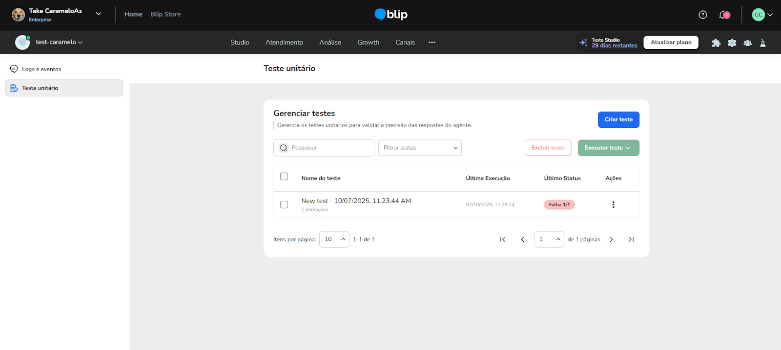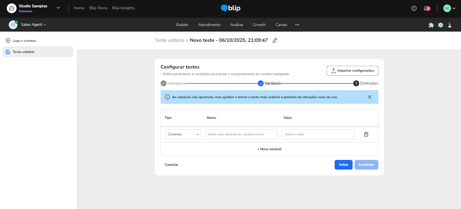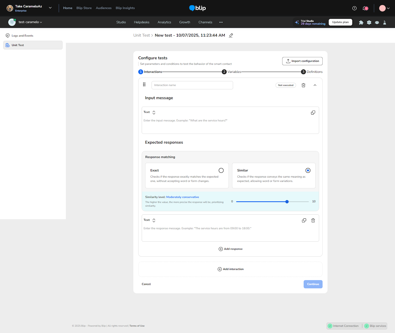 Unit Tests October 22, 2025 14:08 Updated Index: Introduction How to access Unit Tests Managing Unit Tests Create test Other features Setting up a unit test Variables Definitions Running and analyzing tests IntroductionThe Unit Test feature allows you to validate the accuracy of your conversational flow responses, whether deterministic or AI-based. This tool is essential to ensure that expected behaviors are correct before deploying to production, making it easier to maintain and continuously improve your Smart Contact.How to Access Unit TestsYou can open Unit Tests in two ways:Home Screen:In the upper right corner, click the icon.From the menu, select Tests and Logs.Side Menu:On the left side menu, click Unit Tests.Managing Unit TestsThe unit test management screen is the starting point to view, create, and run tests for your bot or AI agent.Create TestClick the Create test button in the upper right corner, or if no tests have been created yet, click the centered Create new test button. You can fill in all test parameters manually or import a settings file by clicking:Import settings: Upload a file in Blip's format with pre-configured tests.Other FeaturesSearch: Search field to find specific tests by name.Test list: Displays all created unit tests with the following details:Test name: Name assigned to the test.Interactions: Total number of configured interactions.Last run: Date and time of the last test execution.Last status: Result of the last test run, which can be:Waiting to run: Test created but not yet executed.Success: All interactions passed successfully (e.g., "Success 18/18").Metric failure: Some interactions failed (e.g., "Metric failure 25/57").Start error: Test could not be executed due to an error (e.g., "Start error 2/3").Interrupted: Test was stopped during execution.Delete tests: Remove one or more tests.Run tests: Execute one or more selected tests.Setting Up a Unit TestWhen creating or editing a test, you will access three configuration tabs: Definitions, Variables, and Interactions.InteractionsThis tab is where you define the sequence of questions and answers to validate your bot or AI agent's behavior.Order: The execution order of interactions (you can reorder by dragging grid icons).Description: The input text to be sent to the bot.Result: The status after running the test:Waiting to runSuccessStart errorMetric failureInterruptedConfiguring an Interaction:Click on an interaction to expand and configure it in detail.Input type:Text: The text sent to the bot (e.g., "What are your working hours?").ImageResponse match:Exact: Bot’s response must match exactly.Similar: Bot’s response must be similar to the expected answer.Similarity level: Define the required match percentage.Expected responses:Text: Add the expected text response (e.g., "Our store is open from 8 AM to 6 PM").Image: Add an expected image response.Last received response: Displays the bot's actual response during the last test for comparison.VariablesIn this tab, manage the context variables used in the test flow. Add, edit, or remove the variables your bot or agent may need to start the flow correctly.Type: context or contactName: Variable name (e.g., numbercpf)Value: Value of the variable (e.g., 129.452.875-06)New variable: Add a new variableDefinitionsIn this tab, define the timeout for test execution.Response timeout: Use the slider to set the max response time per interaction. If the bot takes longer than the defined time, the interaction is considered a failure.Running and Analyzing TestsClick Save after configuring the test.In the test list, select the test and click Run tests.View the status and click the test to analyze results.Interactions marked as Metric failure or Start error indicate areas that need fixing. For more information, visit the discussion on the subject at our community or videos on our channel. 😃 Related articles Unit Tests Agent Builder Brain Block libraries - Ready-made skills How to connect to a personalized service channel