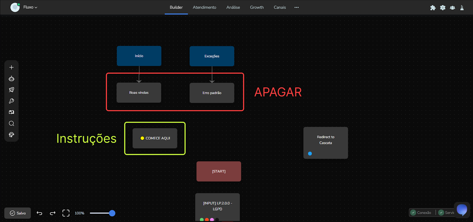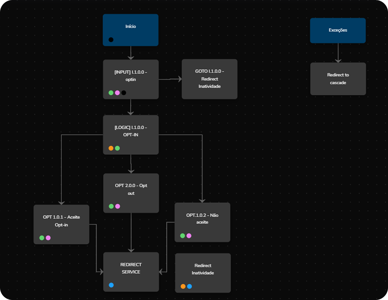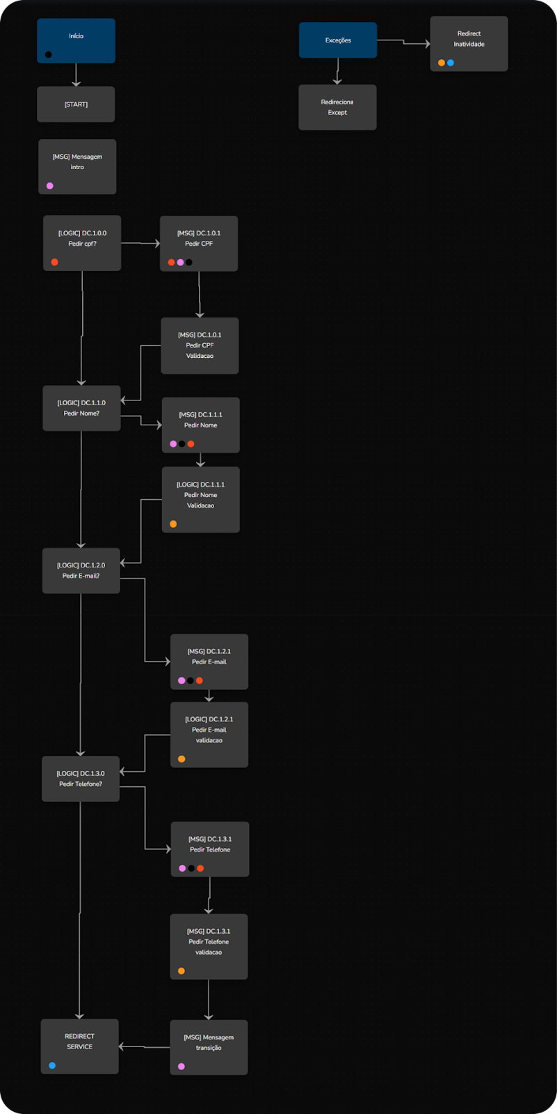 Block libraries - Ready-made skills January 23, 2026 19:10 Updated Introduction Basic concepts Macro view The library Skills Registration Agent Use case - Lead Qualification IntroductionThe block library was created to facilitate the day-to-day of those who need to build an intelligent contact without having deep technical mastery and need speed to publish. With it, it will be possible to apply both basic deterministic skills such as Onboarding, LGPD, Inactivity, Validation cascade, Something else, Finalization, and CSAT as well as structures using builder agents. Basic concepts The structure for using ready-made blocks is designed in the router architecture for proper functioning, where each set of ready-made blocks will stay within a builder/Studio connected to a router. In this way, the intelligent contact is easy to maintain and evolve.Is it possible to use ready-made blocks within a single builder/Studio? Yes, it is possible, but there will be a challenge to perform evolutions and maintenance due to the interconnection between the blocks, where if you need to edit a specific part of the structure, it will be necessary to understand which other parts are connected to the part that will be edited or evolved, thus causing a high expenditure of time to configure. Macro view Before starting to use the library, it is important to have the conversational structure that will be made well-defined and how the parts of this conversation will interact with each other. Normally, a conversation has a beginning, middle, and end, following a main objective. The macro view is very similar to BPMN flowcharts. In this view, it is important to visualize the paths, the decision triggers, and to have symbols that represent the events within the conversation structure. The library The block library is divided into Skills, Agents, and Use Cases. Skill is a set of standard blocks with a specific objective within the intelligent contact conversation. Agent can be an agent block or a set of agent blocks and standard blocks, where agent blocks are fundamental for the specific objective within the intelligent contact. Use case is a set of skills and agents for a specific objective within an intelligent contact journey. Each option within the library has a tag and can be searched in the search bar as represented in the image below: Ready-made blocks Skills: Onboarding LGPD Inactivity Opt-In/Out Something Else Finalization CSAT Human Handoff Personal Data Validation Cascade Agent: Use case: Registration Lead Qualification Skills Onboarding Guides and welcomes the user, explaining how to start using the service and performs greeting or return procedures and checks if the LGPD has already been answered. Block | [LOGIC] A.1.0.0 Input validation The {isNewUser} variable is used within the output conditions to understand if it is the first time the person is talking to the contact and direct them to the corresponding block. Source event tracking action. Block | [MSG] A.2.0.0 Yes validation Message content for the user's first access, source and display event tracking actions, and definition of the {isNewUser} variable in the actions. The output condition is only if the user's response exists. Block | [MSG] A.3.0.0 No validation Message content for the user's return, source and display event tracking actions. The output condition is only if the user's response exists. Block | [LOGIC] LP.1.0.0 - LGPD Validation Validation of whether the person has already answered the LGPD terms. Through the validation of whether the {userAceptedPrivacyPolicy} variable exists and if it is equal to the user's response being yes or no to the acceptance. Source event tracking action, LGPD validation, and LGPD did not answer. Block | REDIRECT SERVICE Service redirection action to another service/skill within the output action. LGPD: Explains briefly what the LGPD is and collects the user's acceptance so that the Intelligent Contact can collect sensitive data. Block | [START] Skill input using the exit condition if the variable {input.content@redirectId} exists and directs by the block ID. Block | [INPUT] LP.2.0.0 - LGPD Description about the LGPD with the link to see in more detail along with the options for the person to select if they accept, do not accept, and learn more. Block | [LOGIC] LP.2.0.0 - [No] LGPD Acceptance Performs the validation through a script of the chosen option. Block | GOTO LP.2.0.0 - Service Name Redirects to the service/skill in case the person has accepted the terms of the agreement. Block | [INPUT] LP.3.0.0 - Does not agree with LGPD If the person does not accept the terms, a message is shown reinforcing that acceptance is necessary to continue with the conversation. Presents the same options yes, no, and learn more. Block | LP.4.0.0 - Learn More Detail about the LGPD. Block | [LOGIC] LP.3.0.0 - Does not agree with LGPD Performs the validation through a script of the chosen option. Block | GOTO LP.3.0.0 - Service Name Redirects to the service/skill in case the person has accepted the terms of the agreement. Block | REDIRECT SERVICE Service redirection action to another service/skill within the exit action. Block | Inactivity Redirect Redirection to the inactivity skill and return to the point where it is waiting for a user input. Inactivity: Sends a message to rescue the user's conversation with the Intelligent Contact after an inactive period. Block | [INPUT] I.1.0.0 - Inactivity Shows the message and requests if the person wants to continue in the conversation. Block | [LOGIC] I.1.0.0 - Inactivity Through the variable {setValidation}, the validation is performed to understand if the person will continue or not in the flow. Block | [INPUT] I.1.2.0 Closure Finishing message content. Block | REDIRECT SERVICE Service redirection action to another service/skill within the exit action. Opt-In/Out: Manages the user's authorization to receive or not receive communications. Block | [INPUT] I.1.0.0 - optin Message content