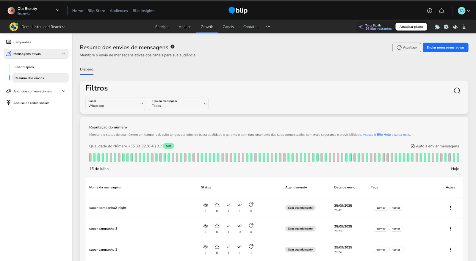 [BETA] New Active Messages Sending Experience in Blip Marketing October 28, 2025 15:22 Updated Index: How to send mass messages in the new Blip Marketing experience How to track the delivery of active messages How to monitor the health of your WhatsApp number With Blip’s Active Messages tool, you can create campaigns and communicate proactively with your contacts on WhatsApp.To send this type of message on WhatsApp, you must use Message Templates, which need to be pre-approved by Meta, and ensure the WhatsApp channel is correctly connected.Tutorial | How to create and approve a Message Template on WhatsAppStarting from October 14, 2025, the platform will release the beta version of our new active message sending flow. Based on research and interviews with our clients, the experience has been completely redesigned and consolidated into a single configuration page.This advancement is a key step to make the sending process more fluid, intuitive, and secure. What has changed in active message sending?The new experience was designed to optimize your time and ensure campaign accuracy, with highlights including:Speed and efficiency: Fewer steps streamline configuration.Clarity and security: More focus on mandatory fields and options to reduce errors.Optimized template selection: New organization of templates to improve loading time and search management.The sequence of steps now reflects the natural logic of campaign planning: first, you decide who to talk to (Audience), then decide what to say (Message Template), and finally, how to control delivery (Name, Routing, and Sending Type).This makes the configuration process a mirror of your marketing strategy. Beta eligibility and scopeThe new active message sending experience will be released in Beta phase and therefore has specific scope and requirements. Initially, the new flow will only be available for mass sending.It’s important to note that access is exclusive to clients with the Blip Marketing feature enabled in their account. If you do not meet these requirements, you will continue using the regular Growth configuration flow.We recommend contacting our sales team for more details about the Blip Marketing hub. How to send mass messages in Blip MarketingAccess the Active Campaign (Growth) menuWhen accessing Blip, locate the Smart Contact you want to use for sending active messages.Then click the three dots in the top menu, select Blip Marketing, and access the Create Sending option.Select WhatsApp as the channel for the next step. Configure your mass active message sends Choose the sending typeBefore filling out the fields, define in the “Sending Type” field the type of send: mass or individual.For now, only the Mass option is available for sending to a contact list.Audience managementIn this step, you define who will receive the message.Unlike the Growth flow, audience management is anticipated to improve performance and follow a more intuitive business logic. Prioritizing the audience ensures the security and compliance of your send.Choose your file and click Continue to proceed to the next configuration step. [Click here to learn how to correctly configure your audience file.]After uploading your spreadsheet, it will be analyzed, and a summary will appear on the screen. Warning messages may appear if inconsistencies are found.If the uploaded file has invalid rows, you will receive an alert. You can still continue sending messages, but you must delete and re-upload the file if one of the following occurs:The file contains duplicate fieldsThe number of rows exceeds 10,000 recordsThe file is in an invalid encoding formatConfirm the information and correct inconsistencies before moving to the next section. Define the message template for the sendFor the WhatsApp channel, selecting a Message Template is mandatory. Click Select Template to choose one of your available templates.A modal will open with your templates, including pagination, filter, and search bar.Select the template you want to use and click Next.Notice: Only templates approved by Meta at least 20 minutes in advance will be available for sending.We recommend clicking Refresh to ensure the template list is always up-to-date.After selecting a template, the Message Template section will be completed with your chosen template information, and the language selection field will be unlocked to choose the sending language according to the template.In addition to basic information, we improved the display of recategorized templates. Hover over the info icon to see the recategorization of your template.After selecting the Message Template, a preview of the message will appear on the left side of the screen.For mass sending, the uploaded file from the previous step will be compared to the selected template.The system will check that the spreadsheet fields match the template variables. That is, it checks whether the number of columns in the file is compatible with the number of variables that need to be filled in the template.If any discrepancies are identified, an error alert will appear. Important: For message templates containing media, files hosted on services like Google Drive, OneDrive, etc., cannot be used.These services only provide links to documents, not the actual file.To ensure proper sending, we recommend using:AWS S3File Uploader – extension available in the Blip StoreAfter filling in and making the necessary corrections, go to the next section. Response Routing DefinitionIn the Routing tab, indicate where your audience will be directed within your Smart Contact.You should select the type of routing in the cards — i.e., how your Smart Contact should handle these users.If the selected flow step is Human Support, the option to select which human support flow will receive the contact transfer in Blip Desk will appear. Routing will follow all queue rules established in the chosen human support block.Notice: If no step is selected, responding customers will be directed to