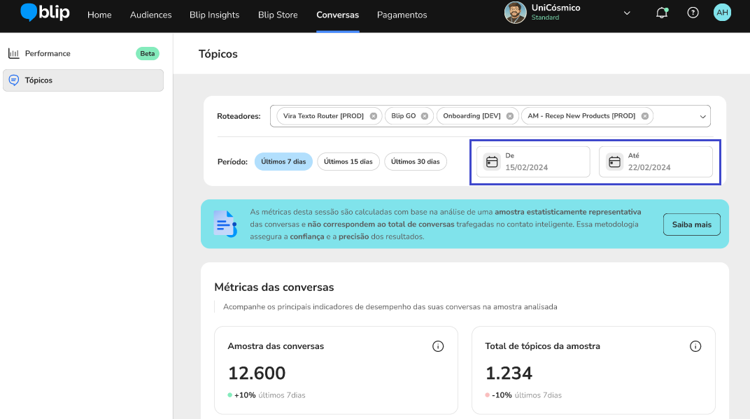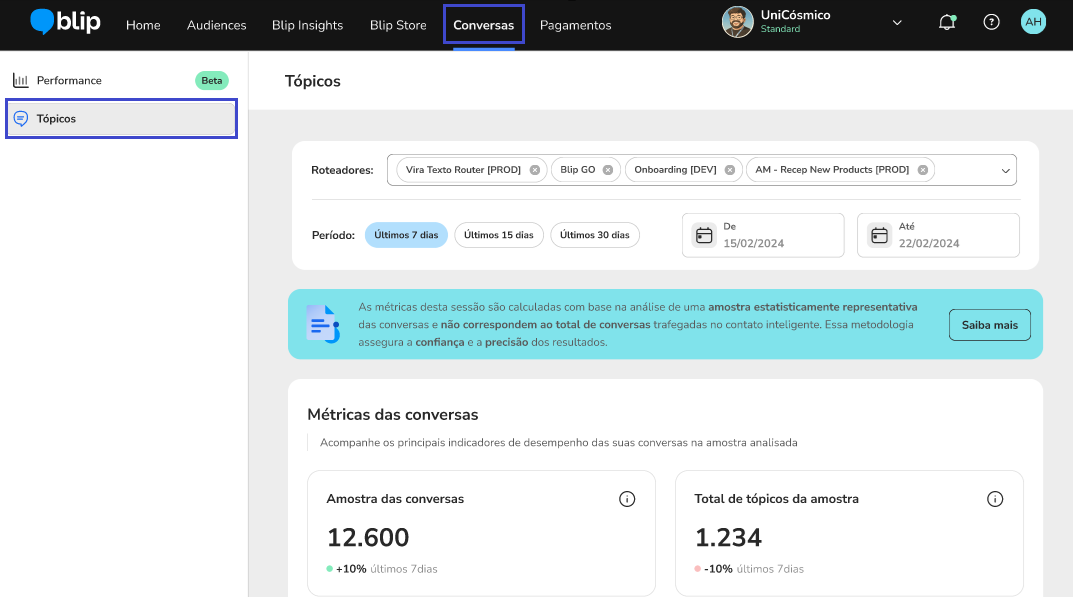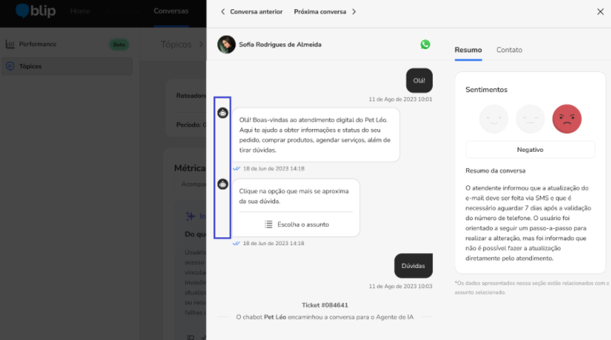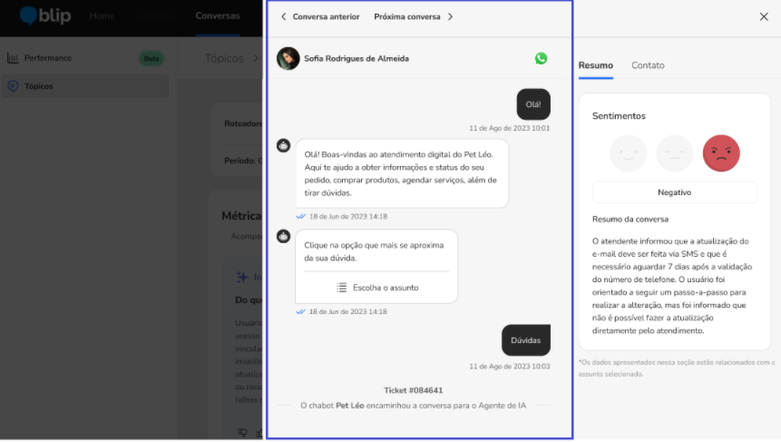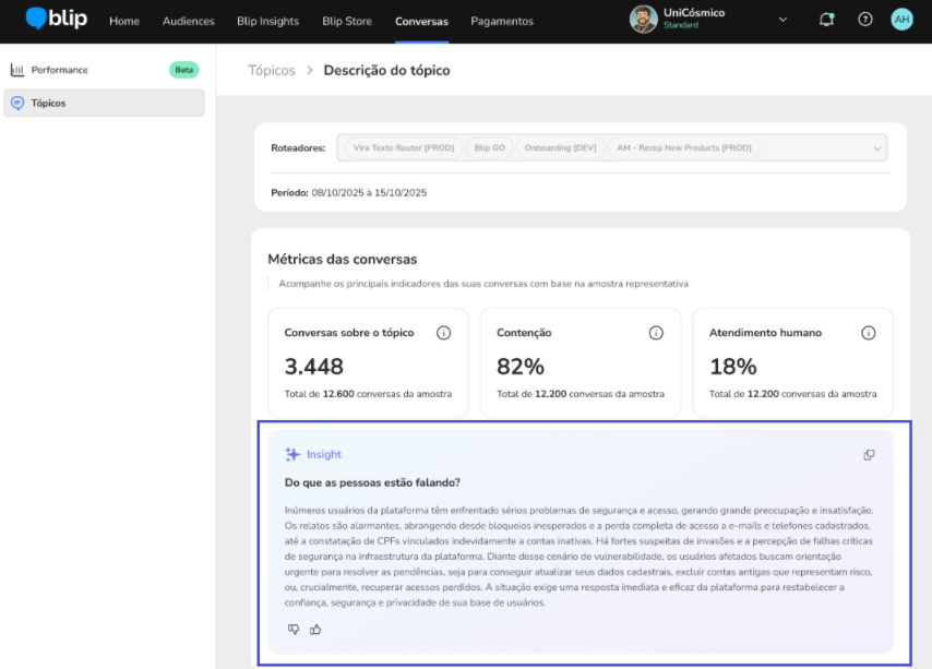 Topic Analysis January 06, 2026 19:34 Updated Improve automatic resolution in conversational flows.Index:IntroductionHow Topics Are GeneratedAccessing Topic AnalysisTopic FiltersUsing Topic AnalysisTopic DetailsExporting ReportsContactsConversation HistoryAdditional InformationIntroductionManaging all the conversations that happen every day in an Intelligent Contact can be complex, especially when you combine AI Agents, deterministic flows (Builder), and human service (Desk). Manually reviewing each interaction is not feasible, and the variety of available reports can make decision-making harder.With that in mind, we created the Topics feature, a tool that automatically identifies the main themes users talk about during conversations with your Intelligent Contact. The analysis is based on a statistical sample of conversations that reliably represents all users and considers every type of automation: Agent, Builder, and Desk with human agents.With this feature, you can understand which subjects are most frequent, where automatic resolution is failing, and when it is necessary to hand off to humans. This allows you to act more strategically to optimize your brand’s conversational experience, using a continuous improvement approach. How Topics Are GeneratedThe Topics Analysis uses clustering algorithms with Machine Learning to identify recurring themes in conversations. The analysis takes into account:messages sent by the user;responses generated by automations (AI Agents, Builder flows, human agents);the context of the conversation within an inactivity window of up to 4 hours.The themes are grouped by similarity, which provides a clear view of the main subjects that emerge over time. A single conversation may cover more than one topic.To generate these insights, the Topics Analysis does not process 100% of all conversations, but rather a representative sample.We use statistical sampling techniques that split the conversations into two main groups (with handoff to a human agent and without handoff) and select an appropriate number of dialogues in each group.This ensures that the results reflect the real behavior of the whole base, allowing comparisons such as:differences in sentiment between conversations with and without handoff;most frequent topics in each type of service.In simple terms: you don’t need to review every single conversation to get a reliable view of the main topics.Note: A conversation is defined as a continuous session that remains active as long as there are message exchanges between the user and the bot. The conversation is considered finished when there is a period of 4 hours with no interaction from either side.Accessing Topic AnalysisTo access the Topic Analysis for conversations, follow the path:Navigation: Conversations > Topics Topic FiltersFilter Topics by DateClick the date dropdown menu.Set the desired date range or manually enter the start and end dates.Click Apply.This filter lets you customize the analysis period using a calendar selector. By default, it is set to the last 7 days.The filter uses the start date of the interaction (whether initiated by the user or the bot) to include the entire conversation in the analysis, from the first message to the last, even if it spans multiple messages or several days, until it is closed by the 4-hour inactivity window.Filter Topics by PeriodClick the period dropdown menu.Select a predefined range (e.g., Last 7 days, Last 15 days, or Last 30 days).By default, the filter is always set to the last 7 days. Using Topic AnalysisOn the main Topics screen, you will see a list of the most frequent subjects found in your conversations. This list is ranked based on two main aspects:Conversation volume: How many sessions had that topic identified.Human escalation: How often those sessions needed human support.With this view, you can quickly spot bottlenecks and improvement opportunities in any part of your operation: knowledge base, Builder flows or human service performance.Key DefinitionsTopics: Topics are automatically generated labels that represent what was discussed in the conversation. They are created by a Machine Learning model based on a statistically representative sample of conversations.A single conversation can have one or several topics, depending on what the user and the bot talked about during the session.Example of ApplicationIf the topic “Delivery time” appears with high volume and handoffs, this may indicate:Lack of content in the Agent automation: The knowledge base or flow needs to be updated to include this type of answer.orComplex topic: It may be better handled by humans. Adjust the redirection rule by intent and keywords.orAdjustment to the guidelines: The prompt needs to be revised to better handle this topic. Sorting the ListYou can organize the list of topics according to the available columns, making data analysis easier. Follow the steps below to sort the list:Identify the column you want to sort: The columns can include information such as conversation volume, human handoffs, among others.Click the column header: Each column header allows you to sort the list; just click the name of the desired column.Adjust the sorting as needed: When you click a column header once, the list will be sorted in ascending order (A–Z or smaller to larger). Clicking again, the list will be sorted in descending order (Z–A or larger to smaller).Browse through the list pages: If there are more items than can be displayed on a single page, use the pagination controls at the bottom to navigate between the pages of the list. Topic DetailsWhen you click the “Open topic” button next to any topic in the list, you will be redirected to the detail page for that topic. On this page, you can:Topic summary: Shows, in a sentence of up to 500 characters, what users talk about the most regarding this topic. When there is not enough information in the dialogue to generate this summary, the field does not appear on the scr