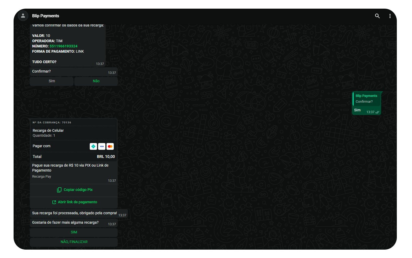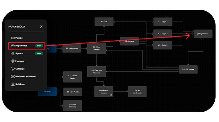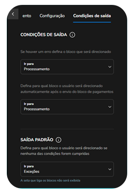 Creating Payment Flows in Studio with the Payment Block March 24, 2026 11:48 Updated Introduction: Speeding Up Your Sales Creation and Configuration of the Payment Block Block Exit Conditions What are you building here? What does your customer see on WhatsApp? Available Channel: WhatsApp Introduction: Speeding Up Your SalesBlip's Payment Block is the platform's native solution for requesting payments efficiently. It allows you to configure payment methods such as PIX Copy and Paste, Boleto, and Payment Link, in addition to detailing the products sold, all within your flow in Blip.What does your customer receive? Your customer receives a complete and easy-to-understand payment message on WhatsApp, containing: Name and description of the products or services. Exact order value. Available payment methods. A personalized message. Creating and Configuring the Payment BlockConfiguring the block is a structured process in three main steps within the Studio:1. Add the Payment Block Access your bot's Studio (the flow editor). Click New block and select the Payment option. The block will be inserted into the flow and must be connected at a logical point in the journey. 2. Configure the Payment Method Important: The payment block only organizes and displays the payment options in the conversation. The generation and processing of the charge are the responsibility of the acquirer or payment institution used. You can use your own providers or integrate Blip solutions, while the block only presents the information within the conversational journey.In this tab, you define the payment options that will be offered to the customer. Payment method: choose between PIX Copy and Paste, Boleto, or Payment Link.During configuration, you can use both static values and flow variables. The use of variables is especially recommended in scenarios where payment data is generated dynamically via API in a previous block (for example, through an HTTP call). This ensures greater flexibility, automation, and integration with external systems, avoiding the need for fixed values in the flow. PIX Copy and Paste Configuration If the selected method is PIX, the following fields will be displayed: Business name: name that will be displayed to the customer (e.g., Blip Payments) or a variable (e.g., {{storeName}}). PIX key type: select CPF, CNPJ, Email, Phone, or Random key; this is a fixed field and cannot be parameterized via flow variable. The selection must be made manually in the block configuration. PIX key value: Enter the data corresponding to the type (Remember: if it is CPF or CNPJ, it must be valid) or use a variable. PIX Copy and Paste code: enter the Copy and Paste code generated by your bank manually or use a flow variable if the code is generated dynamically. Boleto Configuration If the selected method is Boleto, the following fields will be displayed: Boleto code: provide the barcode of the boleto. This field can be filled in manually or through a flow variable, if the boleto is generated dynamically (e.g.: {{codeBoleto}}). Payment Link Configuration When selecting Payment Link, you will be able to provide: A fixed or dynamic HTTPS link. Accepts flow variable, ideal when the backend generates a personalized link for each customer. Example: {{paymentLink}}. Currently, three payment methods are available for configuration. And it is possible to enable up to two methods in the same block, allowing the customer to choose the most convenient option at the time of purchase. 3. Configure product details Access the Configuration tab and complete: Product type: choose whether it is Digital or Physical. Charge number: can be a fixed value (e.g.: 123456) or a variable that pulls the product ID (e.g.: {{selectedProduct@retailer_id}}). It must be a value with a maximum of 35 characters, and can contain only letters, numbers, and hyphens. Product specifications: provide the JSON Array in the format below: [ { "retailer_id": "123456", "name": "Item name", "amount": { "value": 1000, "offset": 100 }, "quantity": 1 } ] Within the field related to the product, it must return exactly in this format so that the payment block interprets the data correctly. To generate this JSON, a script can be used (executed in the block prior to the payment block) and the script's output variable should be provided, or the JSON Array can be entered directly into the field. Generally, the script path is used, especially when the selection of products and prices is dynamic. It is permitted to provide more than one item in this Array, as long as the JSON formatting for each item is respected. Adding multiple products dynamically When the user can select more than one product throughout the conversation, an alternative is to use an accumulator script executed at each selection that keeps the product array updated between interactions. The logic works as follows: At each selection, the script checks if the product already exists in the array by name. If it already exists, it increments the quantity (quantity). If it is new, it adds the item to the array with quantity: 1. function run(selectedMenuOption, selectedProducts) { try { selectedMenuOption = JSON.parse(selectedMenuOption); let currentProducts = []; if (selectedProducts) { const parsed = typeof selectedProducts === "string" ? JSON.parse(selectedProducts) : selectedProducts; currentProducts = Array.isArray(parsed) ? parsed : parsed.products || []; } const existingProductIndex = currentProducts.findIndex(product => product.name === selectedMenuOption.name ); const productMap = { "id_produto_1": { retailer_id: "123456", name: "Item name 1", description: "Item description 1", price: "10.00", amount: { value: 1000, offset: 100 } }, "id_produto_2": { retailer_id: "789012", name: "Item name 2", description: "Item description 2", price: "20.00", amount: { value: 2000, offset: 100 } }, "id_produto_3": { retailer_id: "345678", name: "Item name 3", description: "Item description 3", price: "30.00", amount: { 