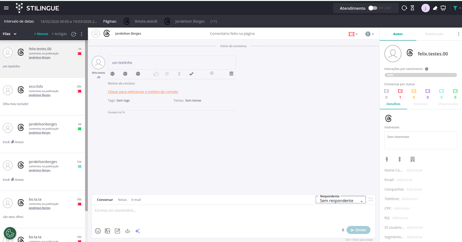 Threads is a specific collection channel for the response and analysis area of STILINGUE Smart Care. Therefore, for an interaction to be collected, the user must comment on a post of the connected page directly on Threads.