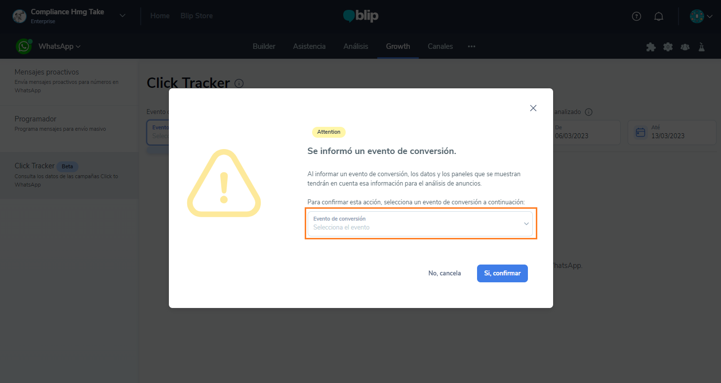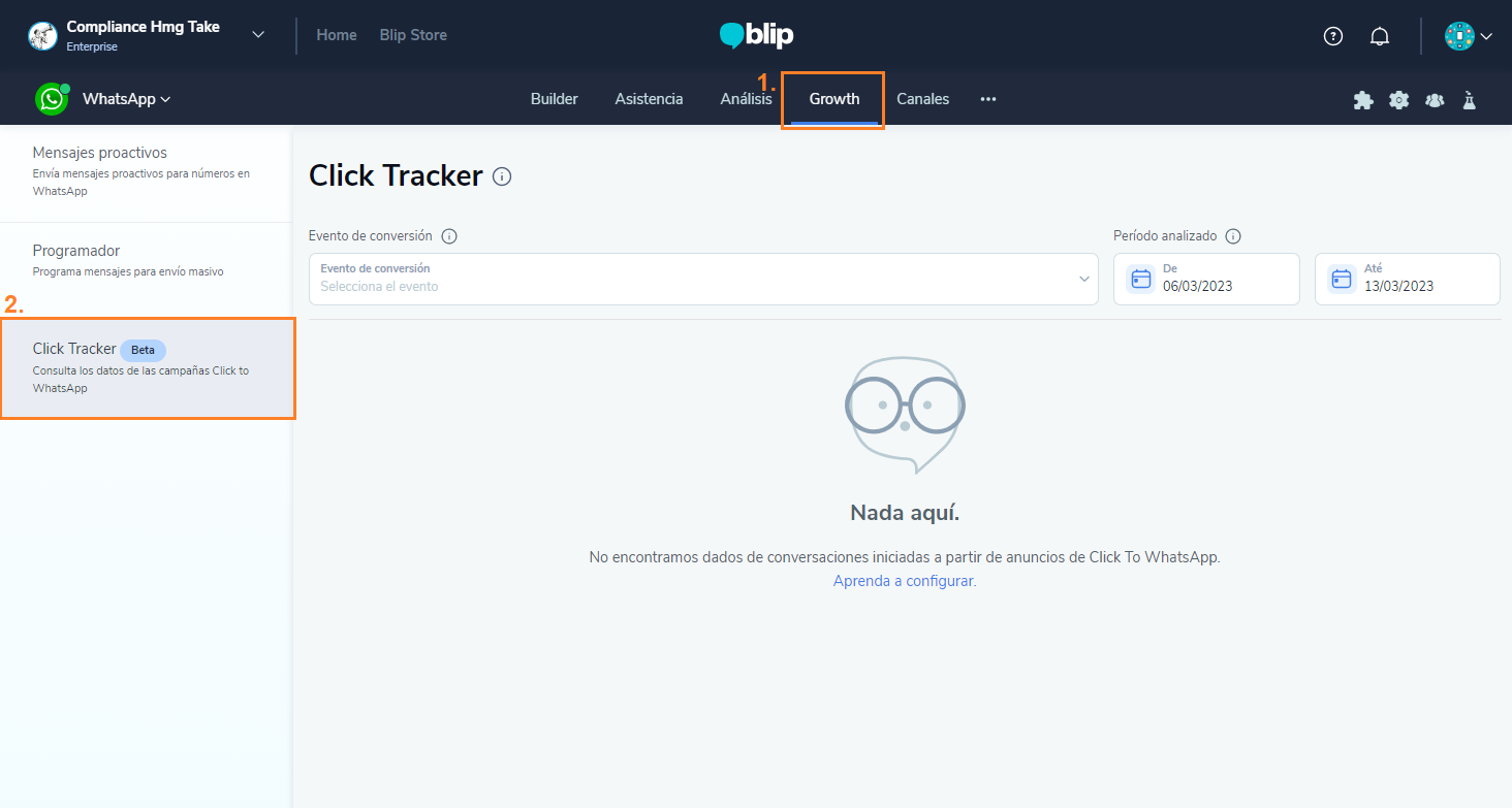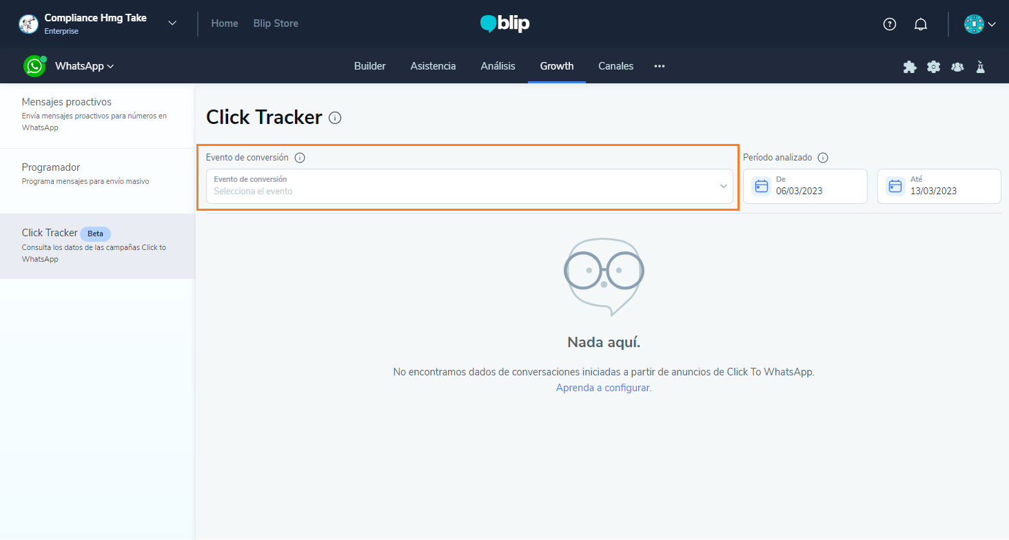 Cómo utilizar el Click Tracker para saber cuál anuncio 'Click to WhatsApp' es el mejor para tu negocio. 11 de marzo de 2026 20:03 Actualización Índice: ¿Qué es Click to WhatsApp y cómo puede ayudar a tu negocio? ¿Qué es el rastreador de clics? Cómo acceder al rastreador de clics Cómo establecer el punto de conversión con Click Tracker Para integrar el Click Tracker con la API de Marketing Cómo realizar un seguimiento del rendimiento de sus anuncios con Click Tracker Cómo contabiliza las conversiones Click Tracker Reglas para el análisis de datos en Click Tracker Aprende en este tutorial paso a paso cómo configurar el Click Tracker en tu bot. Con esta funcionalidad, podrás analizar el recorrido de tus usuarios a partir de los anuncios Click To WhatsApp en el flujo conversacional, entender el rendimiento de cada una de tus comunicaciones para dirigir mejor tus inversiones en medios, optimizando la adquisición de clientes potenciales y la conversión de usuarios en WhatsApp. ¿Qué es Click to WhatsApp y cómo puede ayudar a tu negocio?El Click To WhatsApp es una funcionalidad de WhatsApp que permite vincular anuncios de Facebook e Instagram con el número de WhatsApp de la empresa. Es decir, cuando los usuarios de ambas redes sociales navegan por el sitio o la aplicación, pueden hacer clic en un anuncio y ser dirigidos directamente a entablar una conversación con la empresa.Los anuncios Click To WhatsApp son una excelente opción para que las marcas acorten el recorrido con los clientes. Con estos anuncios, es mucho más fácil para los clientes descubrir que pueden conectarse contigo a través de WhatsApp, lo que potencia la retención, el compromiso y genera valor a través de las conversaciones.Para obtener más detalles sobre cómo crear un anuncio Click To WhatsApp, haga clic aquí ¿Qué es el rastreador de clics?Con el Click Tracker, puedes analizar el recorrido de tus usuarios a partir de los anuncios Click To WhatsApp en el flujo conversacional. De esta manera, comprendiendo el rendimiento de cada una de tus comunicaciones, podrás dirigir mejor tus inversiones en medios, optimizando la adquisición de clientes potenciales y la conversión de usuarios en WhatsApp.El Click Tracker recopila automáticamente los datos de interacción de los usuarios con los anuncios y genera análisis de rendimiento personalizados para ti, teniendo en cuenta las particularidades de tu contacto inteligente y lo que tu marca define como punto de conversión.Además, gracias a la integración con la API de Marketing de Meta, el Click Tracker enriquece tus análisis y te permite comprender el costo de tus anuncios, las conversaciones iniciadas y las conversiones generadas, para que puedas tomar decisiones más inteligentes y potenciar tu negocio. Cómo acceder al rastreador de clicsPara acceder al Click Tracker y encontrar los análisis de rendimiento de tus anuncios Click To WhatsApp, haz clic en la pestaña GROWTH y selecciona la opción CLICK TRACKER en el menú lateral izquierdo. Cómo establecer el punto de conversión con Click TrackerPara analizar el rendimiento y el impacto generado por tus campañas Click To WhatsApp, es fundamental comprender cuántas conversaciones iniciadas a partir de los anuncios llegan al punto de conversión de tu contacto inteligente.Dado que Blip te permite crear contactos inteligentes altamente personalizados, es necesario informar cuál es el punto de conversión del chatbot, definido por la categoría de un registro de evento.En la pantalla del Click Tracker, en la parte superior, encontrarás un campo para seleccionar y definir una categoría de registro de evento como punto de conversión. Después de hacer clic en el campo de selección, verás un modal en la pantalla que indica la importancia de esta acción. La definición de este evento de conversión es crucial para el cálculo de las conversiones de tus usuarios que hicieron clic en los anuncios tipo Click To WhatsApp y alcanzaron el punto de conversión definido por el evento seleccionado.Elige entre las categorías de registros de eventos disponibles aquella que mapee el paso de tu usuario por el punto de conversión de tu contacto inteligente. En otras palabras, selecciona el registro de evento que indica que tu usuario ha alcanzado el PUNTO DE ÉXITO o el OBJETIVO de tu contacto inteligente.Una vez que confirmes tu elección, Blip comenzará a contabilizar la conversión de tus anuncios Click To WhatsApp considerando el registro de evento seleccionado. Los datos anteriores a la selección del evento de conversión no serán contabilizados como conversiones de los anuncios.Tendrás la opción de editar el evento de conversión seleccionado. Solo tienes que hacer clic en el nombre del registro de evento actual y se abrirá un modal para que elijas una nueva categoría de registro de evento. El total de conversiones se calculará sumando las conversiones contabilizadas con los registros de eventos antiguos y el actual. Es decir, las conversiones contabilizadas considerando registros de eventos anteriores no se perderán.Para obtener más detalles sobre cómo crear un registro de eventos en su Smart Contact, haga clic aquí. Para integrar el Click Tracker con la API de MarketingPara que puedas entender el retorno generado por tus anuncios Click To WhatsApp, es necesario que puedas medir la inversión realizada en la distribución de tus anuncios en las redes sociales y cómo esto se refleja en los costos de conversaciones iniciadas y conversiones en el flujo conversacional.Los datos de inversión de los anuncios se importan desde la API de Marketing de Meta, y para que puedas acceder a estos datos directamente en el Click Tracker, necesitarás compartir con Blip un token de lectura de estos datos.Para realizar la integración del Click Tracker con la API de Marketing, haz clic en "Conectar token" para abrir el modal de conexión del token de acceso.En el modal, ingresa el Token generado a 