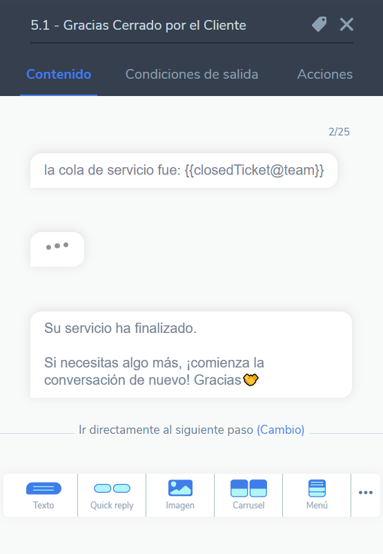 Agora a variável closedTicket podrá ser utilizado de diversas formas sin fluxo do bot, como no exemplo abaixo, onde recupera-se, na aba conteúdo, a fila do last ticket do client fechado.