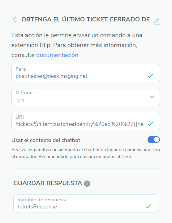 Para obtener el ticket, es preciso agregar una etapa de Processar Comando para el Desk salvando una respuesta en una variable como ticketsResponse y marcar la utilización del contexto del chatbot.
