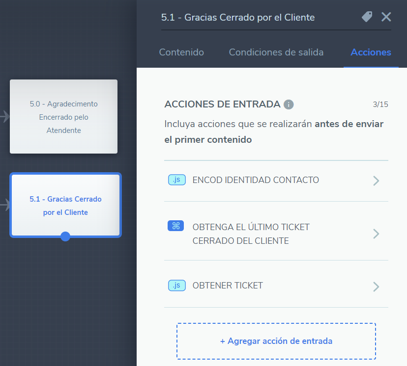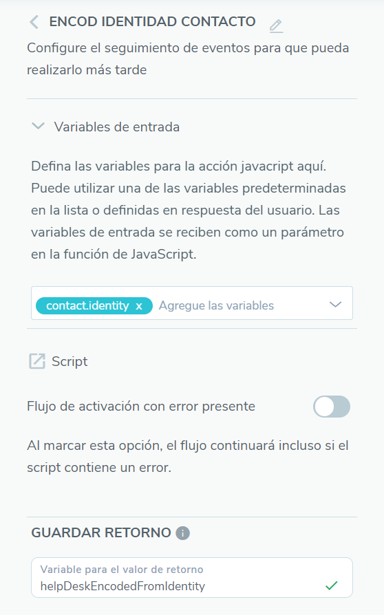 Para que se pueda utilizar la identidad del contacto sin filtrar los tickets a partir de la URL, es preciso agregar una etapa de Executar Script que tenga como Variável de Entrada a la variable contact.identity y Salvar Retorno en una variable como helpDeskEncodedFromIdentity.