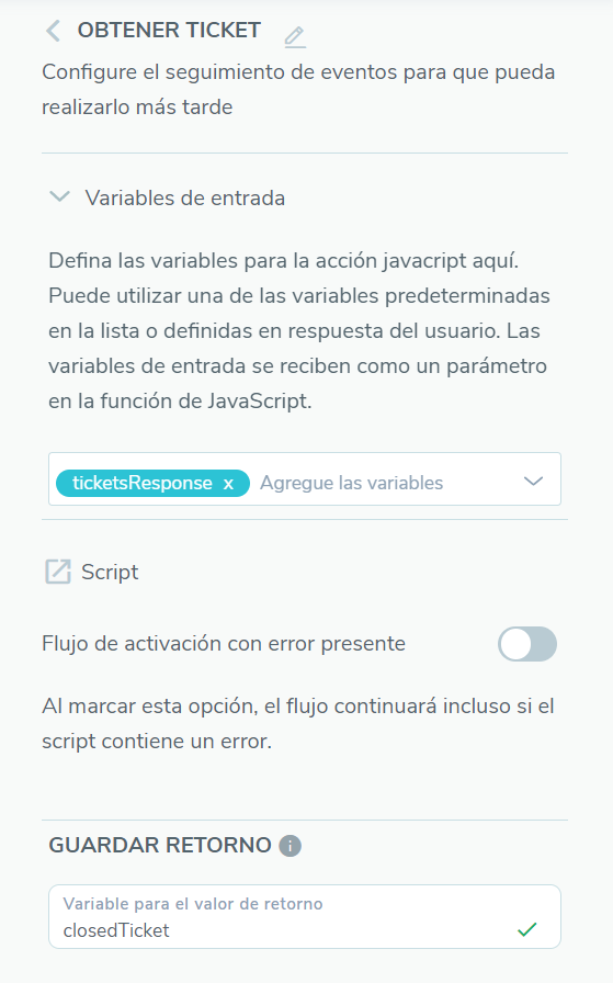 Después de finalizar la obtención del ticket, será necesario tratar o devolver para salvar em uma variável somemente o ticket required. Para isso, basta agregar una etapa de Executar Script con una variable de entrada ticketsResponse y Salvar Retorno em una variable como closedTicket.