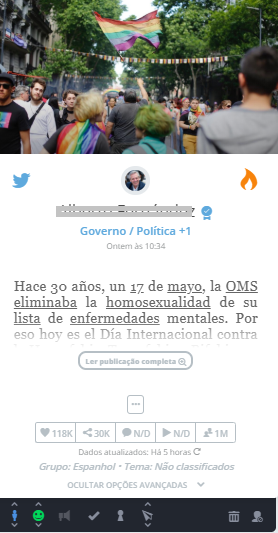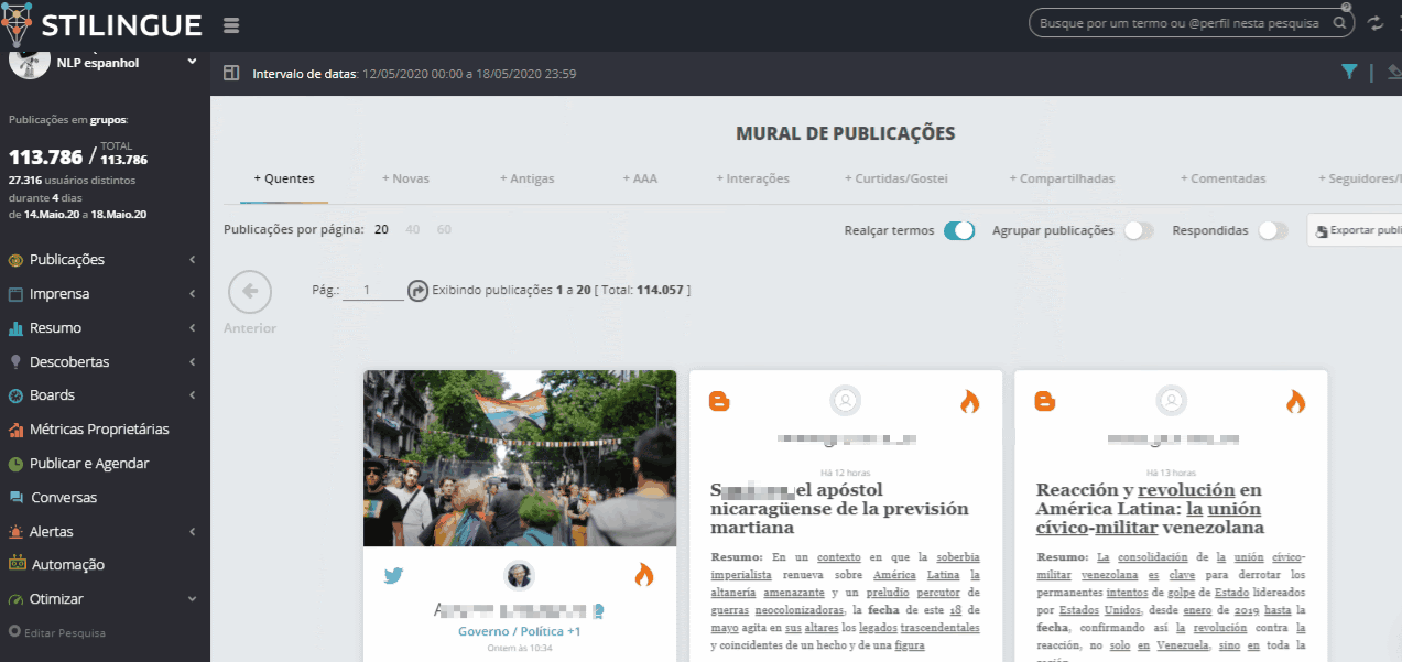 En el Mural, se encontrarán las publicaciones recopiladas según el idioma seleccionado en la Configuración de la Investigación. Puede elegir entre Grupos de recopilación en español, en portugués o ambos, portugués y español. Consulte los detalles en nuestra guía de configuración.