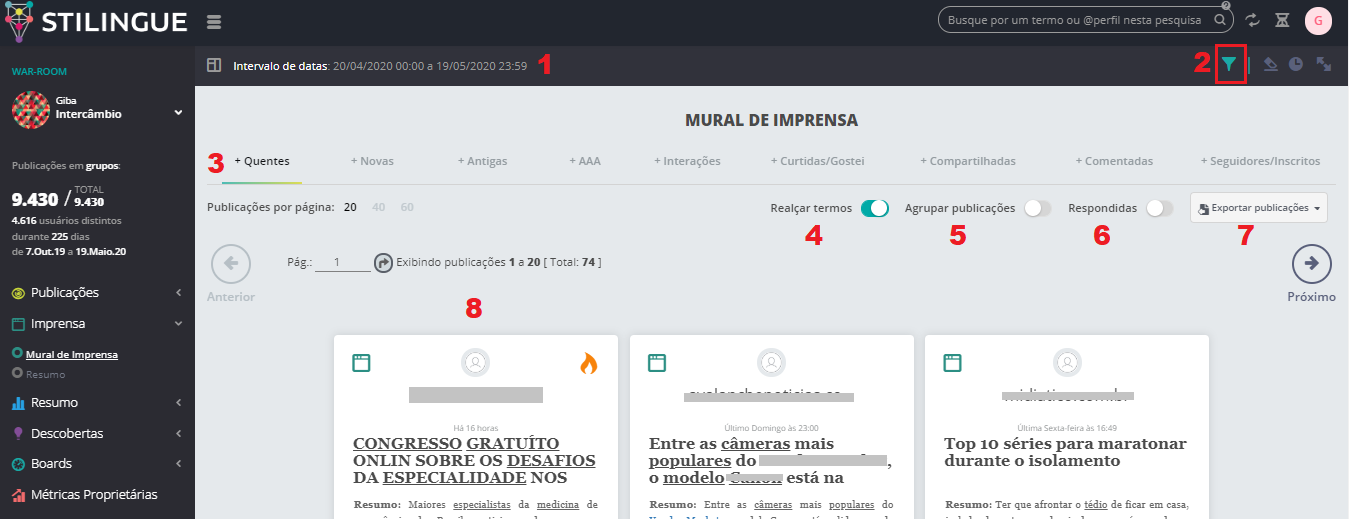 Aquí podrás analizar las fechas de recopilación de las publicaciones disponibles en tu mural. Puedes editar el intervalo de fechas en el filtro de publicaciones (2).