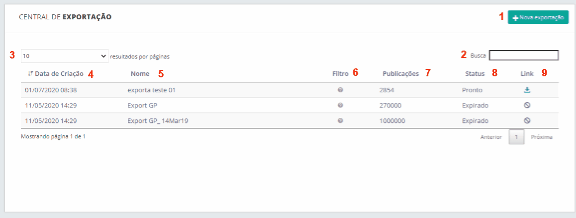 ¡Atención! La Central es una funcionalidad indicada para exportar archivos que tengan un gran volumen de publicaciones. Si el filtro seleccionado tiene hasta 30 mil publicaciones, recomendamos realizar la exportación dentro del Mural de Publicaciones para una operación más ágil.