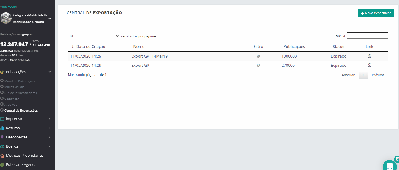 El Mural de Publicaciones permite la exportación de hasta 30 mil publicaciones de tu investigación, pero si tienes un volumen superior para analizar, una opción es utilizar la Central de Exportaciones: de esta manera, puedes exportar hasta 1 millón de publicaciones de una sola vez.