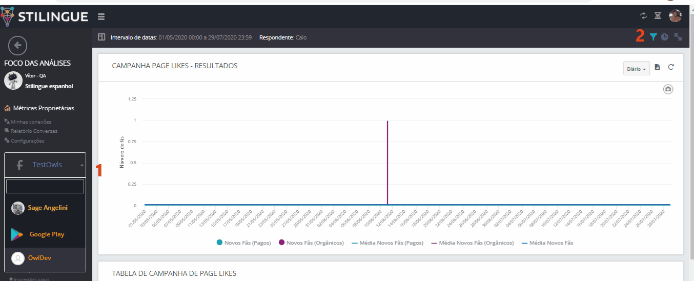 Haz clic en la flecha junto al ícono de las redes sociales, ubicado en el lado izquierdo de la pantalla, y selecciona tu aplicación de Google Play (1). Luego, haz clic en el ícono del filtro, ubicado en la esquina superior derecha (2), para abrir la ventana con el intervalo de fechas y selecciona el período que deseas visualizar.