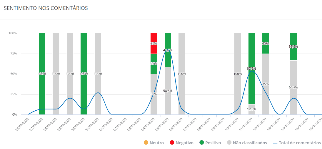 Al acceder al área de Métricas Propietarias, también tendrás acceso a los gráficos de "Sentimiento en los comentarios", que muestra cómo está el sentimiento en los comentarios realizados por usuarios en tus páginas. Para este gráfico, no se consideran los comentarios propios (es decir, de la propia página), solo los comentarios de otros usuarios.
