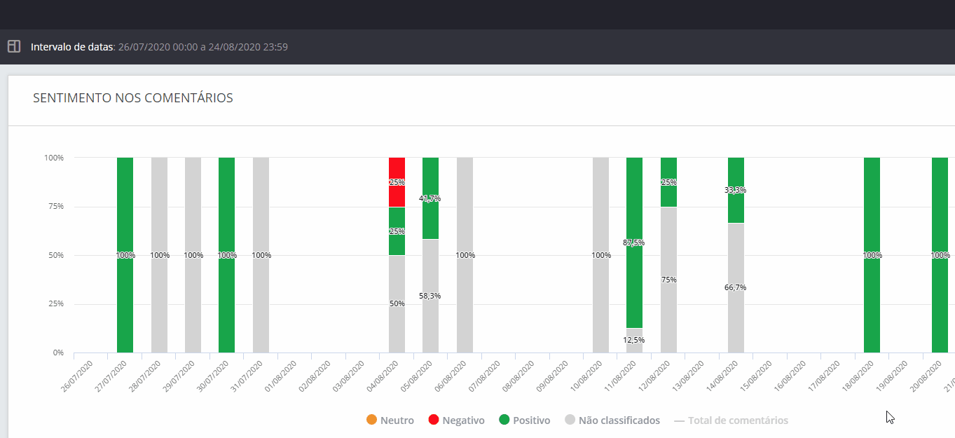 Visualiza los datos del gráfico seleccionando la presentación de la información por día, semana o mes. El período tiene en cuenta la fecha del comentario y no de la publicación.