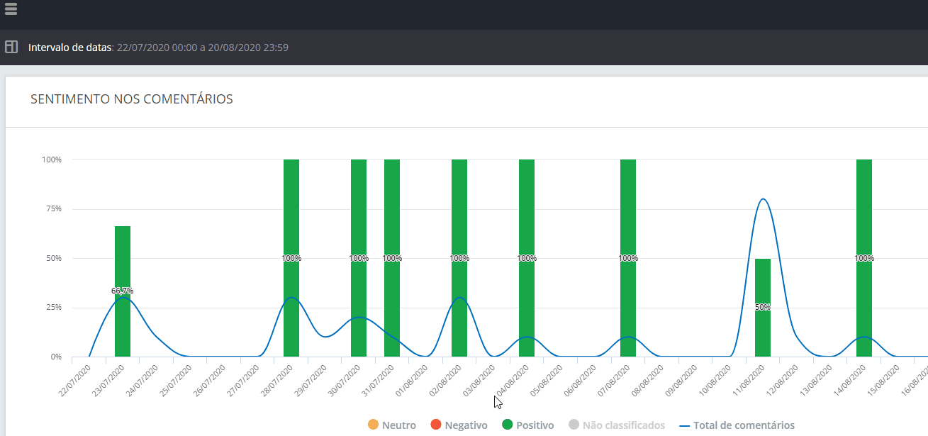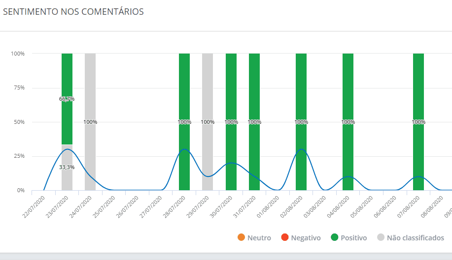 Uno de ellos es "Sentimiento en los comentarios", que muestra cómo está el sentimiento en los comentarios realizados por los usuarios de tus páginas. Para este gráfico, no se consideran los comentarios propios (es decir, de la propia página), solo se tienen en cuenta los comentarios de otros usuarios.