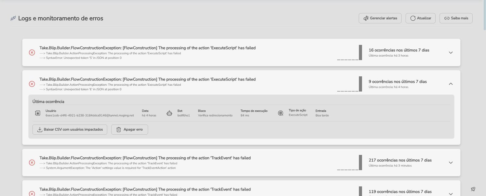 Con la herramienta de análisis y monitoreo de errores de la plataforma Blip, puedes: