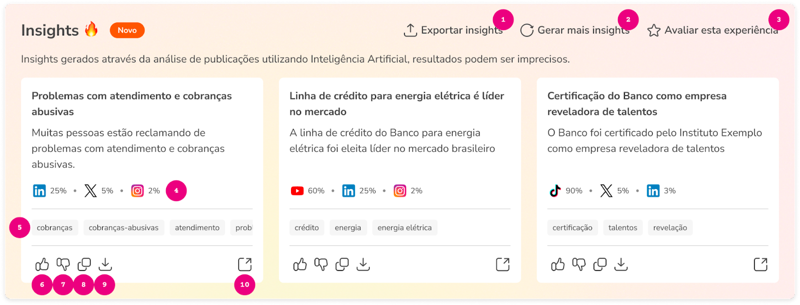 Esta línea, que contiene íconos y porcentajes de las redes sociales, muestra al usuario de dónde son las publicaciones utilizadas en la generación de ese insight.