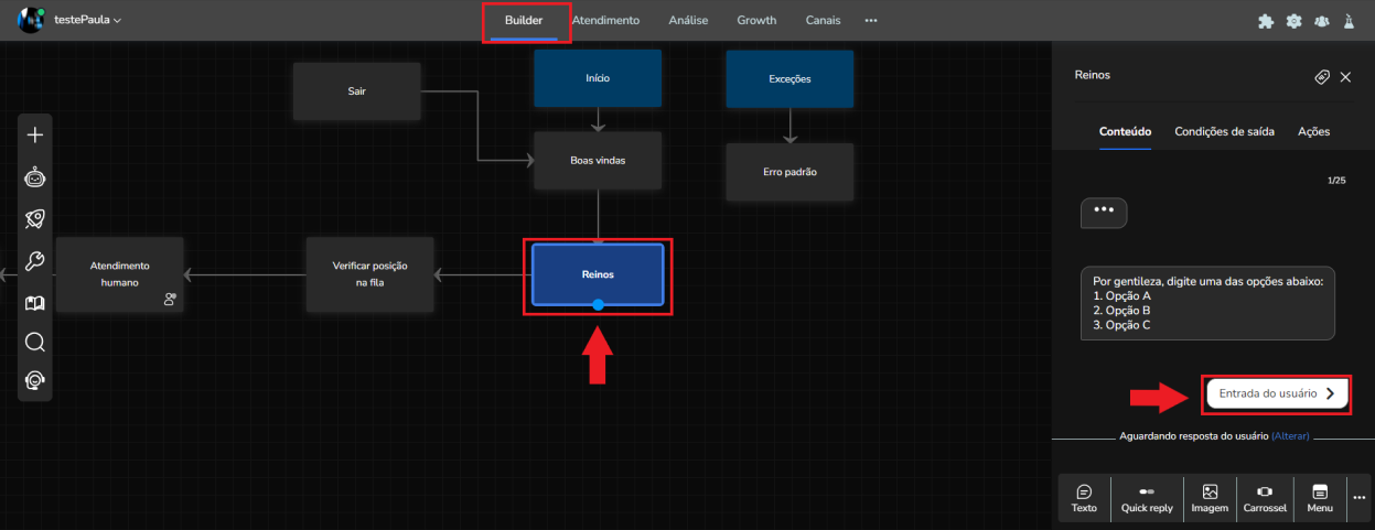1. En el Generador de su bot, vaya al bloque donde desea ver a qué cola se dirigirá el cliente y seleccione "Entrada del usuario".