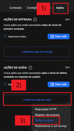 3. Una vez hecho esto, vaya a la pestaña 1) “Acciones” > 3) “Agregar acción de salida” > 4) “Definir contacto”: