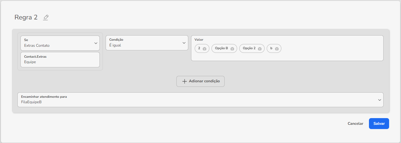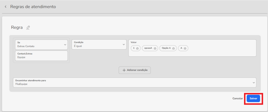 9. Y complételo de la siguiente manera, utilizando el valor previamente ingresado en la Clave en “Contacto.Extras” y reenviándolo a la cola deseada. Luego vaya a "Guardar":