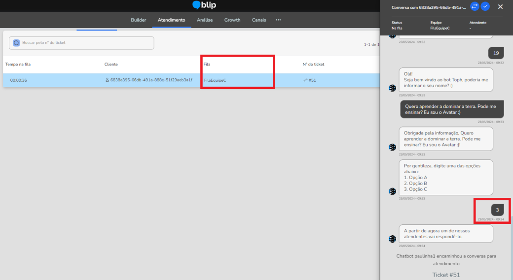 En el siguiente ejemplo, el usuario seleccionó la opción “3. Opción C” y fue dirigido a la cola FilaEquipeC, como se muestra en la impresión: